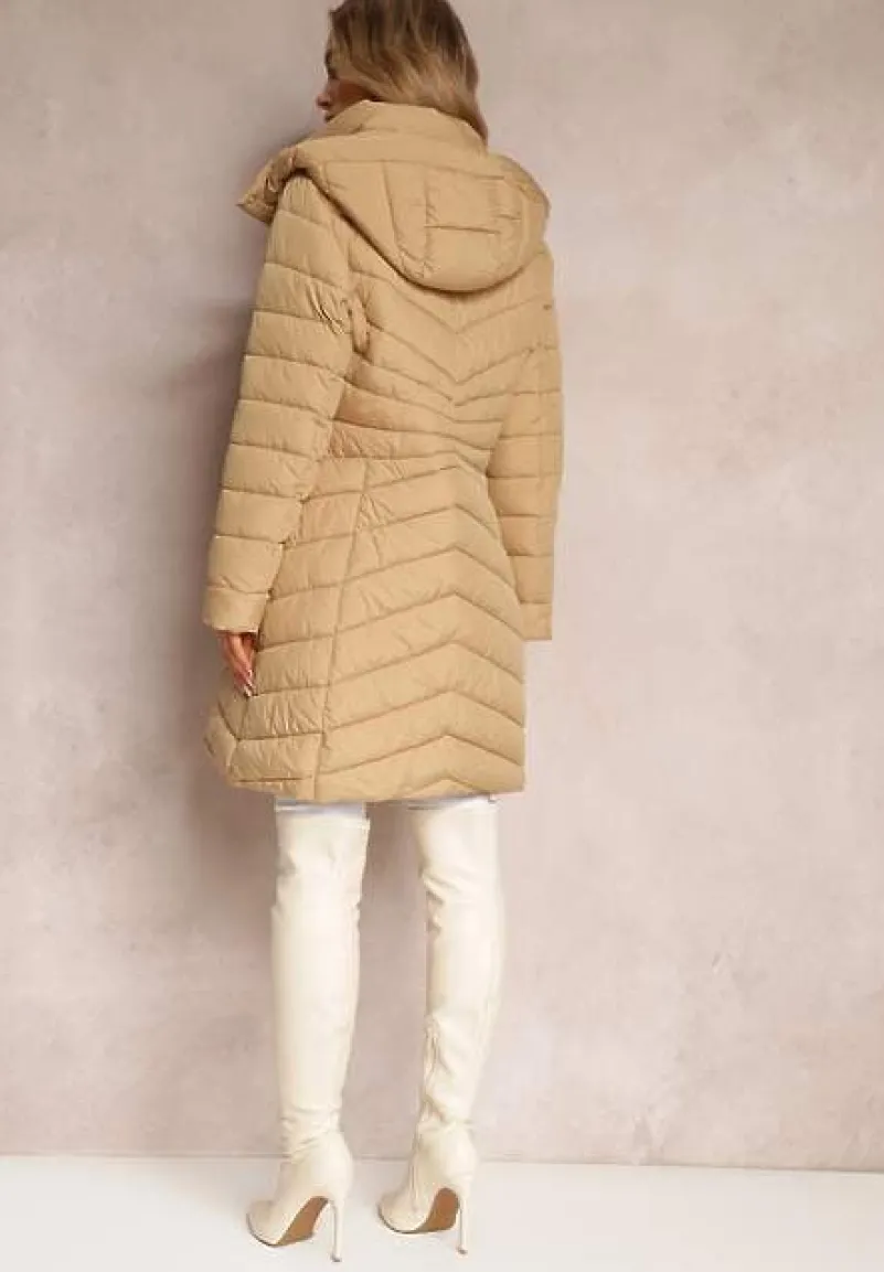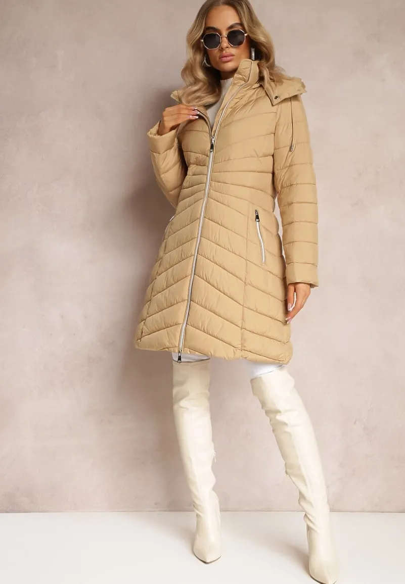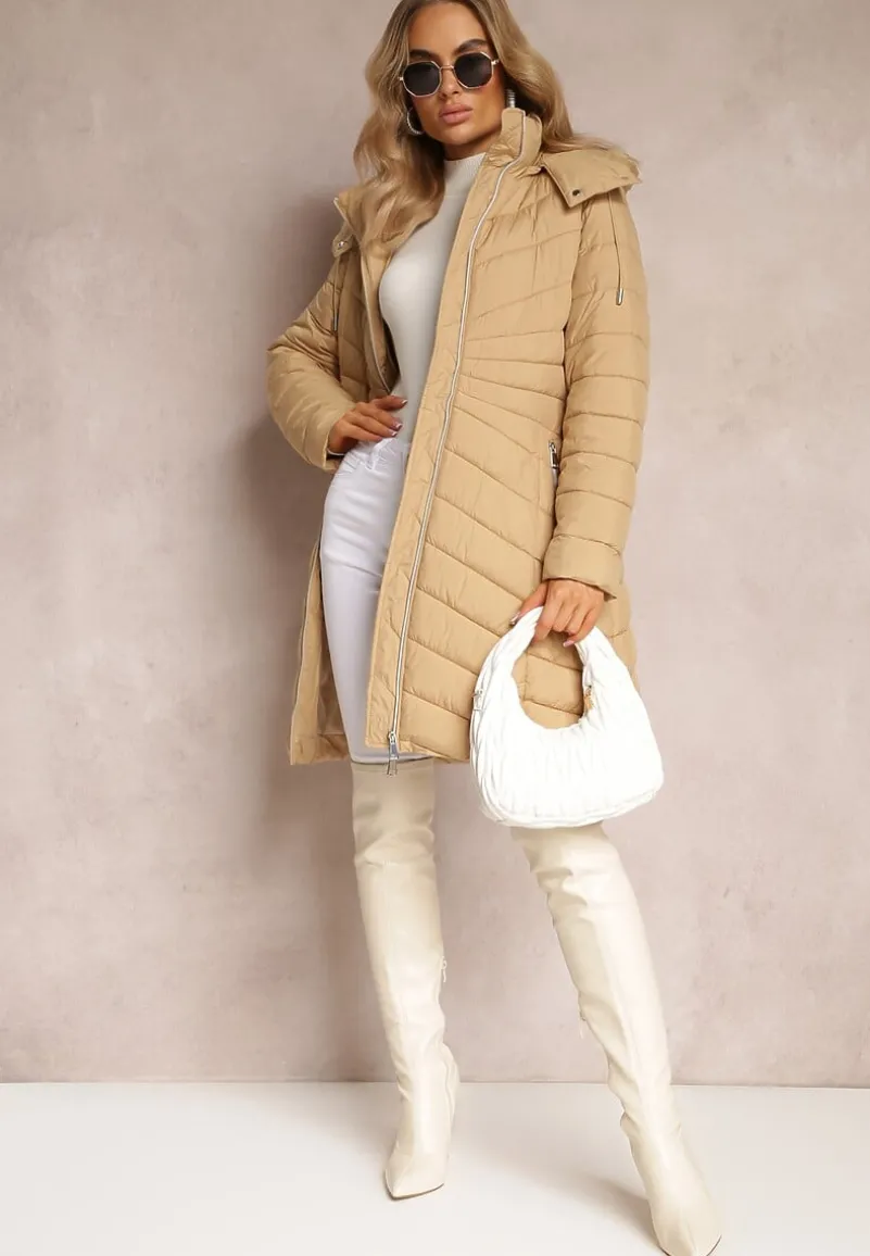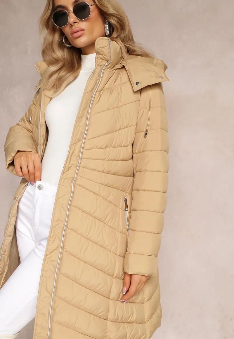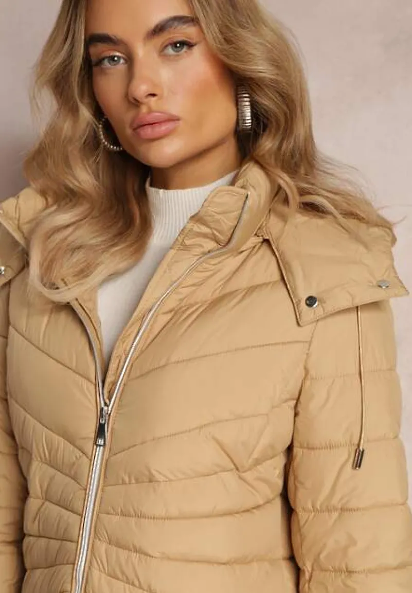 Zimowa kurtka z szerokim kołnierzem i odpinanym kapturem. Na wysokości bioder po bokach znajdują się zasuwane kieszonki.