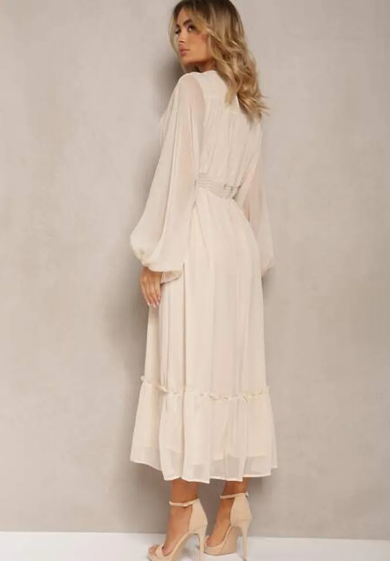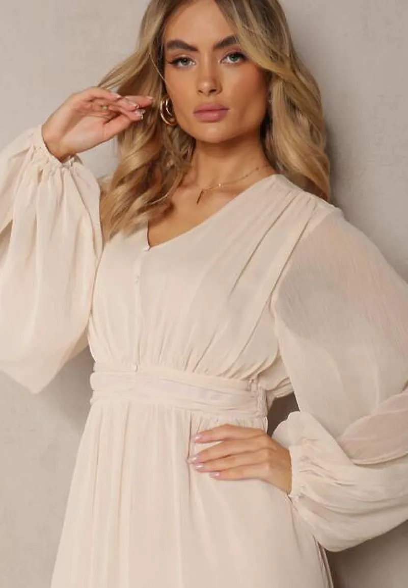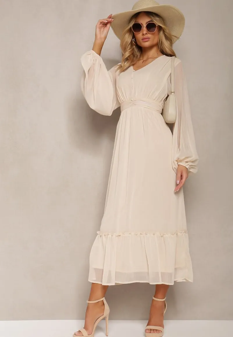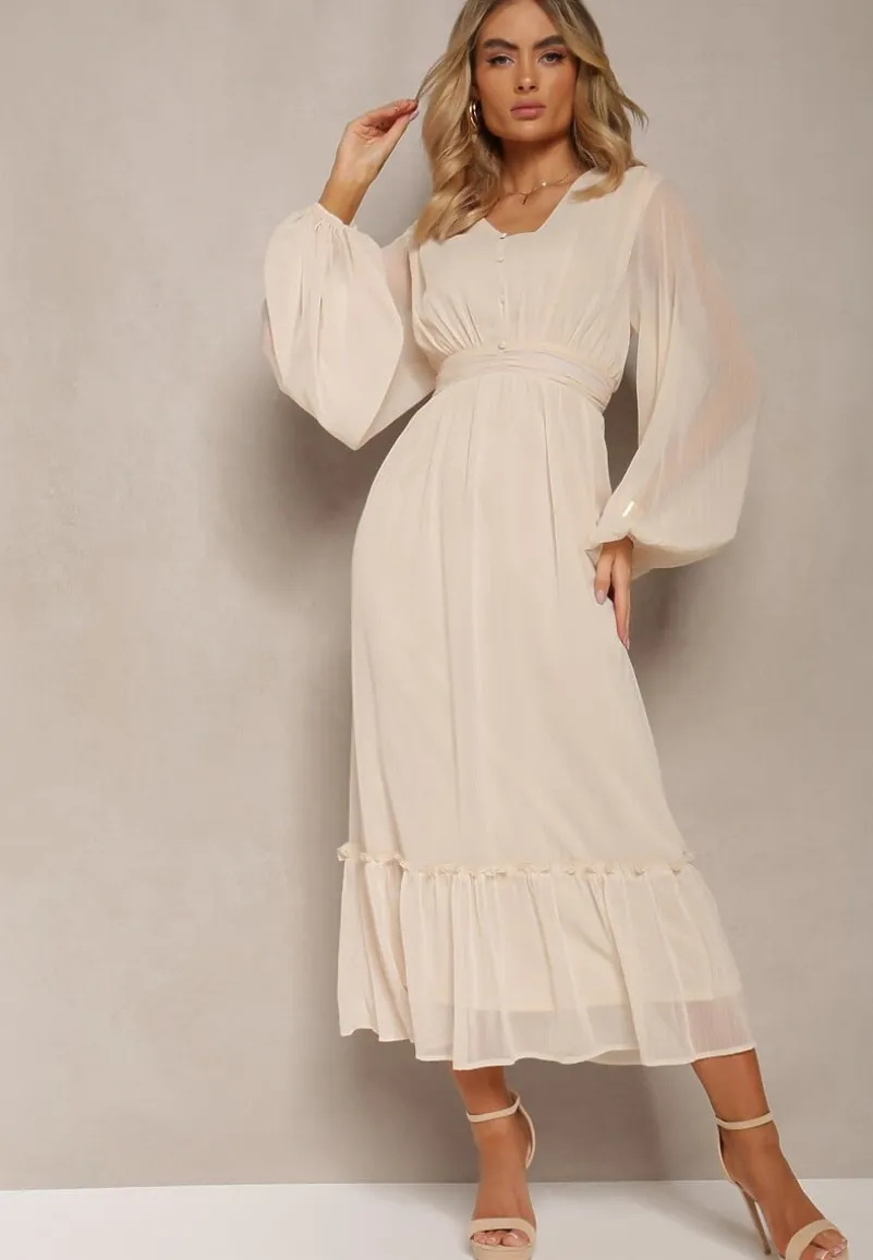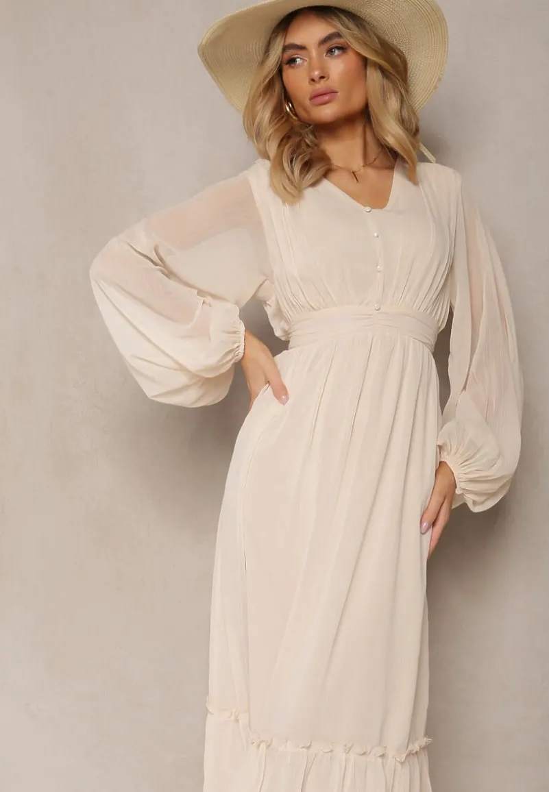 Beżowa Plisowana Sukienka Koktajlowa Ozdobiona Guzikami i Falbankami Osumia