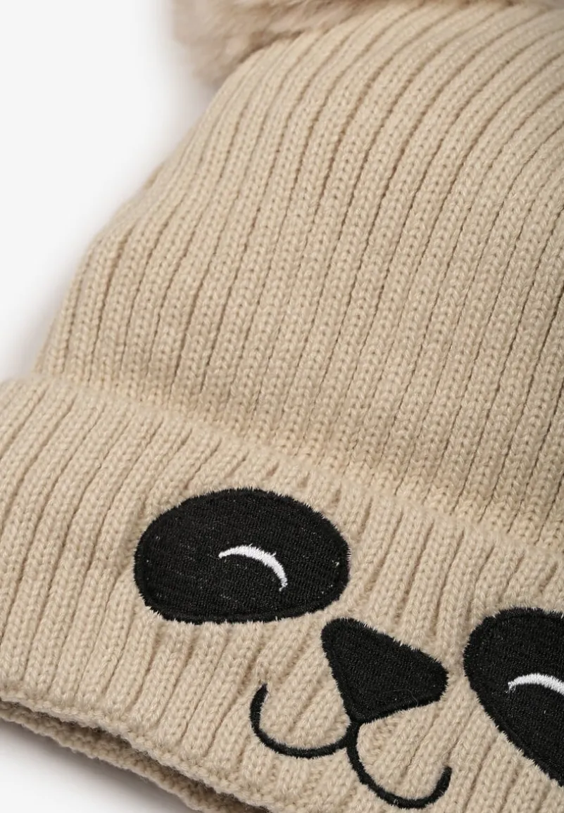 Czapka Shenoy z dwoma pomponami imitującymi uszy i haftowaną buźką misia.