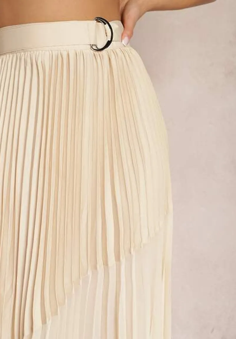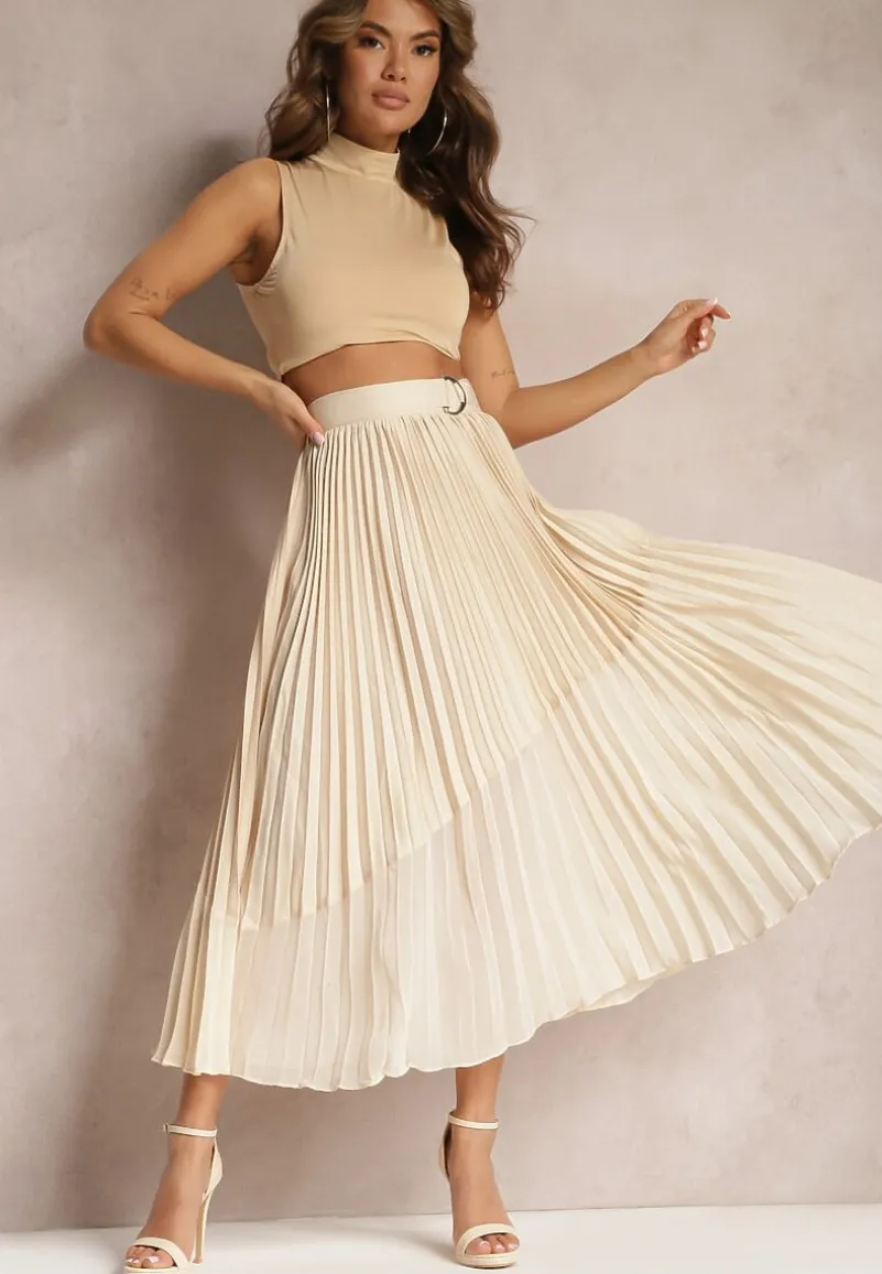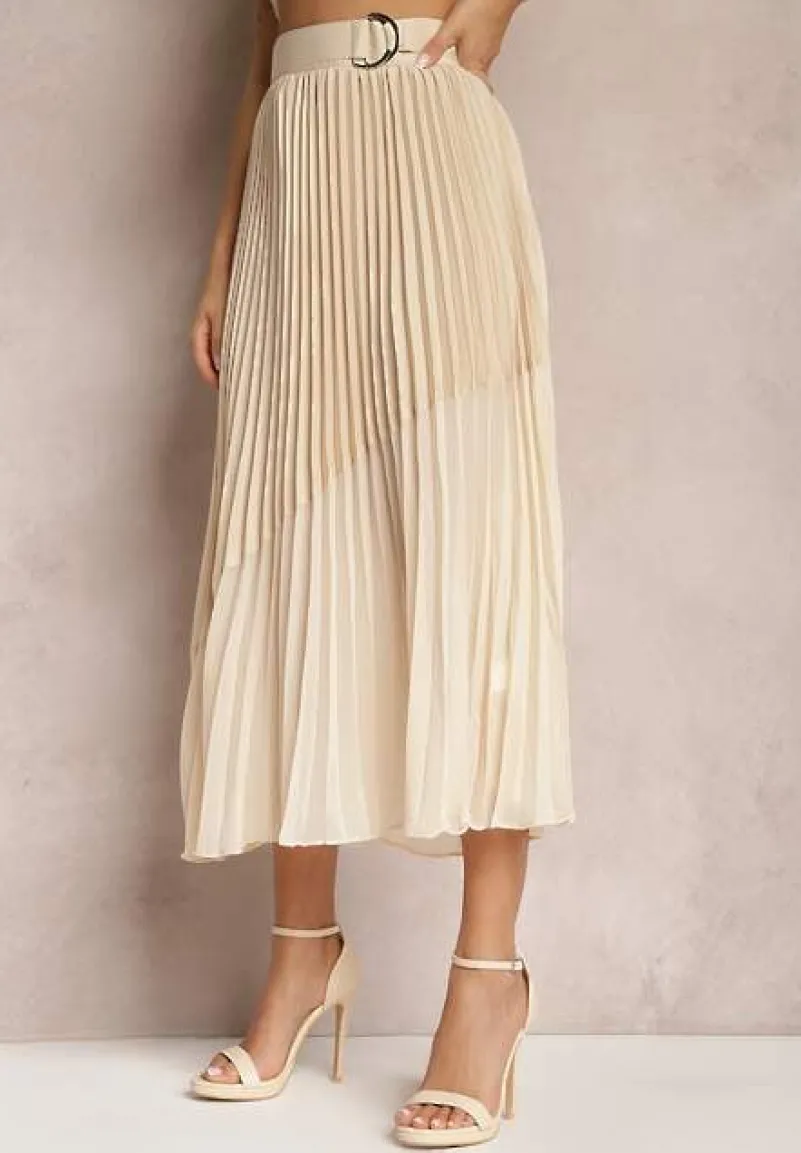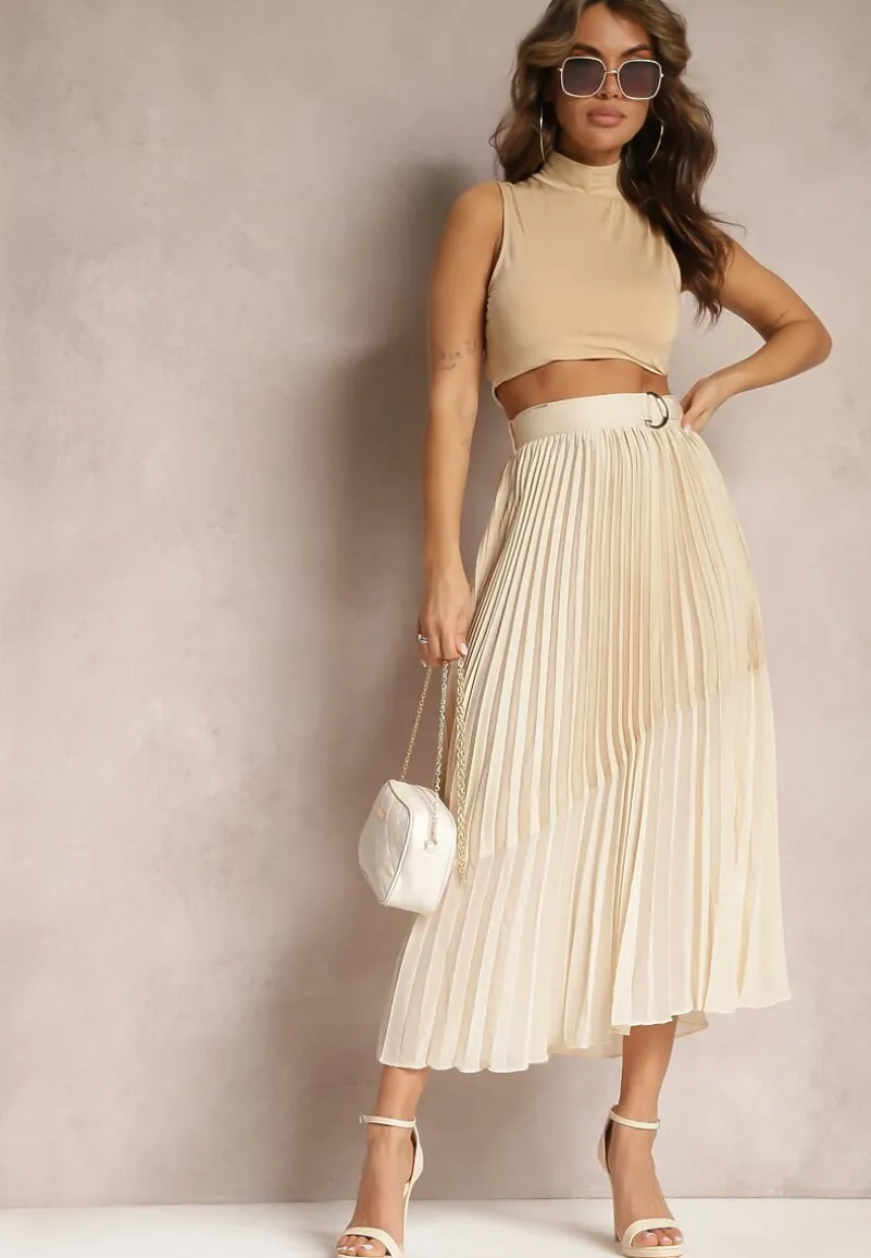 Rozkloszowana spódnica Zamina zapinana na zamek błyskawiczny z boku. Wykonana z plisowanej tkaniny, bez podszewki. W talii dodatkowy pasek z materiału z metalową sprzączką. Świetna na wiosnę i lato.