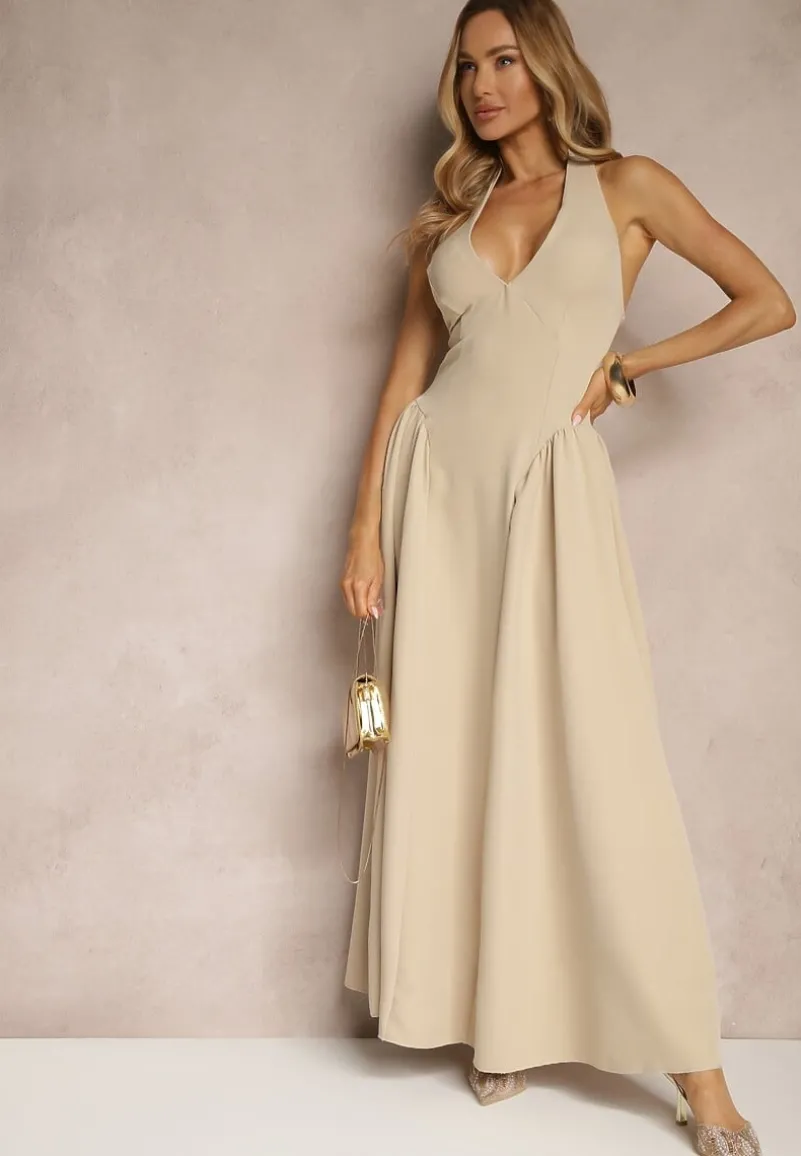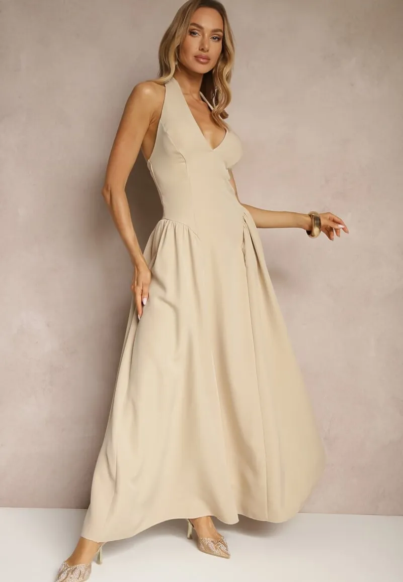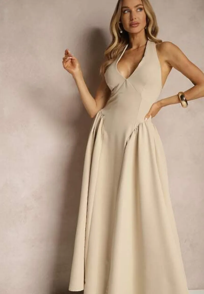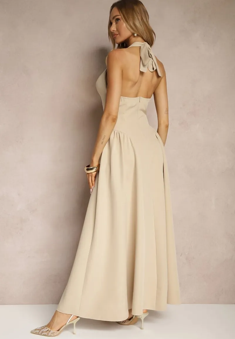 Beżowa Rozkloszowana Sukienka Halter z Wiązaniem i Odkrytymi Plecami Senicce