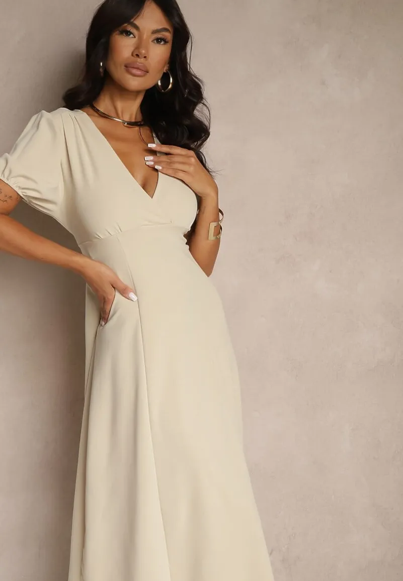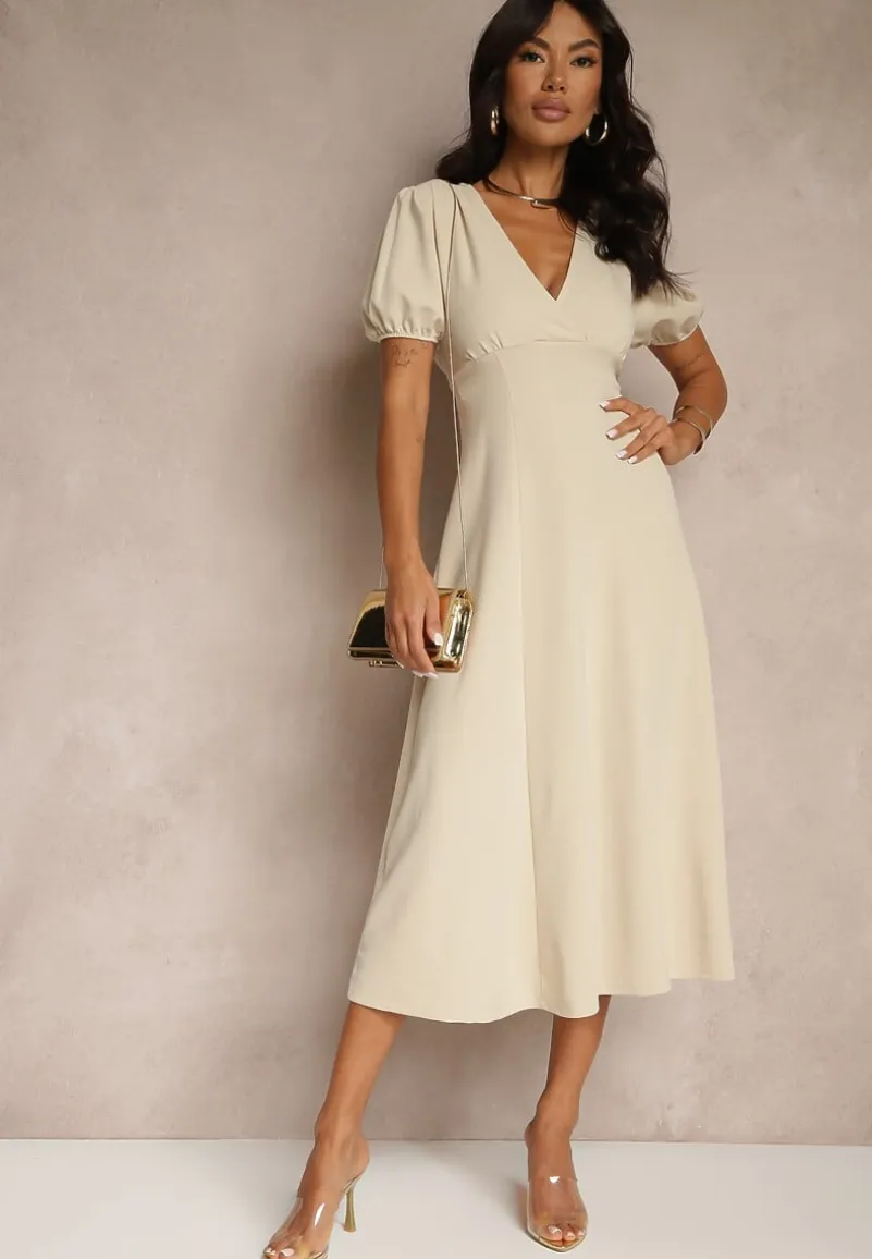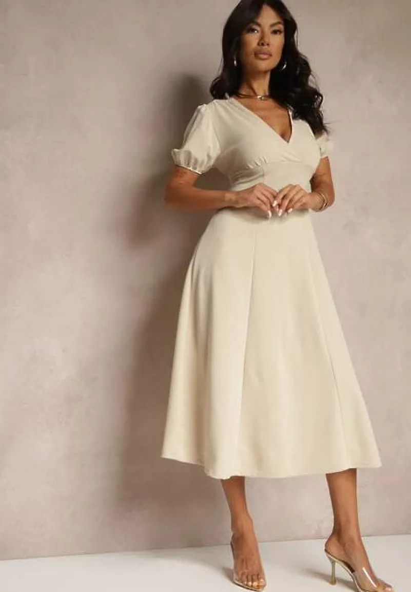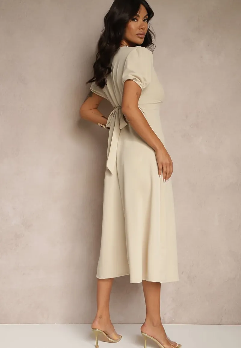 Beżowa Rozkloszowana Sukienka Koktajlowa Ozdobiona Wiązaniem Ziverine