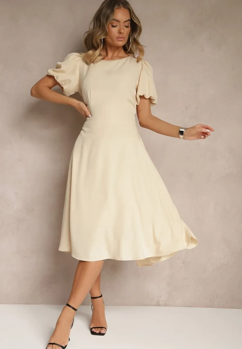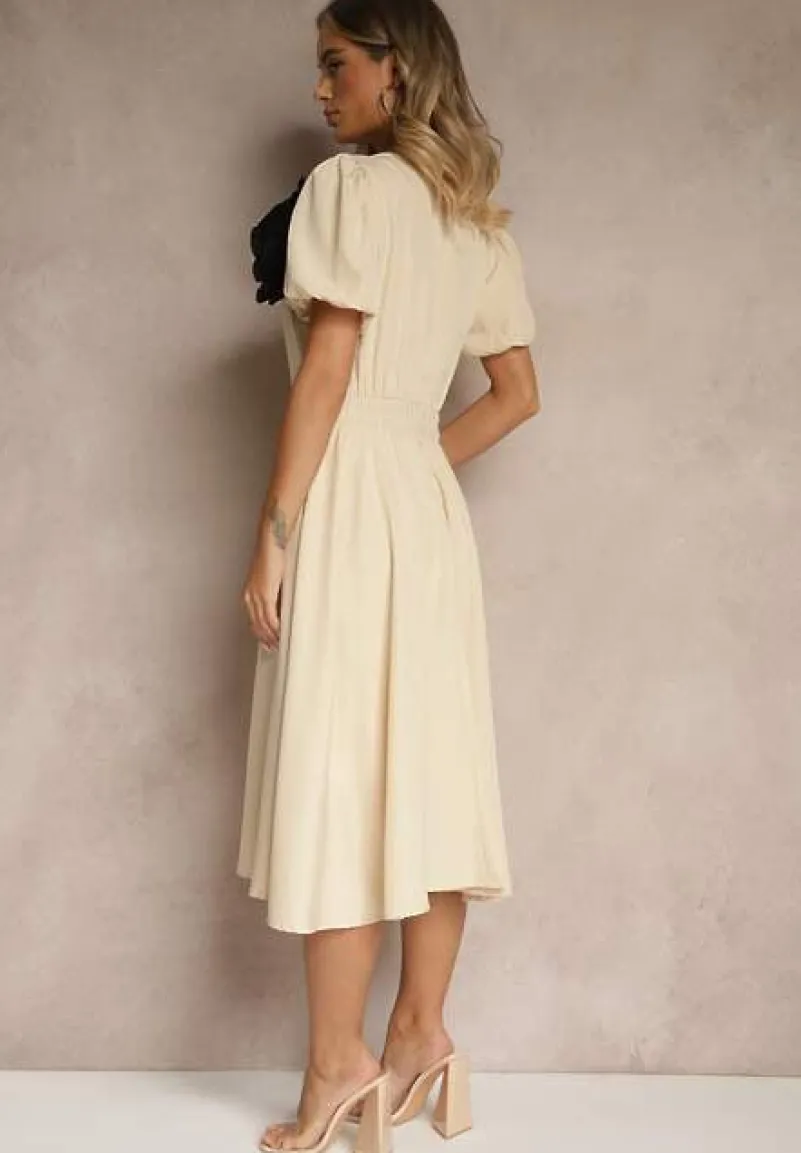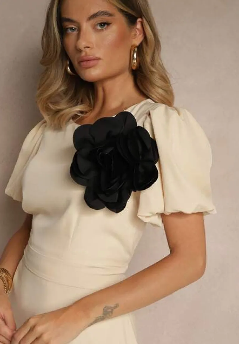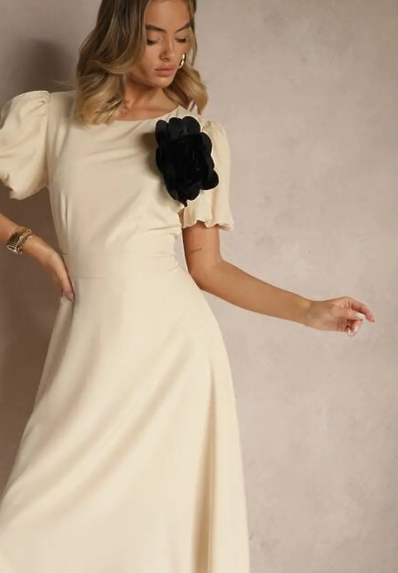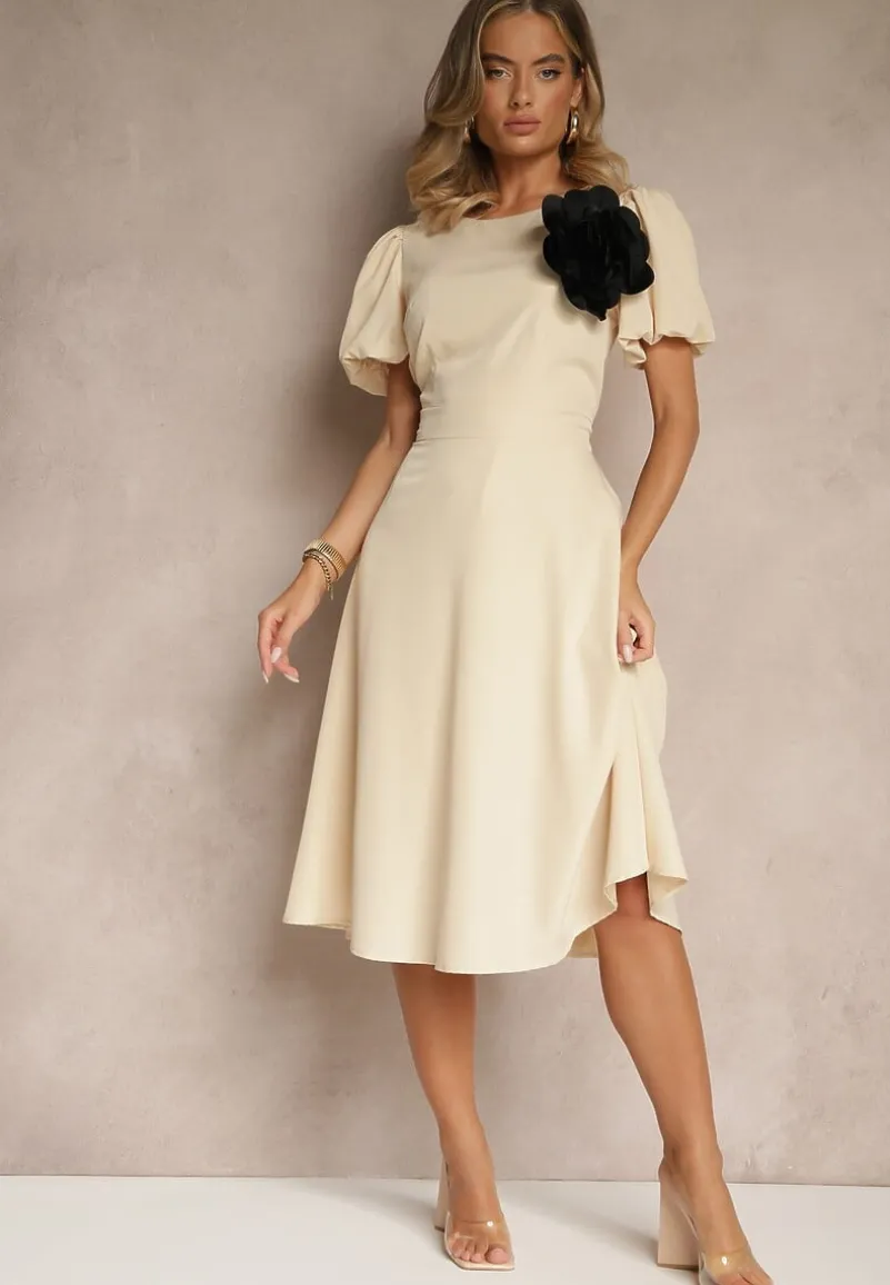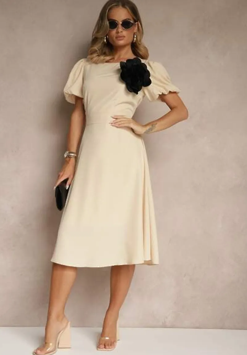 Beżowa Rozkloszowana Sukienka Vices Ozdobiona Odpinanym Kwiatem 3D Koleira