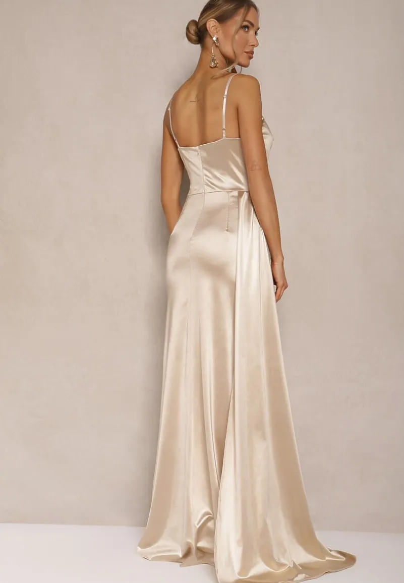 Beżowa Satynowa Sukienka Taliowana z Rozcięciem na Boku Ozdobnym Trenem i Marszczeniami Lisarosea