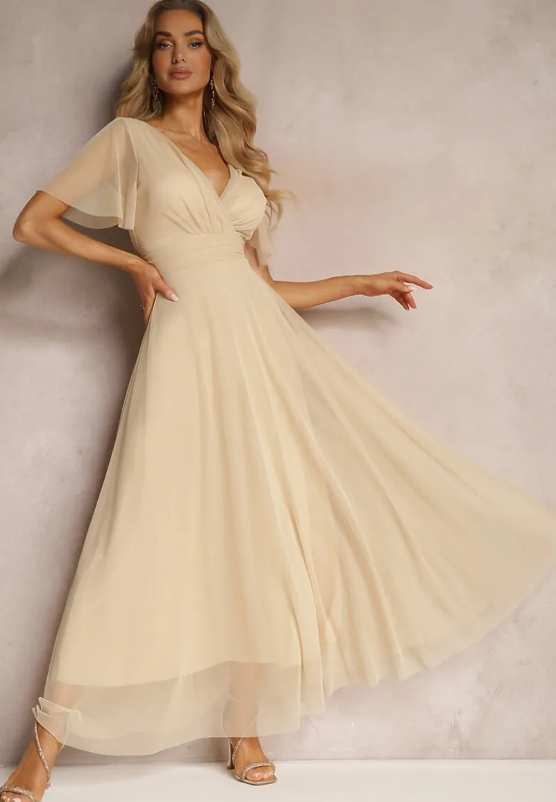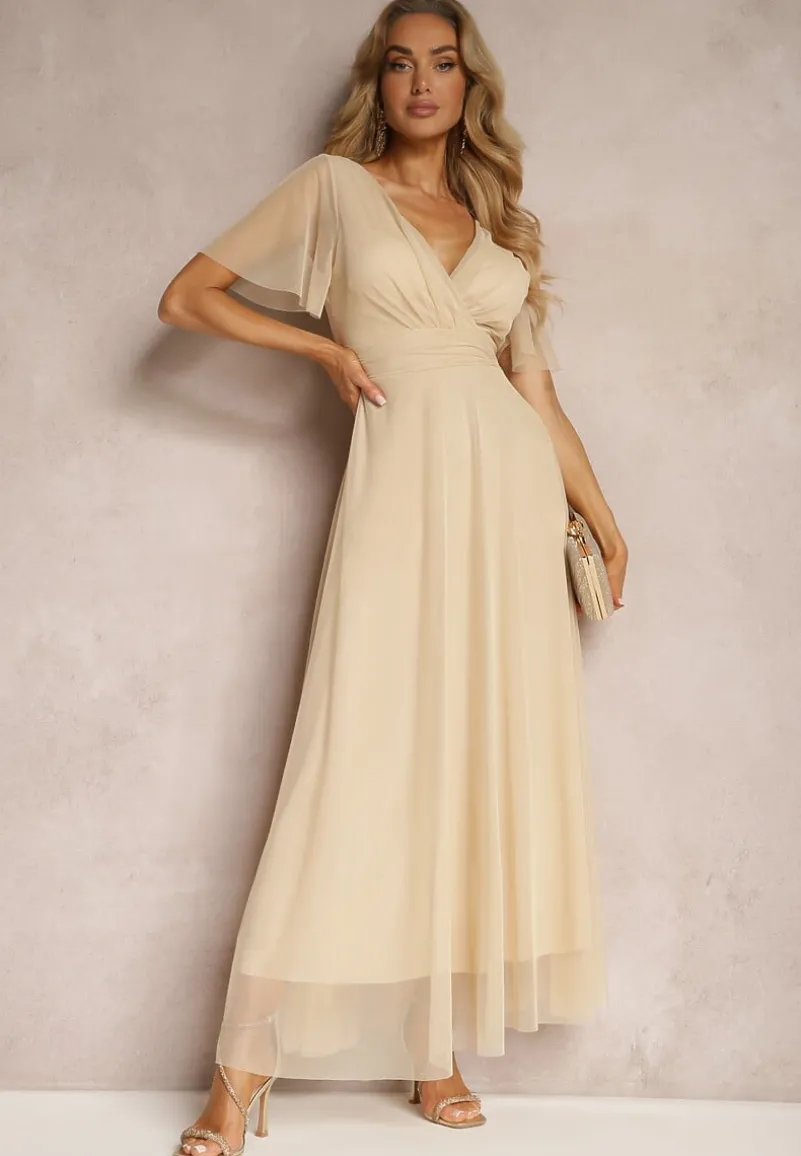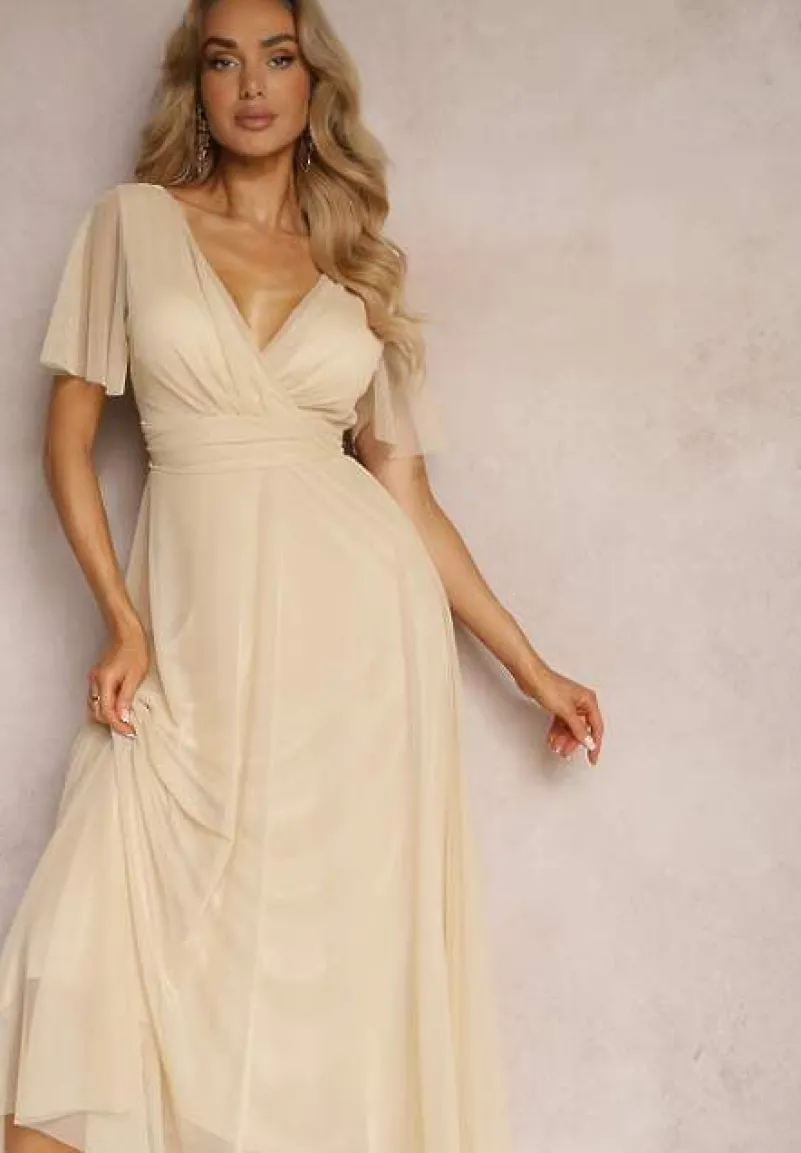 Beżowa Siateczkowa Sukienka z Kopertowym Dekoltem Wiązana w Talii Niblea
