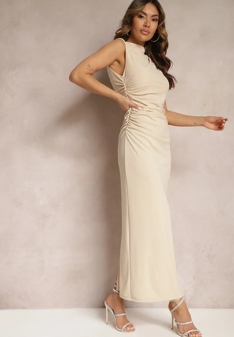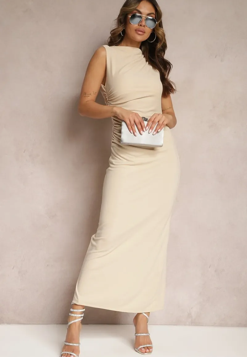 Beżowa Sukienka Bodycon o Dopasowanym Fasonie Bez Rękawów z Drapowaniem Roxelina
