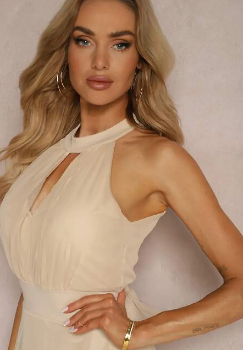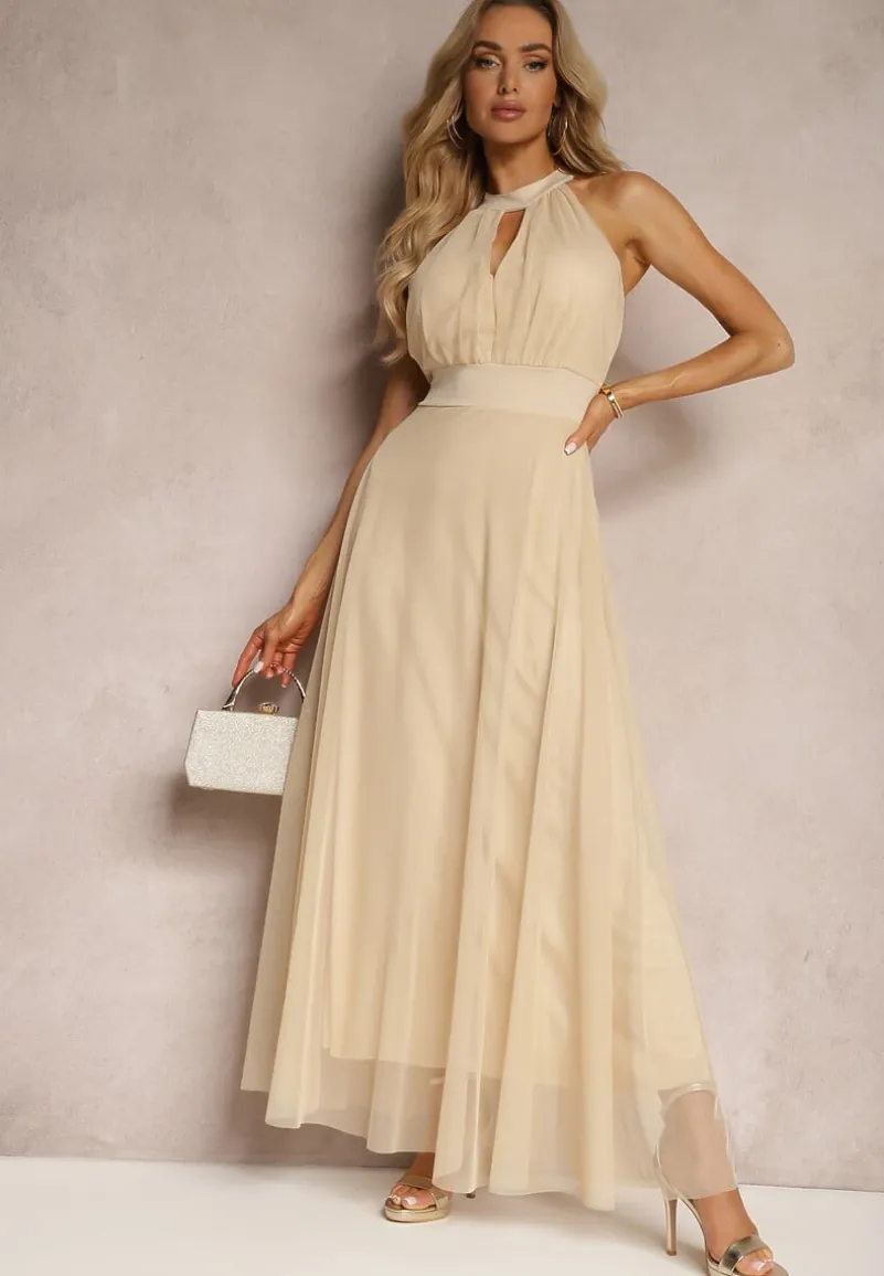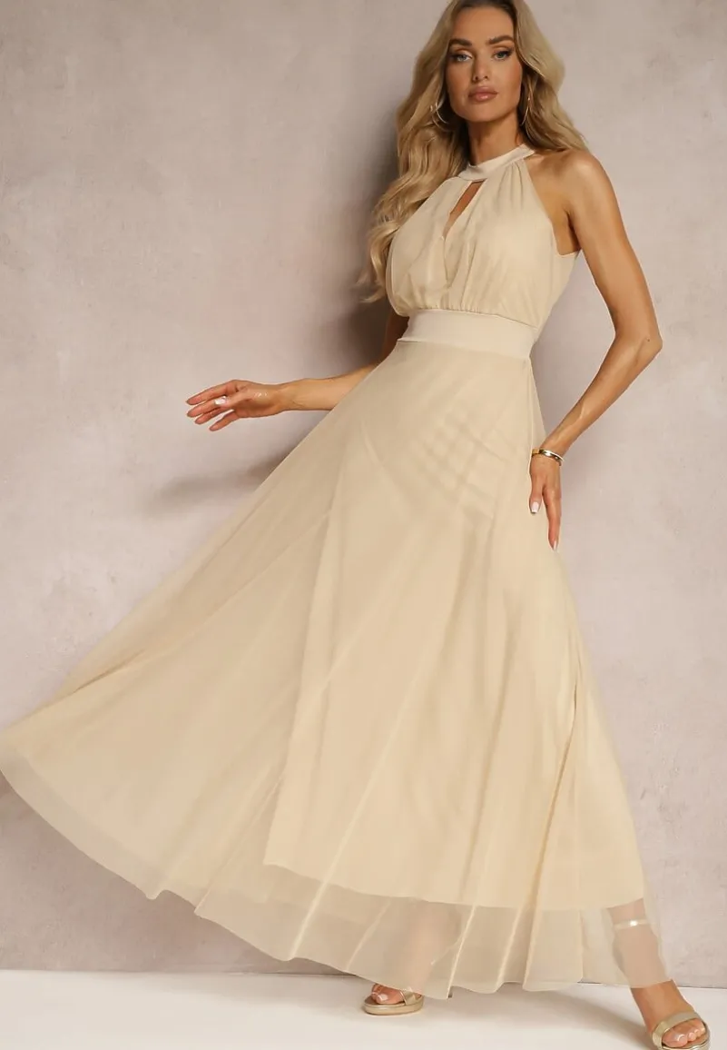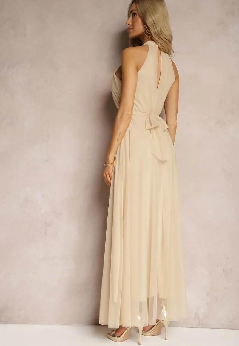 Beżowa Sukienka Koktajlowa z Siateczką Wiązana Materiałowym Paskiem ze Stójką Nestassi