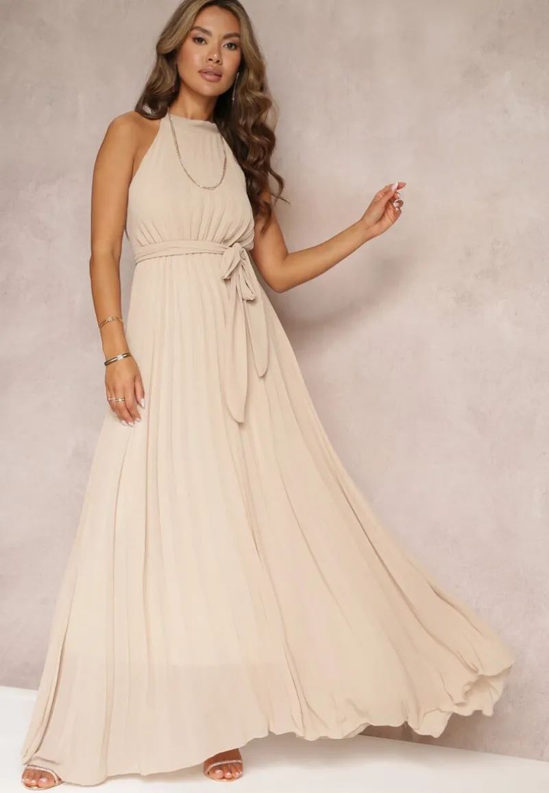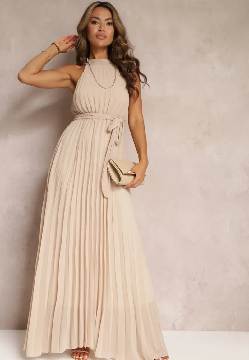 Beżowa Sukienka Maxi bez Rękawów z Gumką w Talii z Plisowanej Tkaniny Pesstia