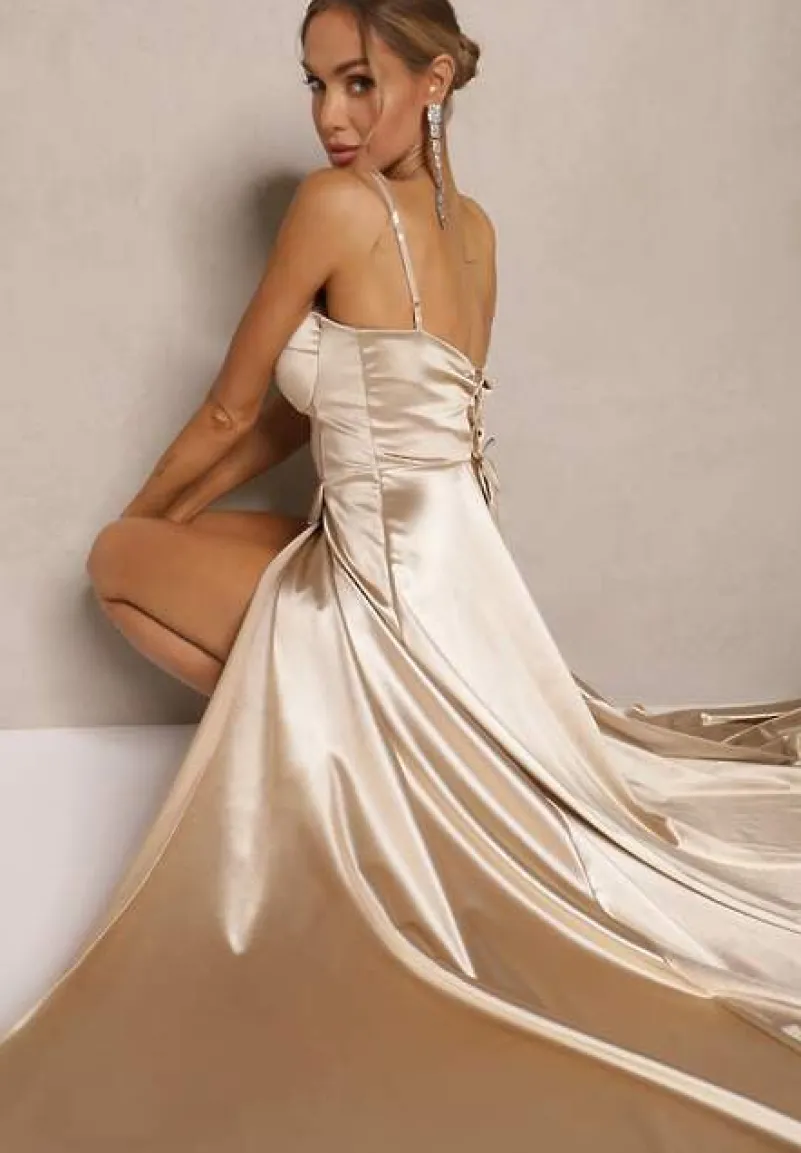 Beżowa Sukienka na Ramiączkach o Rozkloszowanym Kroju z Wiązaniem na Plecach Katirione