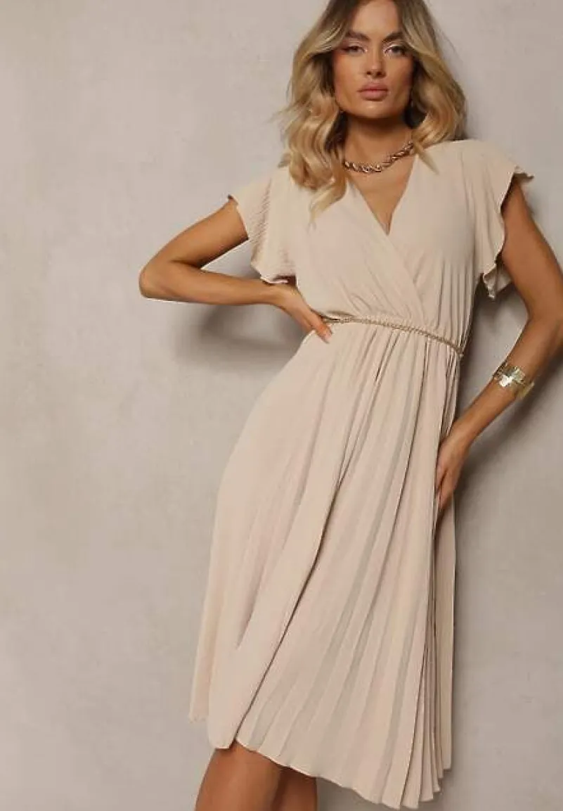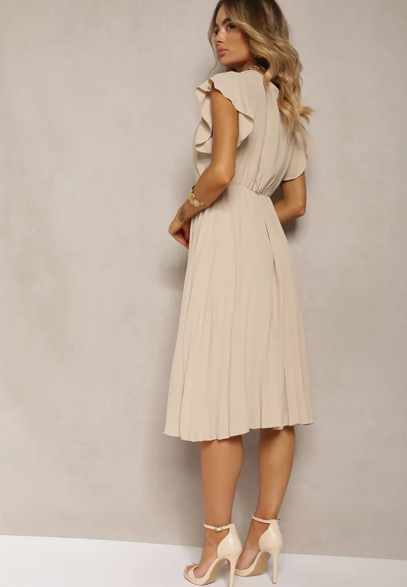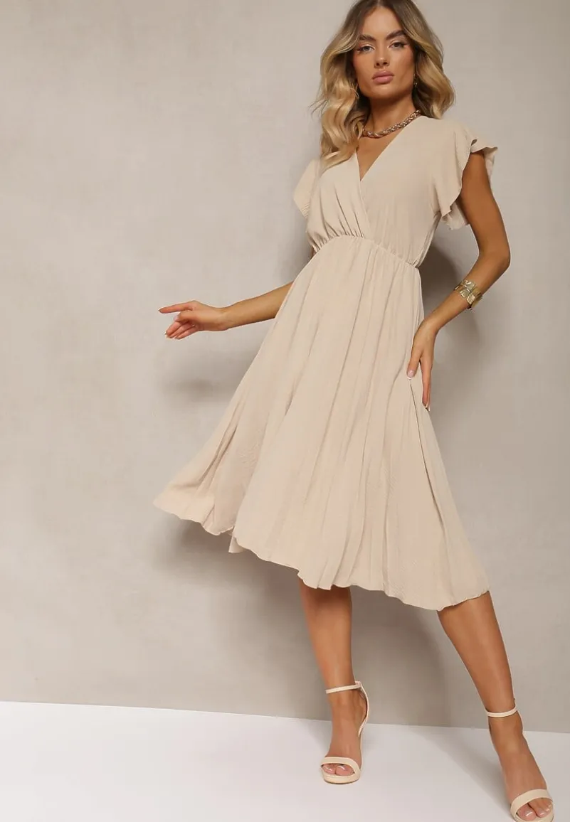 Poznaj sukienkę Doetta, która zachwyca swoim niebanalnym krojem plisowanym – doskonała do stworzenia wyrafinowanej stylizacji na każdą okazję. Elegancki fason z trójkątnym dekoltem pięknie podkreśla szyję, zaś gumka w pasie subtelnie akcentuje talię, nadając sylwetce zgrabne proporcje. Krótkie rękawy dodają całości lekkości, idealnie komponując się z romantycznym charakterem kreacji. Wymiary gumki w pasie po rozciągnięciu: S/M – 65 cm.