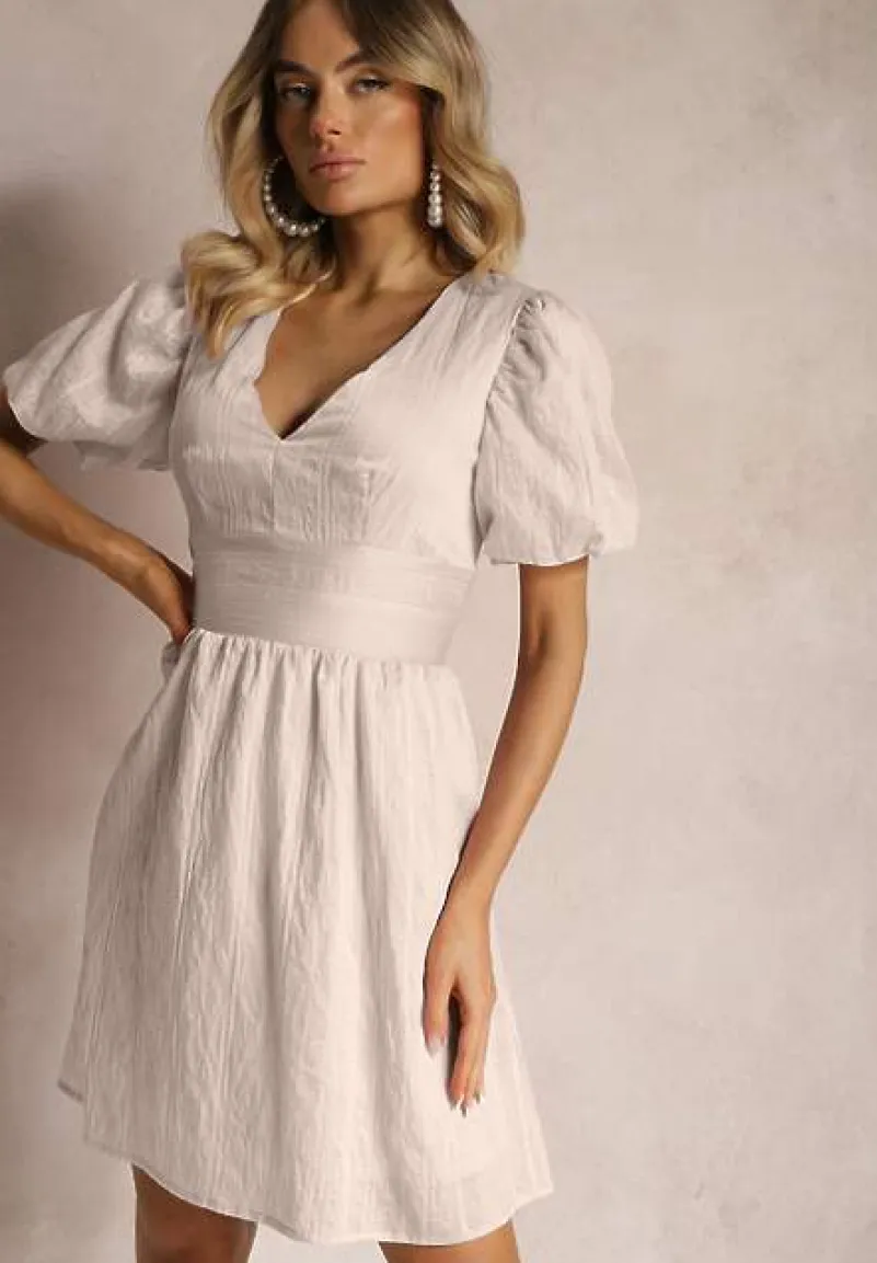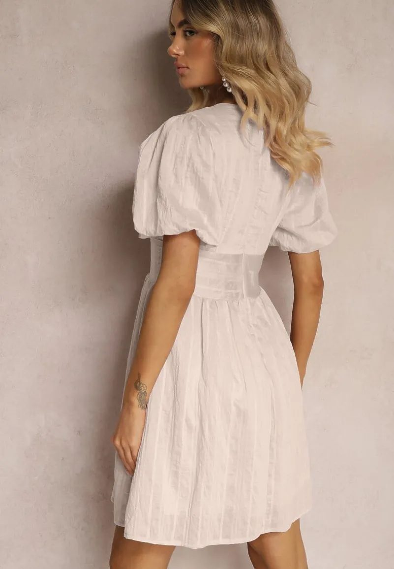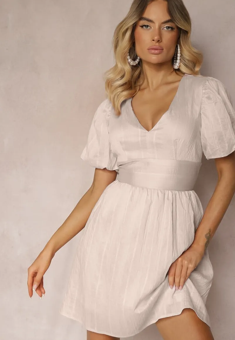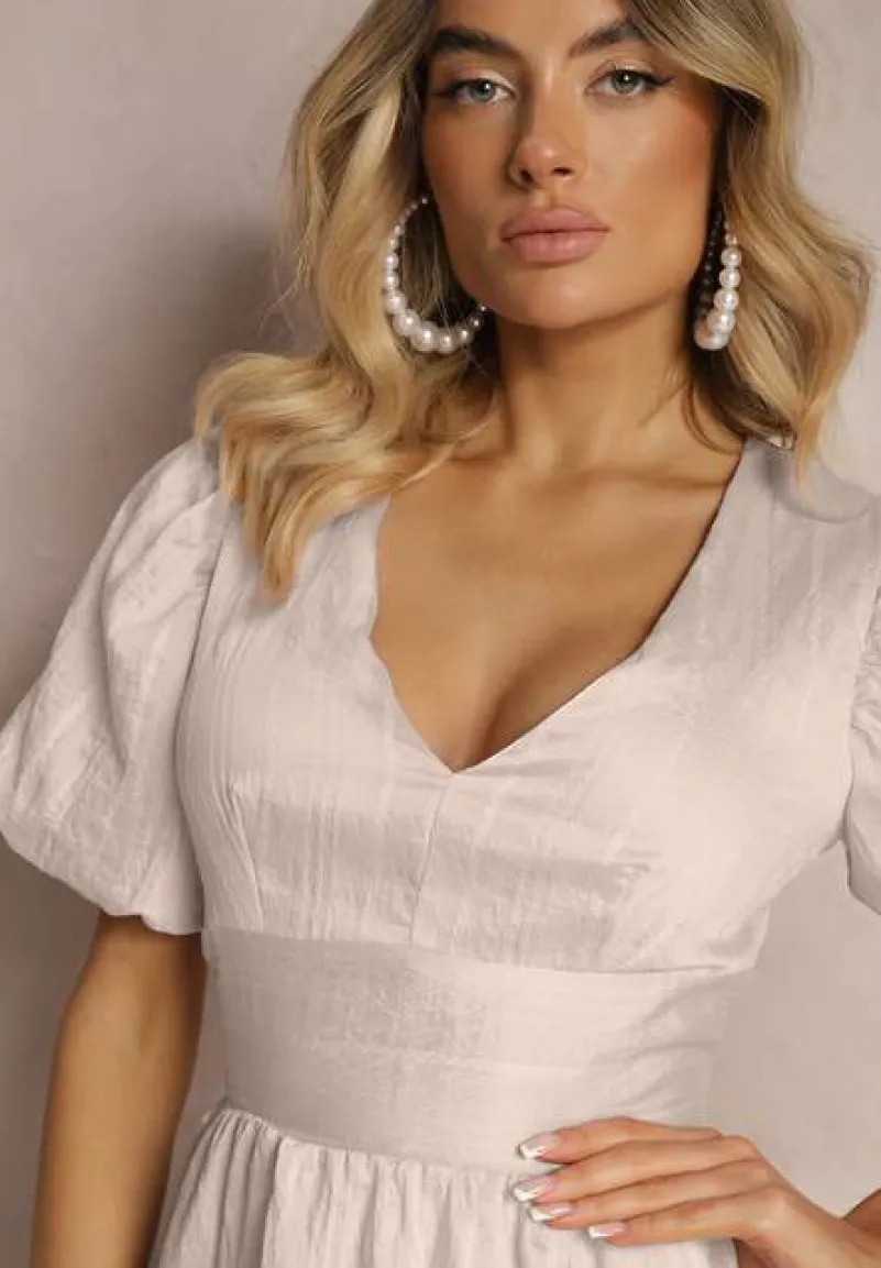 Beżowa Taliowana Sukienka z Dodatkiem Bawełny na Suwak Ozdobiona Bufiastymi Rękawami Malfea