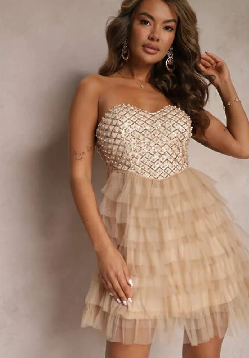 Beżowa Tiulowa Sukienka Mini o Rozkloszowanym Fasonie z Cyrkoniami Klonore