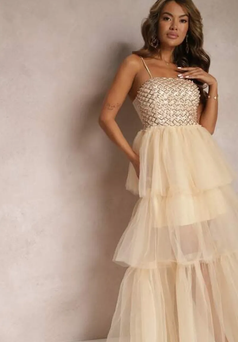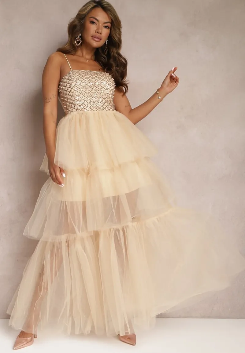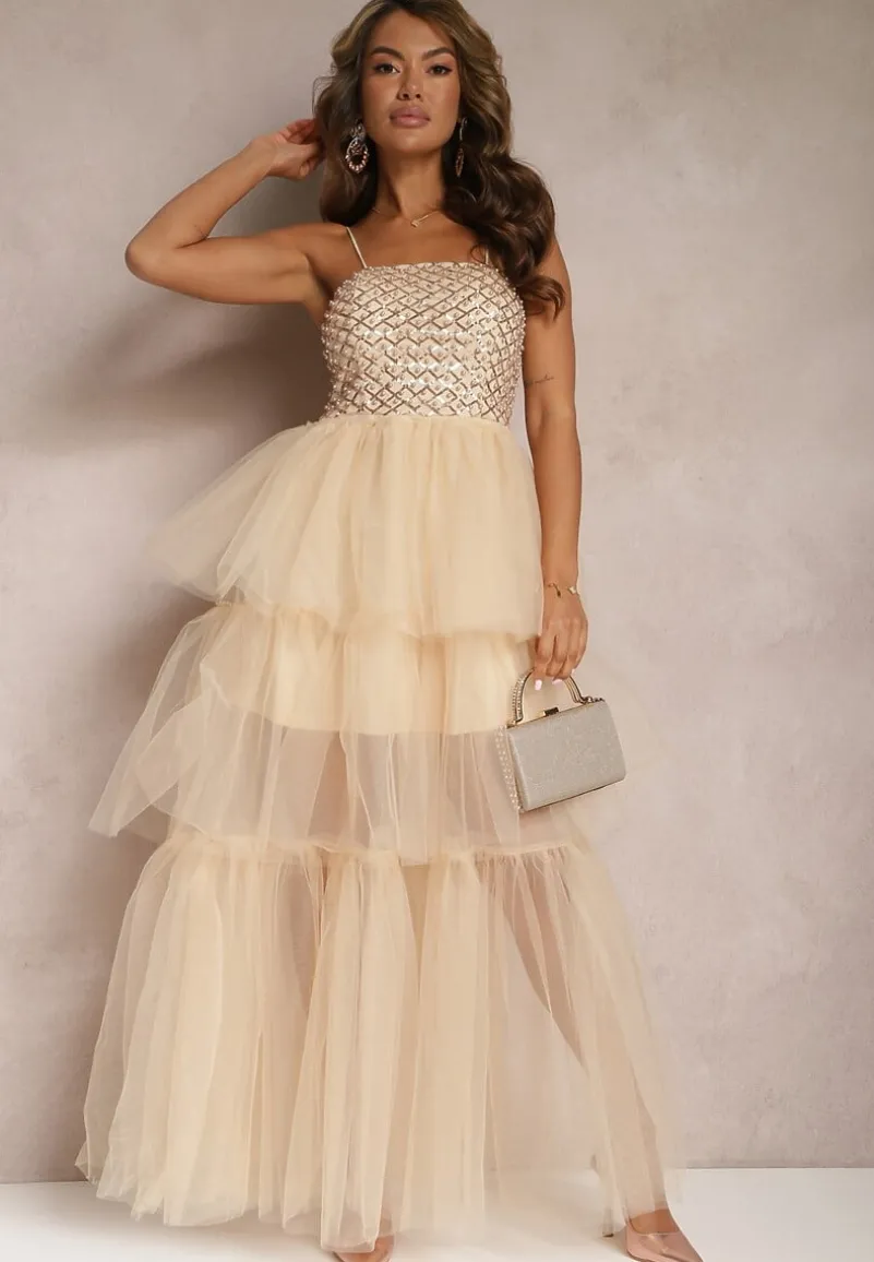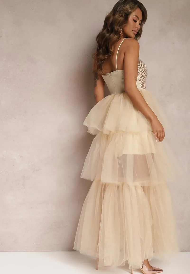 Beżowa Wieczorowa Sukienka Maxi Ozdobiona Cekinami i Falbankami z Tiulu Neptina