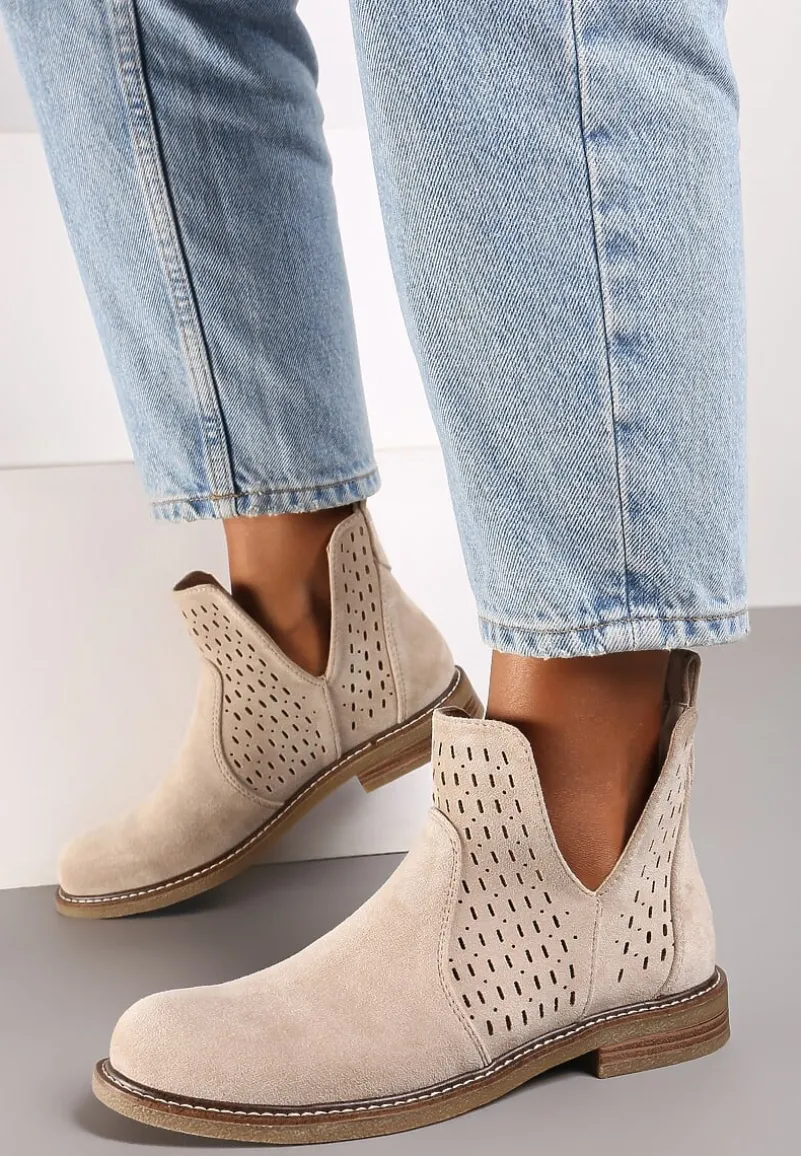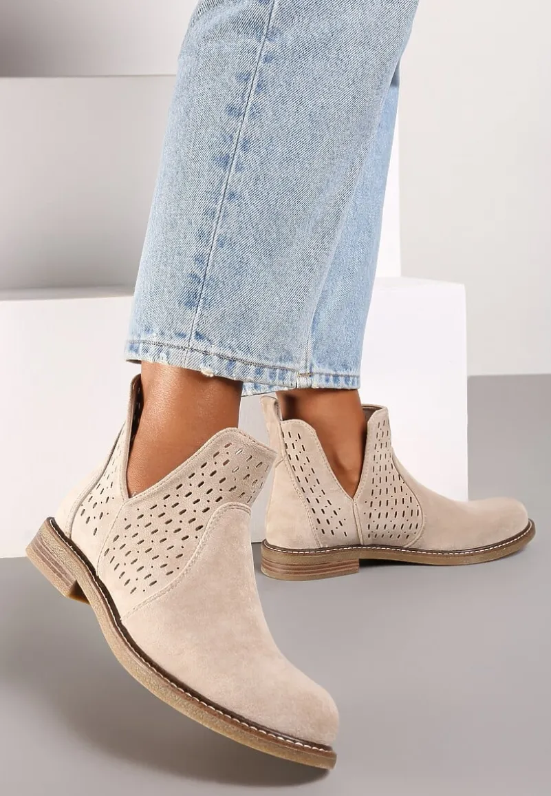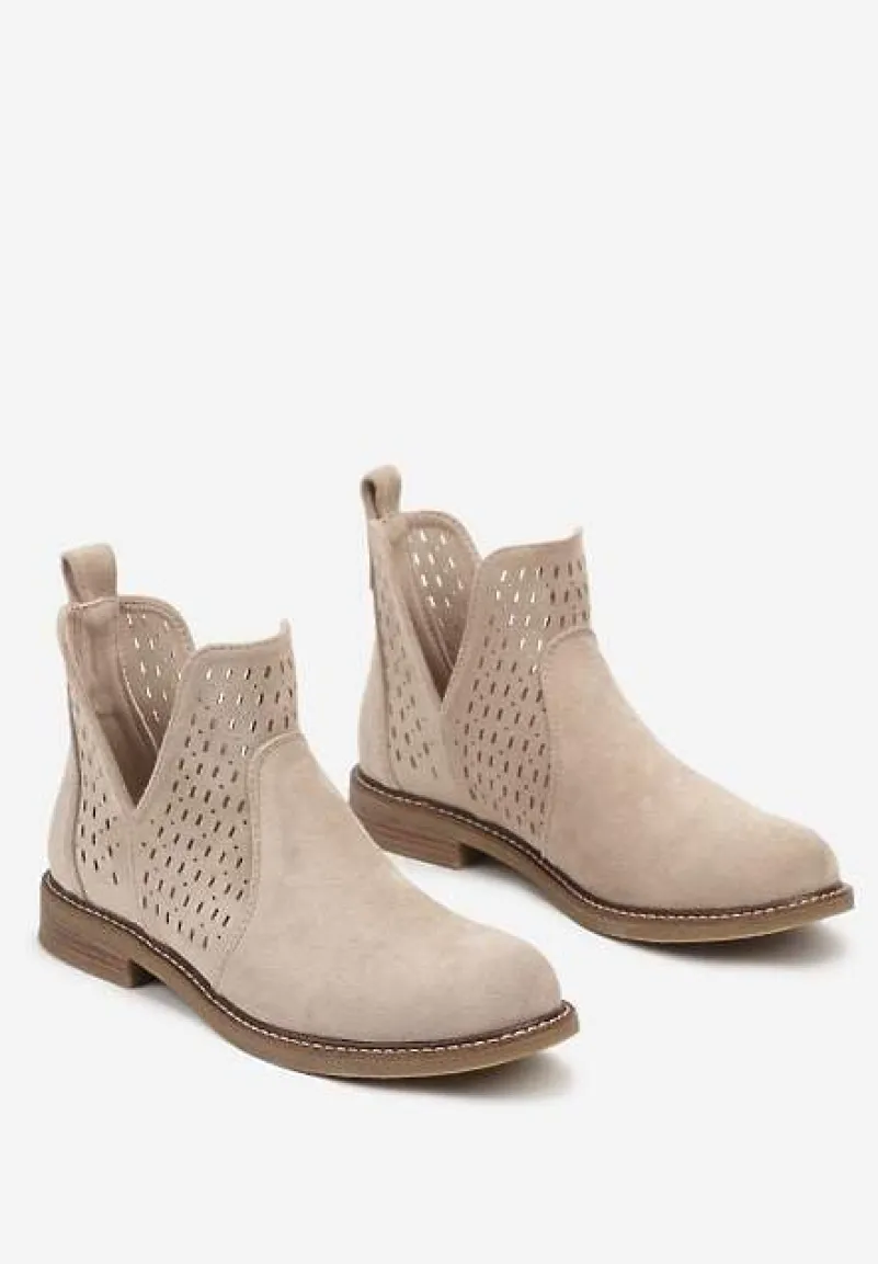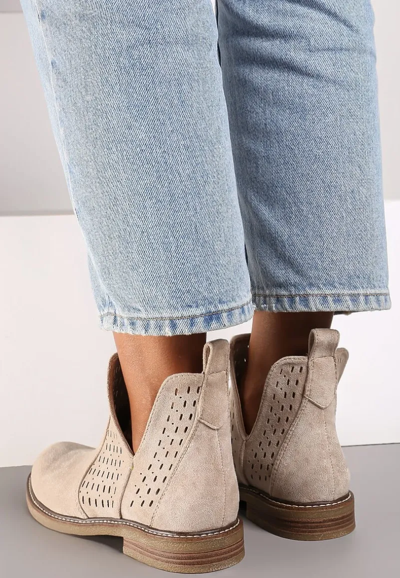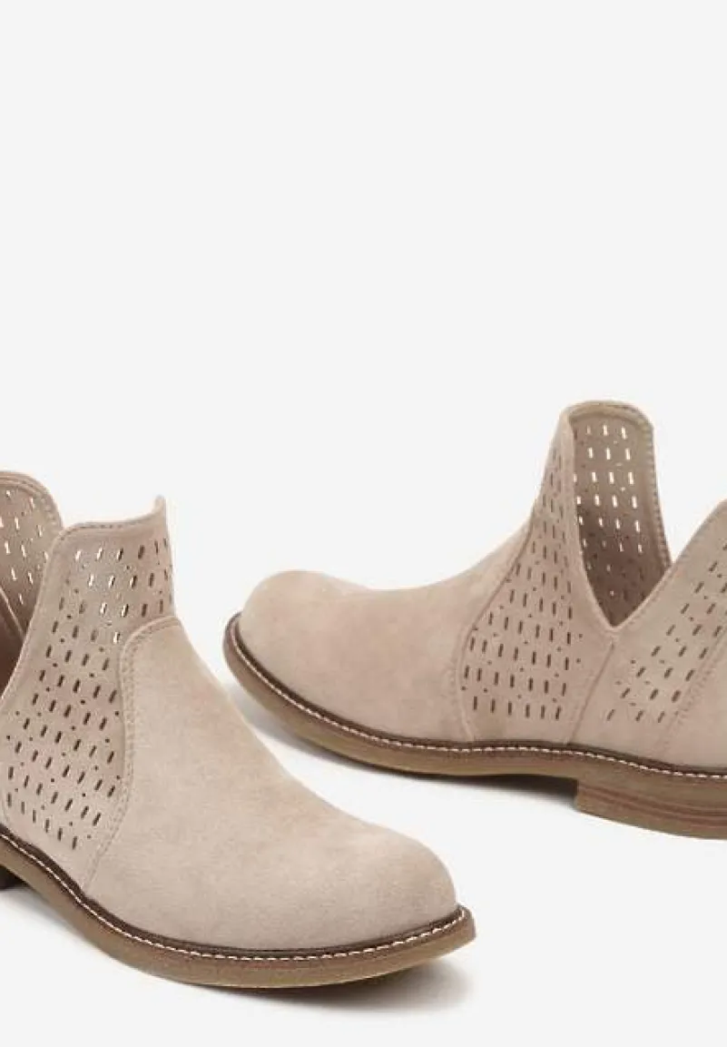 Beżowe Ażurowe Botki w Stylu Sztybletów z Wycięciem z Boku i Skórzaną Wkładką Bralena