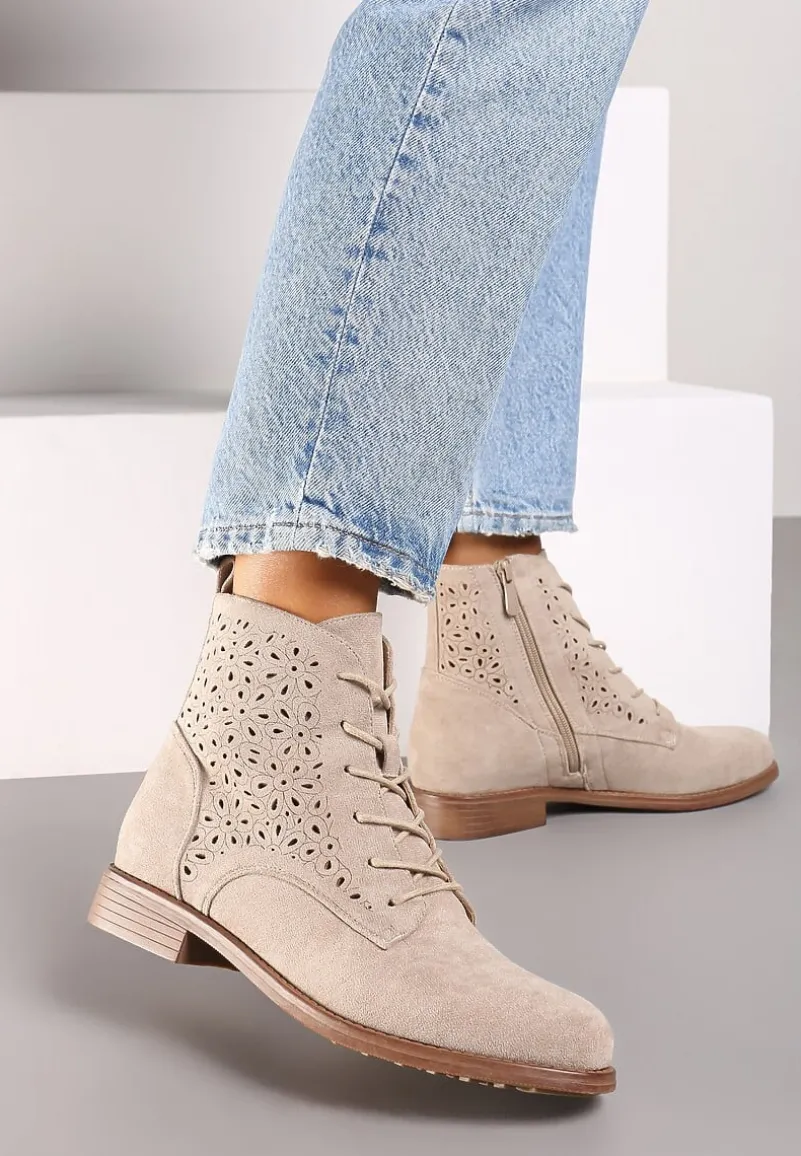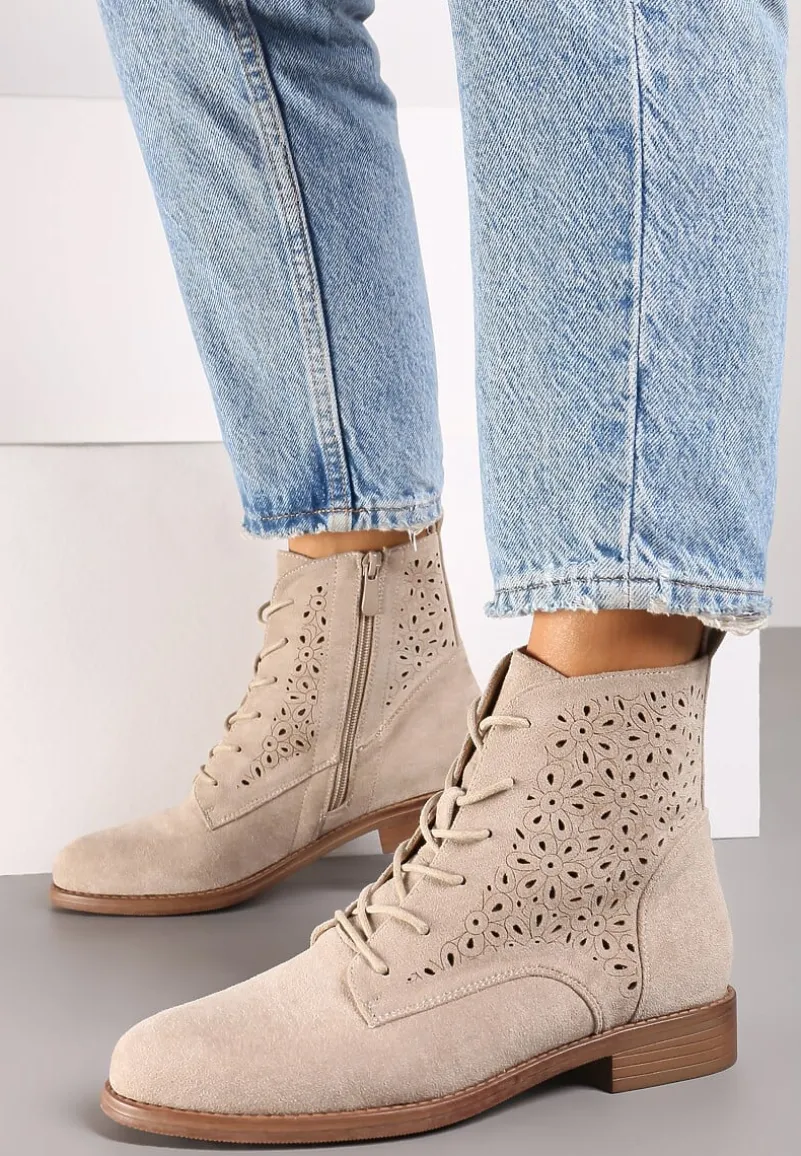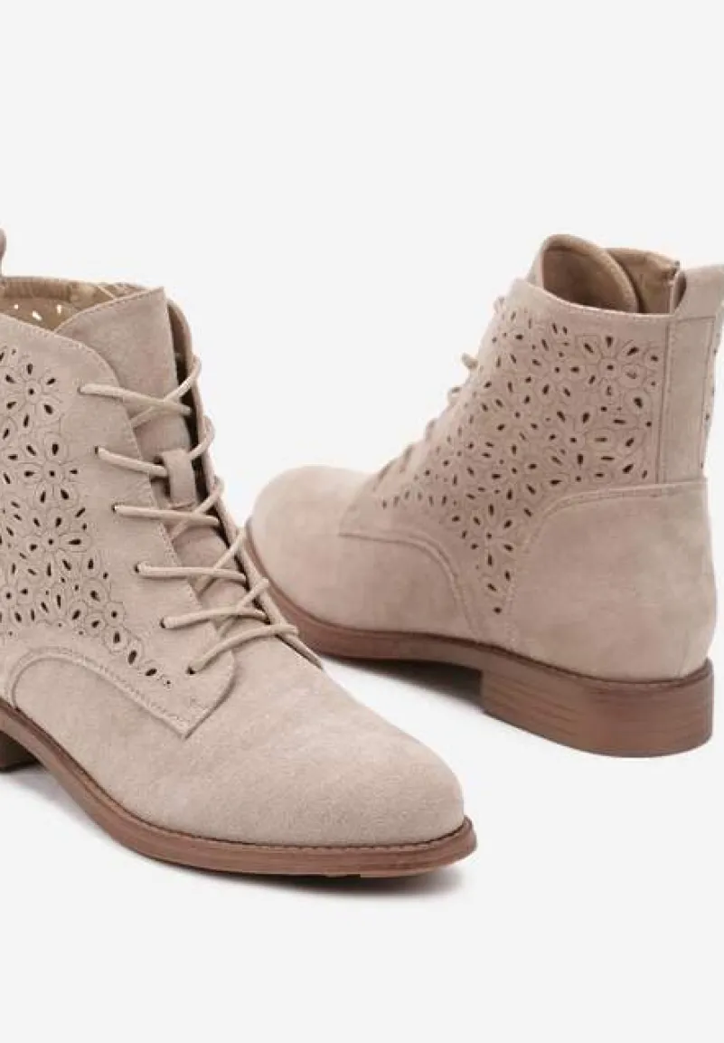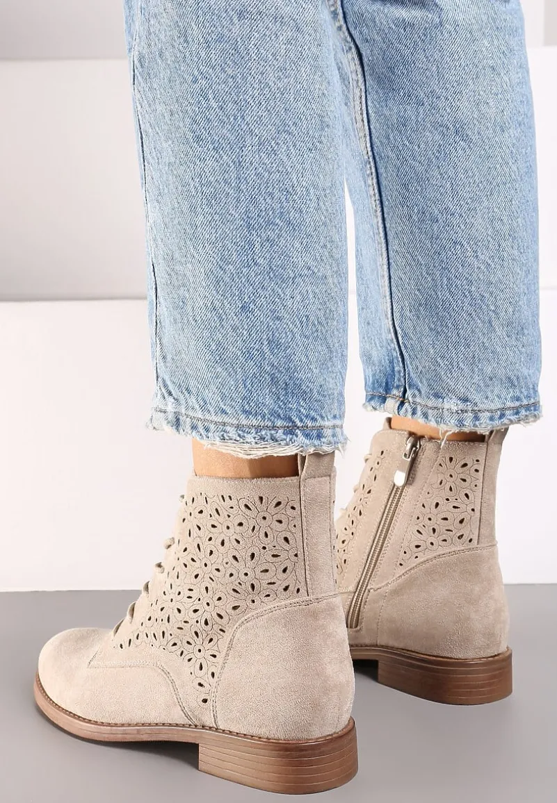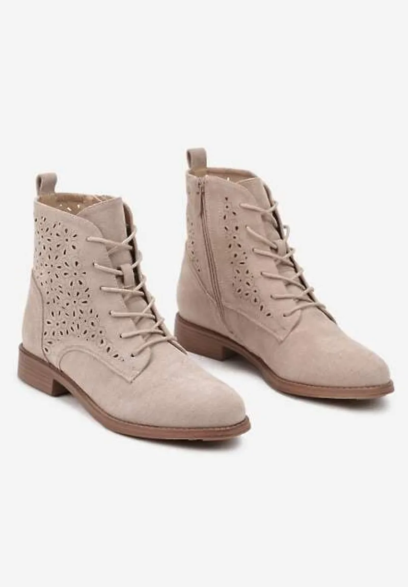Beżowe Ażurowe Botki ze Sznurowaniem i Suwakiem Lerinels
