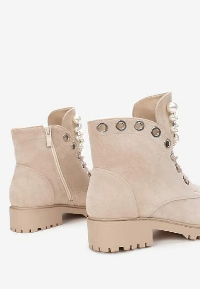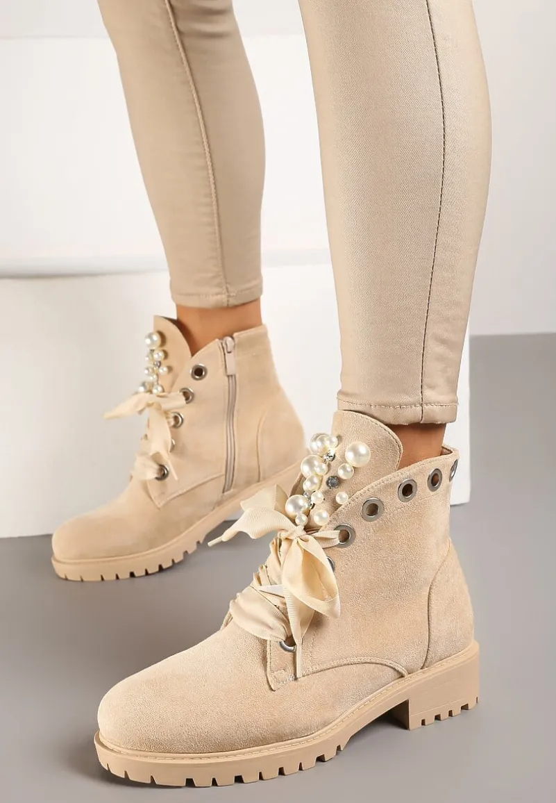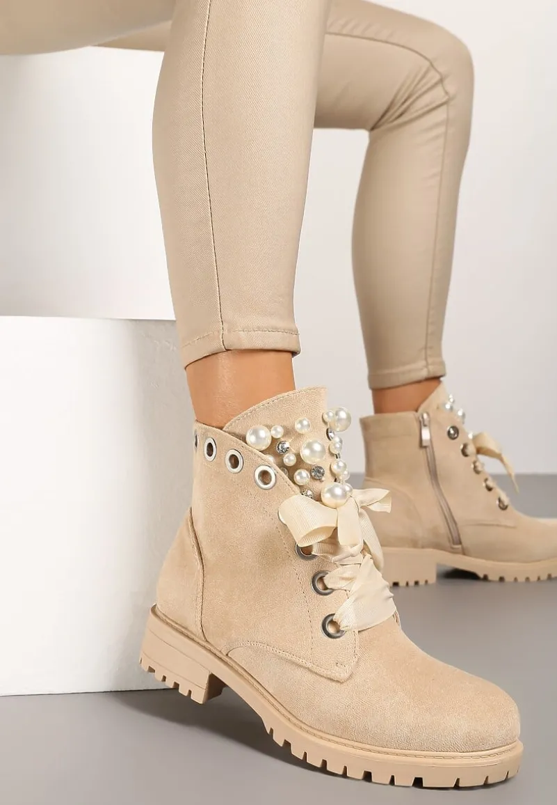 Botki Aufer na podeszwie z płaskim obcasem i protektorem. Cholewka zakrywająca kostkę, zapinana po wewnętrznej stronie na zamek błyskawiczny. Nosek okrągły. Z przodu dodatkowe sznurowanie. Wykonane z ekozamszu, nieocieplane. Uwagę przykuwają błyszczące aplikacje z imitacji pereł i cyrkonii. Ten design zachwyci niejedną fashionistkę. Przed zakupem spójrz na tabelę (polecamy wybrać rozmiar o 1 mniejszy niż zwykle).