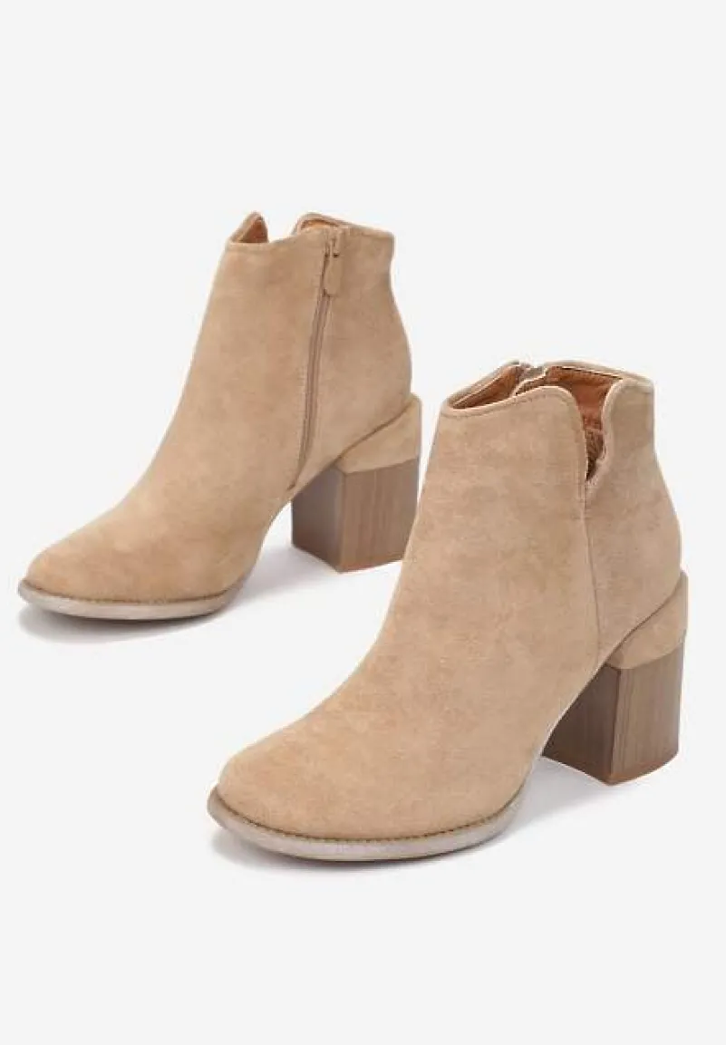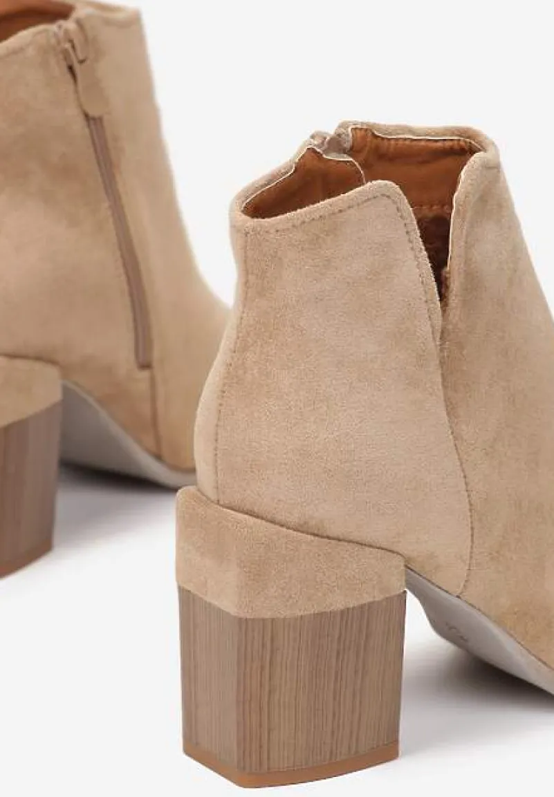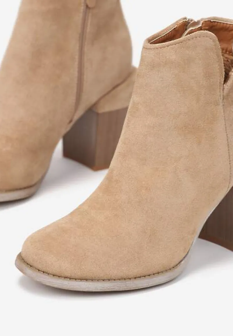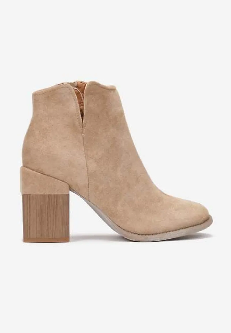 Botki Dianastis na średniej wysokości słupku z imitacji drewna. Nosek okrągły, cholewka zasuwana i sięgająca za kostkę. Udekorowane wycięciem na zewnętrznej krawędzi cholewki. Wykonane z ekozamszu, lekko ocieplane od środka materiałem imitującym futerko. Model o gładkim wzorze, świetnie komponuje się ze spodniami w kratę albo kwiatową spódnicą.