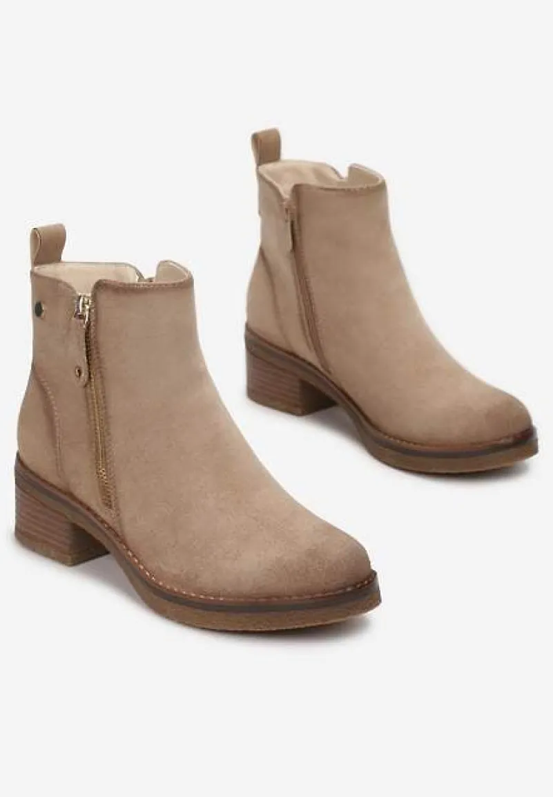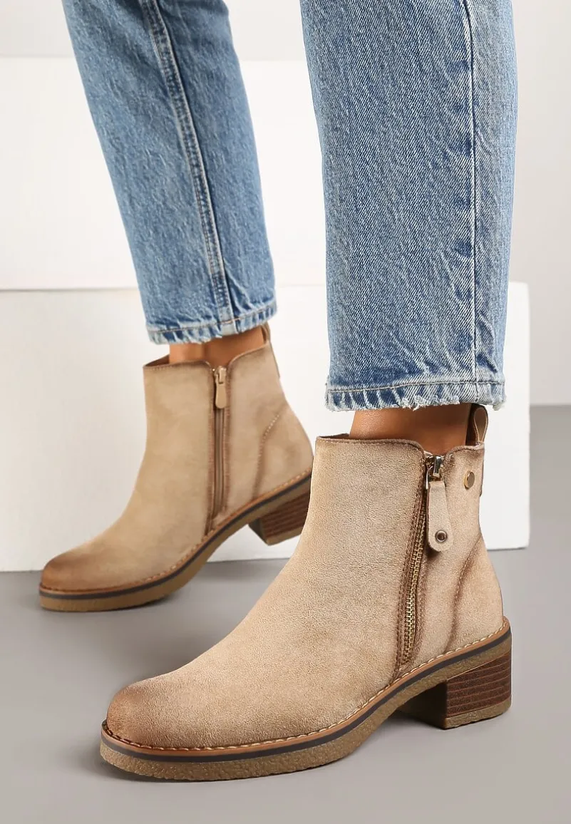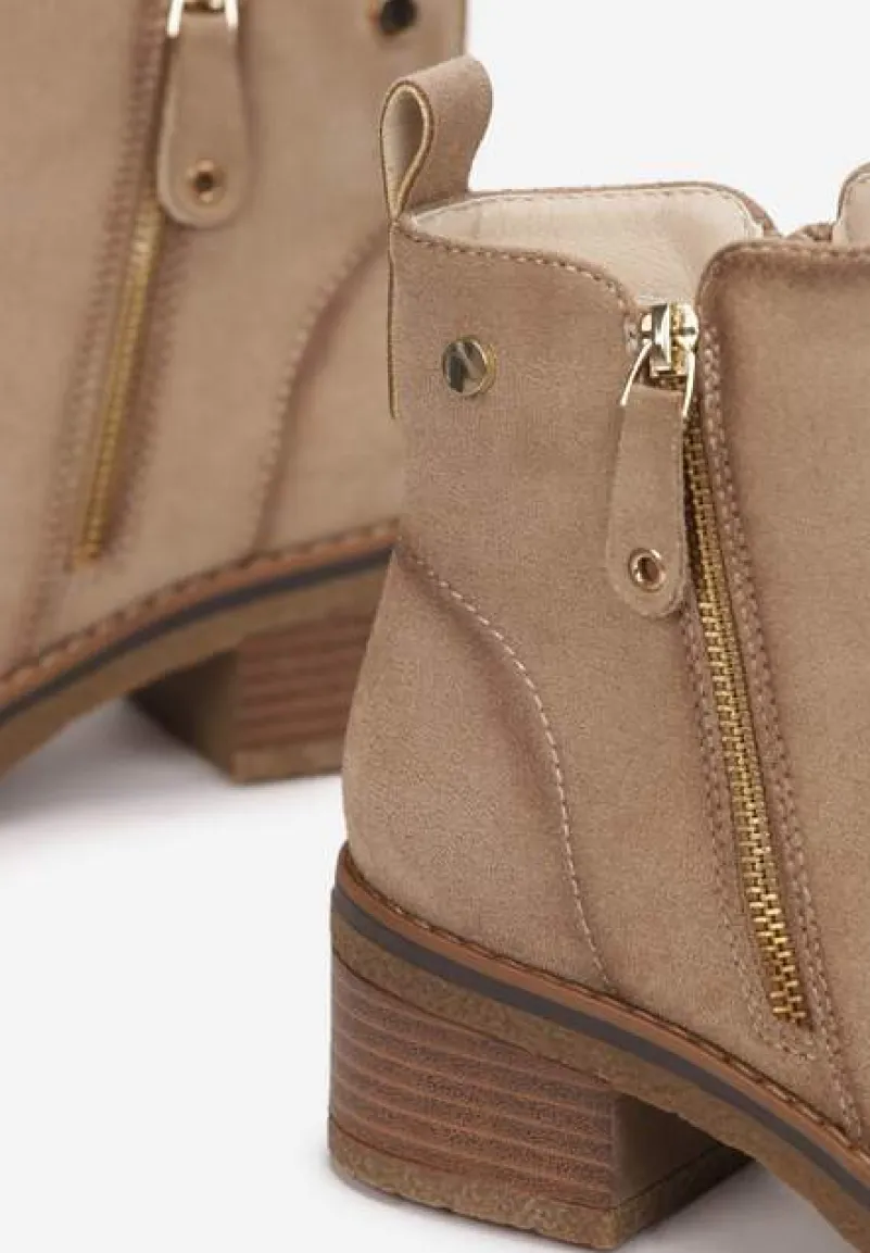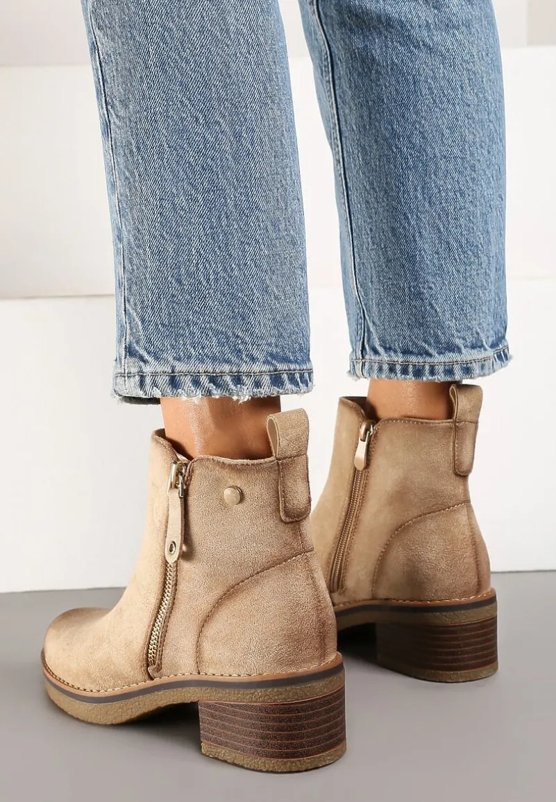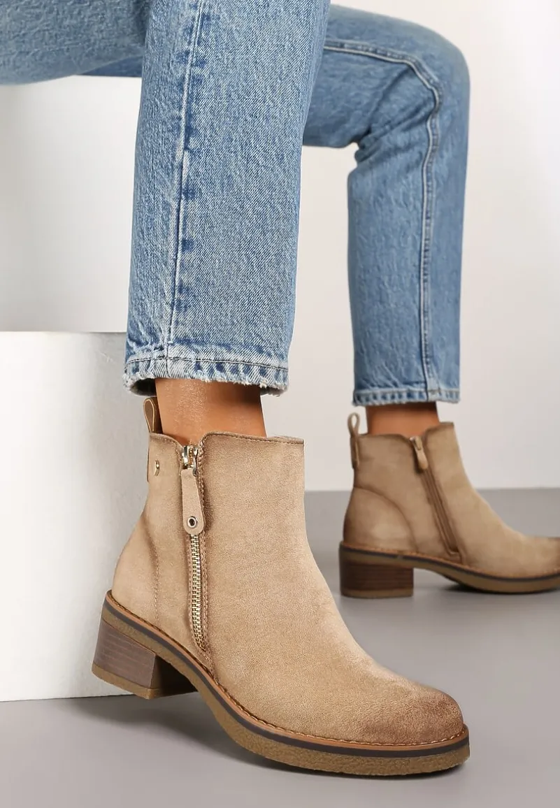 Botki Perice wykonane z ekozamszu, z cholewką zakrywającą kostkę. Wygodnie zapinane na zamek błyskawiczny. Lekko ocieplane kocem obuwniczym, świetnie sprawdzając się na okres przejściowy. Cholewka z zewnętrznej strony dekorowana ozdobnym zamkiem. Osadzone na płaskim obcasie. Ponadczasowe botki z modnym akcentem, będą niezastąpionym elementem Twojej szafy!