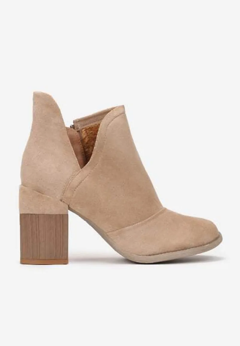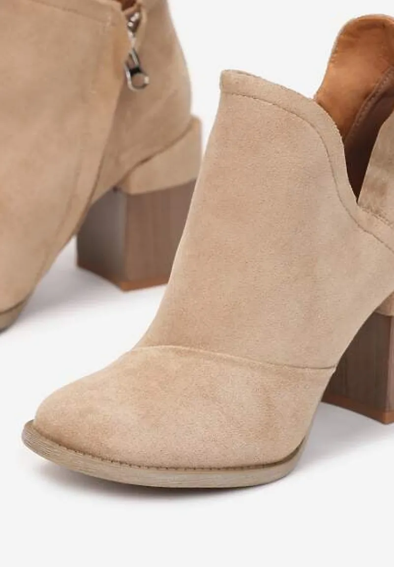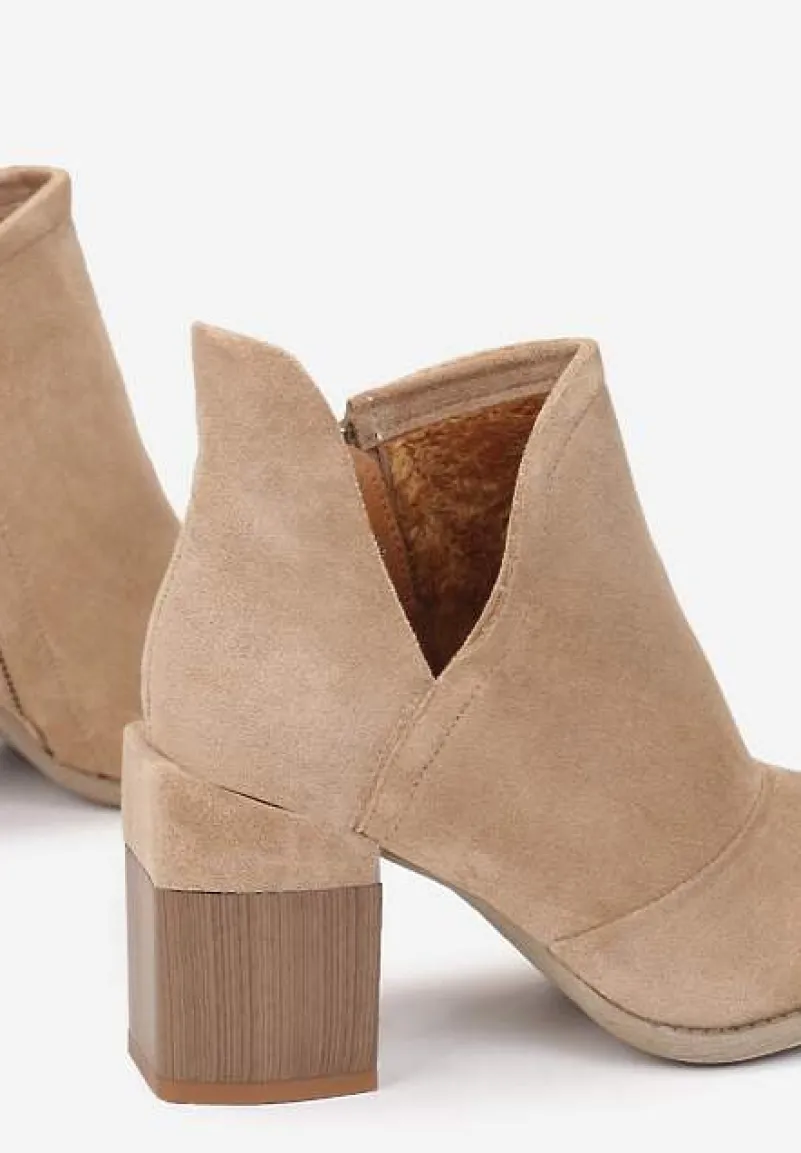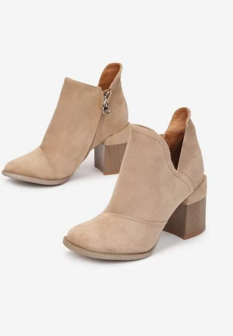 Botki Phaerele z trójkątnym wycięciem na kostce. Osadzone na kwadratowym obcasie o średniej wysokości. Zapinane na zamek błyskawiczny, z noskiem o zaokrąglonej krawędzi. Wykonane z ekozamszu. Cholewkę oraz wkładkę lekko ocieplono od środka kocem obuwniczym. Noś je do spodni skinny albo spódnic i sukienek pokrytych kwiatowym printem.