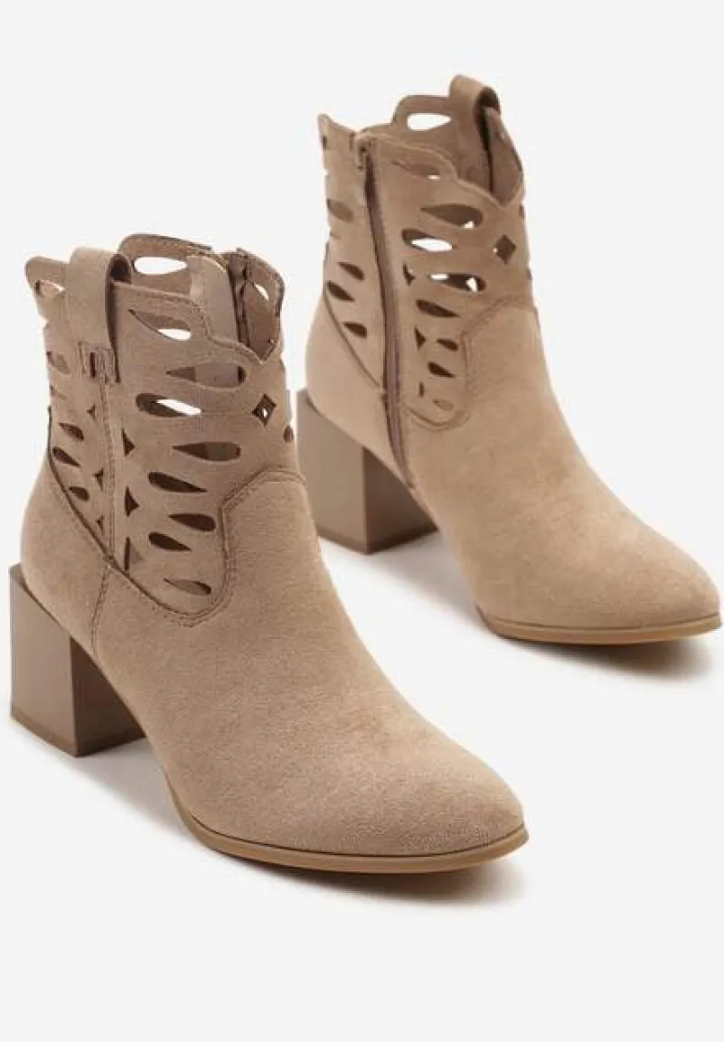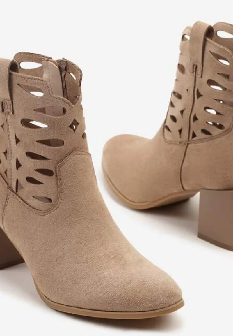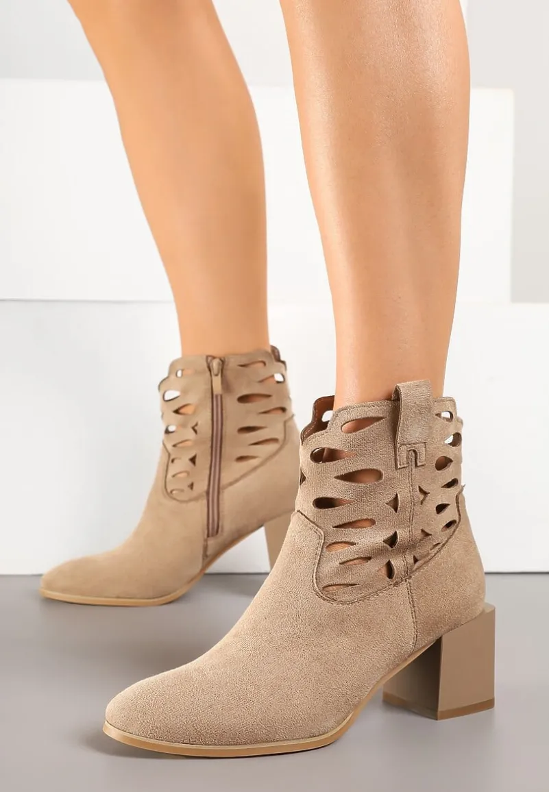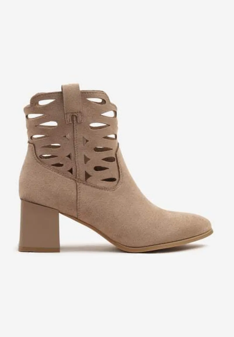 Beżowe Botki z Wycięciami na Cholewce na Kwadratowym Słupku Ahlaria