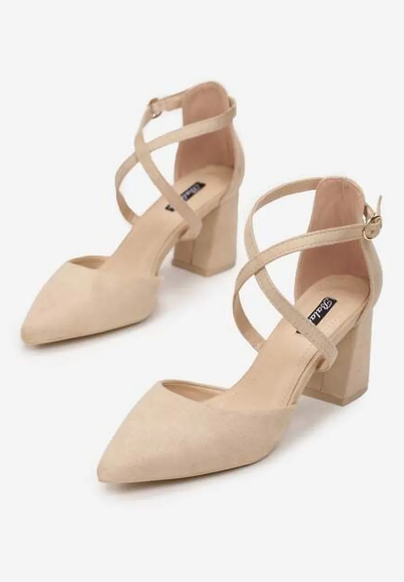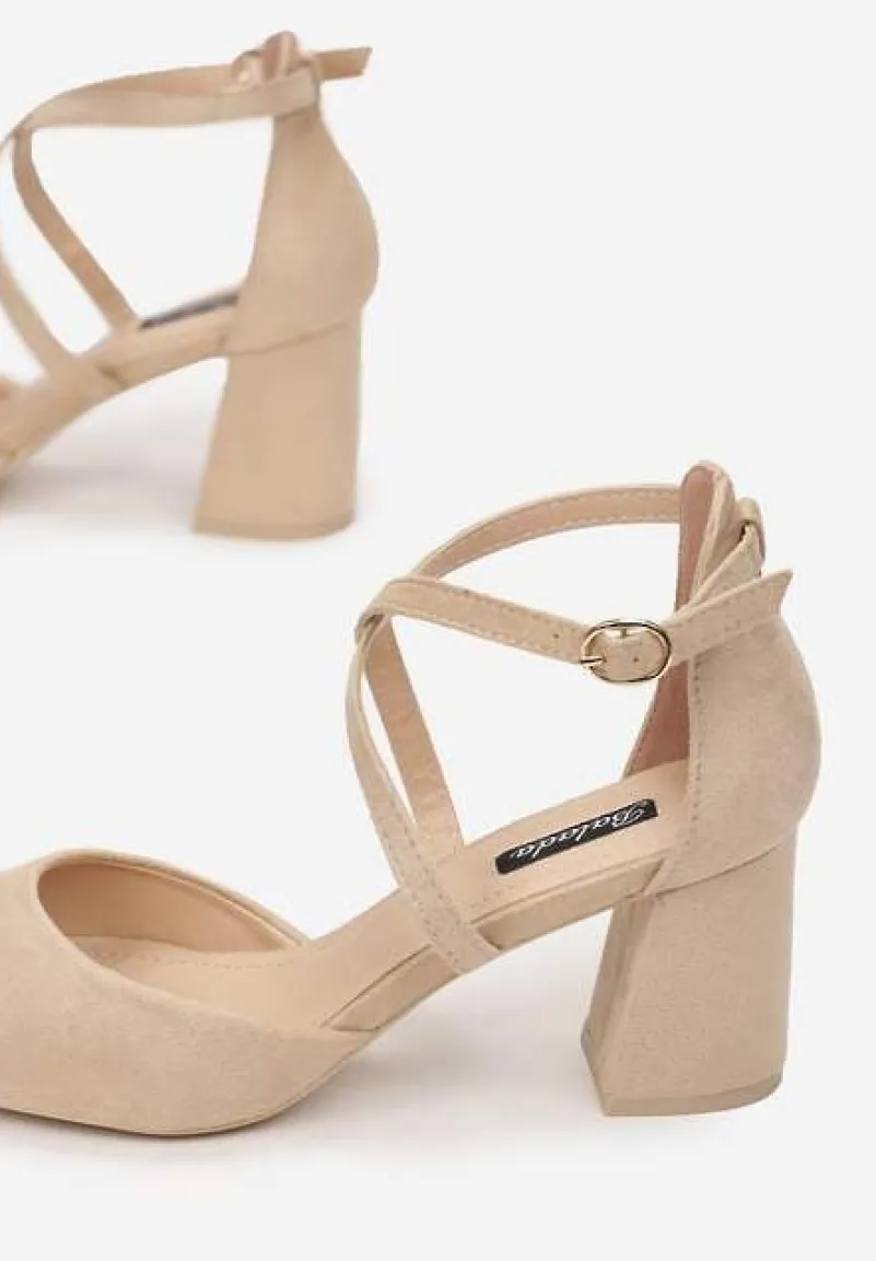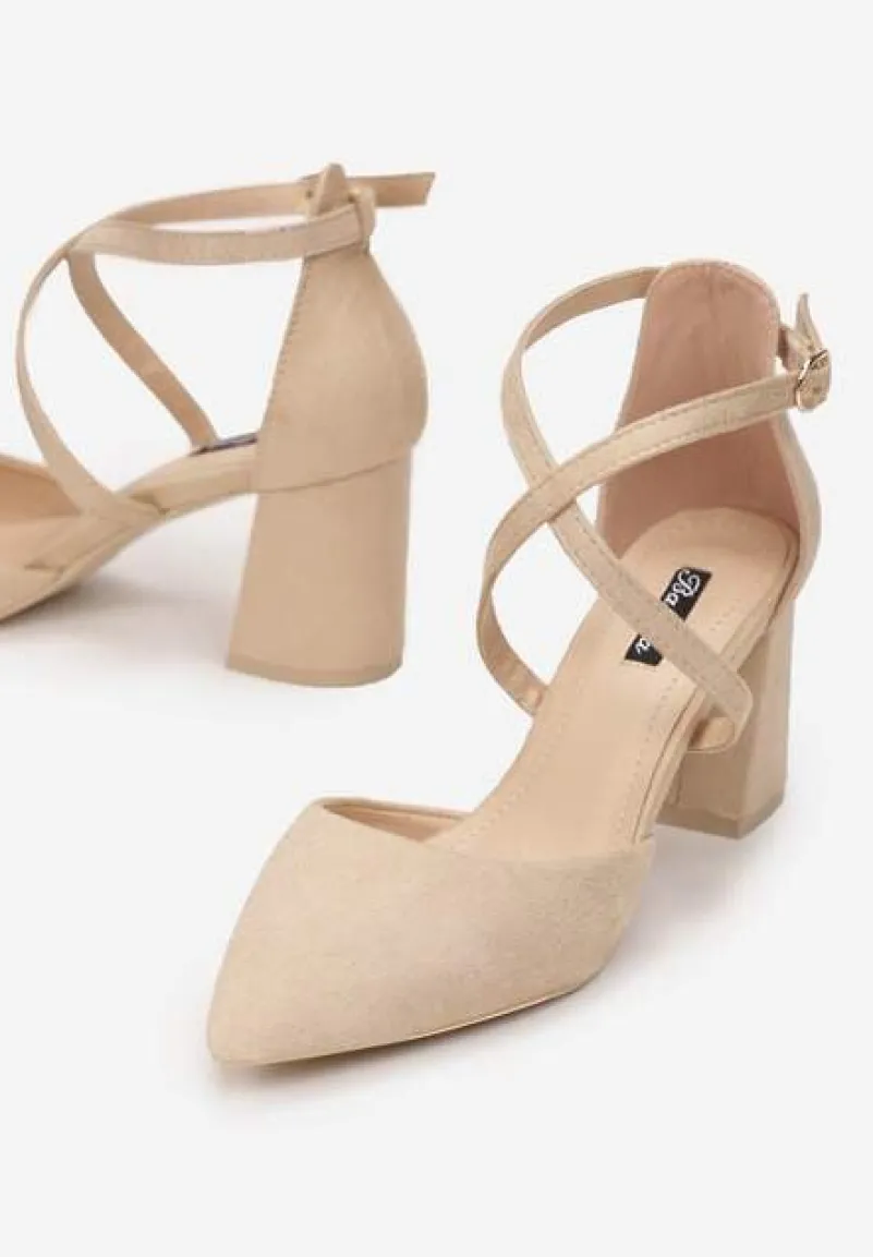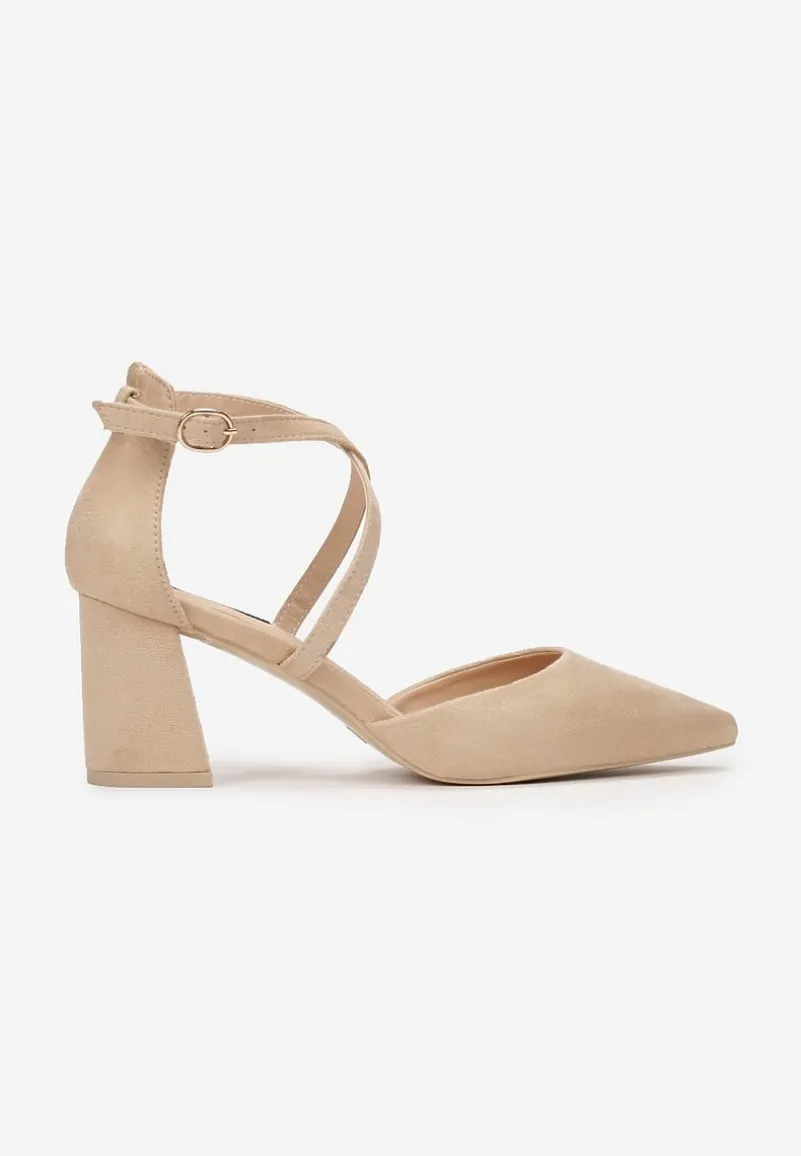 Czółenka Alexthise na obcasie typu stożek, z noskiem w szpic. Pięta i palce zakryte, boki otwarte. Zapinane na wysokości kostki na pasek ze sprzączką. Na wysokości śródstopia skrzyżowane, cienkie paseczki. Wykonane z ekozamszu. Eleganckie i kobiece, dopasujesz je do wielu stylizacji. Sugerujemy wybór rozmiaru o 1 mniejszego.
