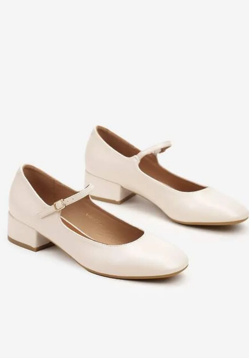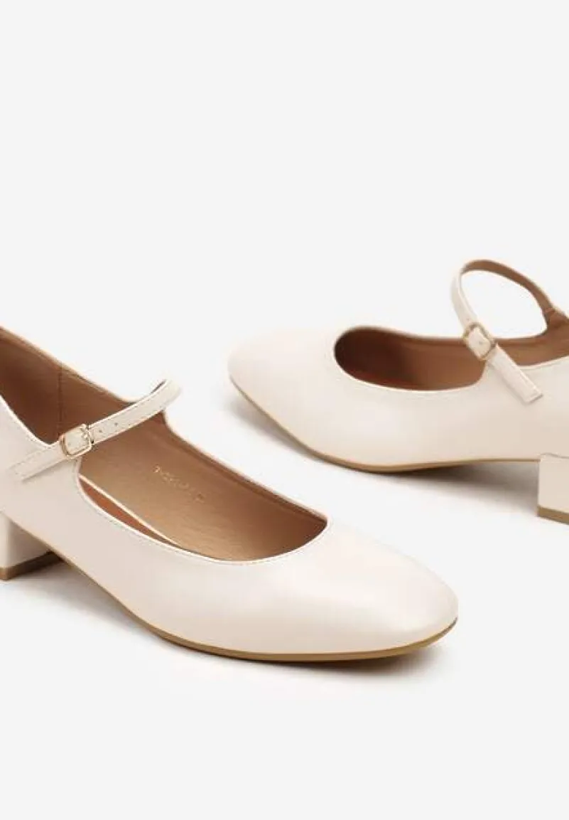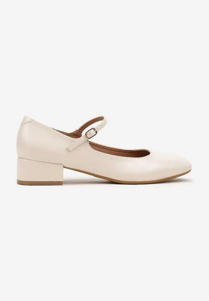 Beżowe Czółenka na Słupku Mary Jane Ozdobione Paskami Omevira