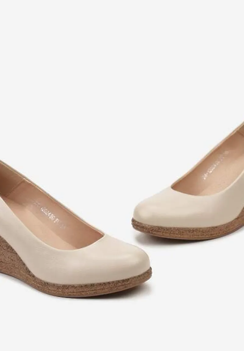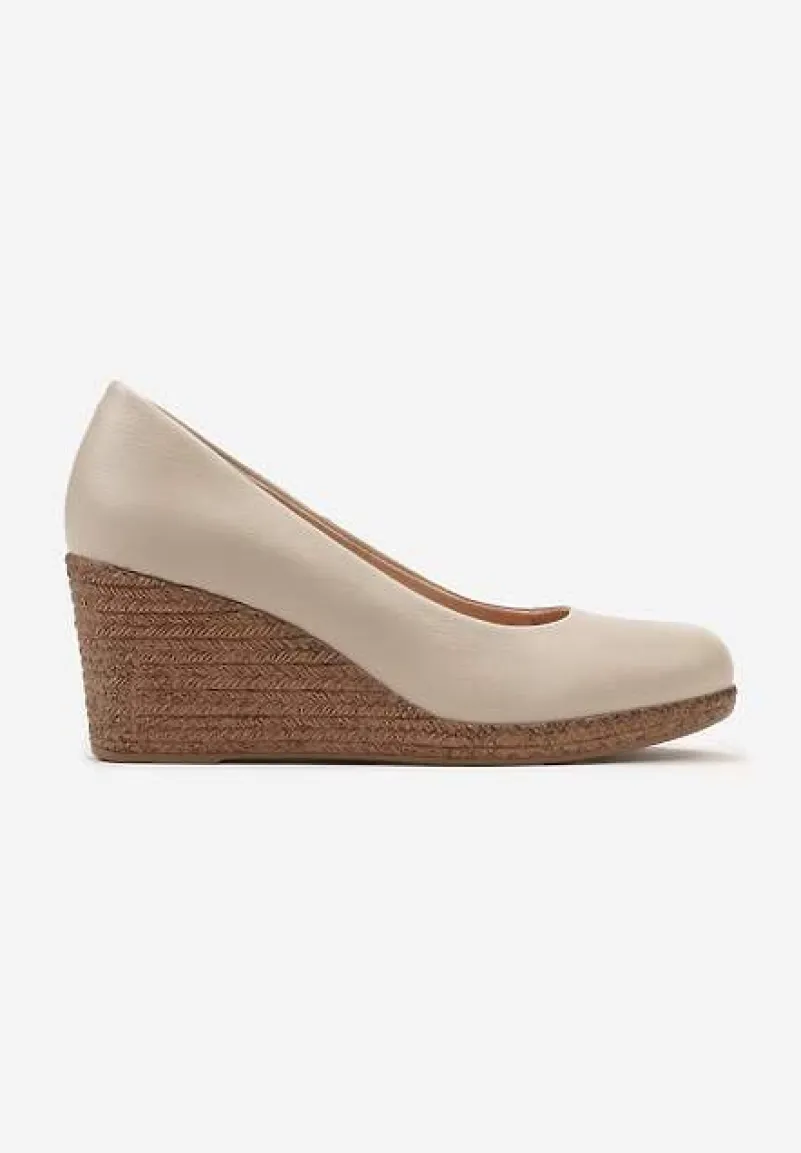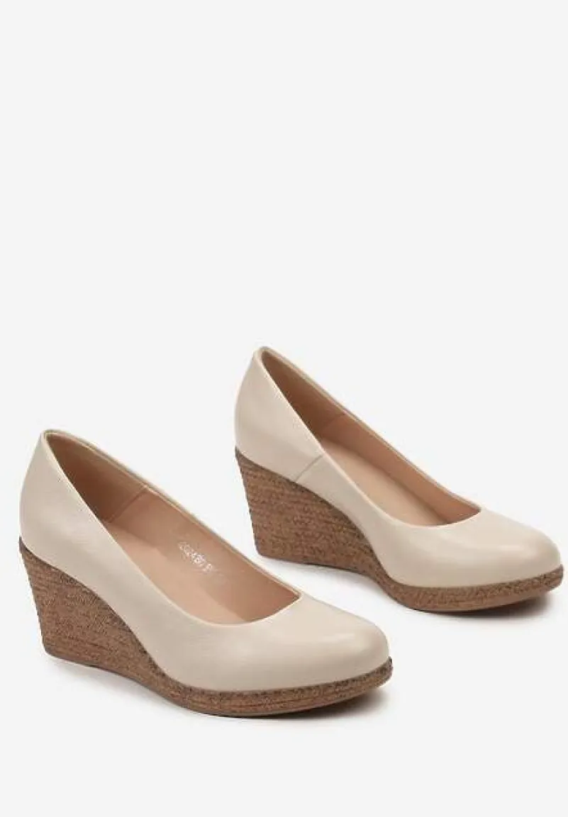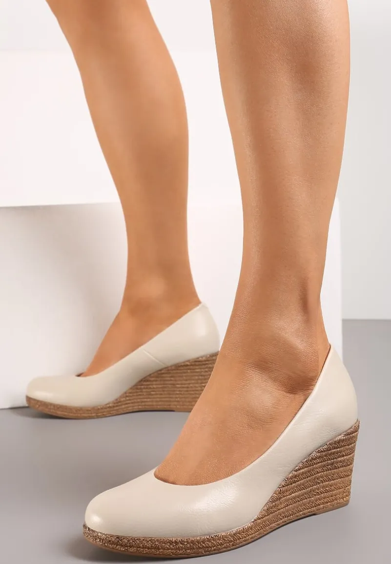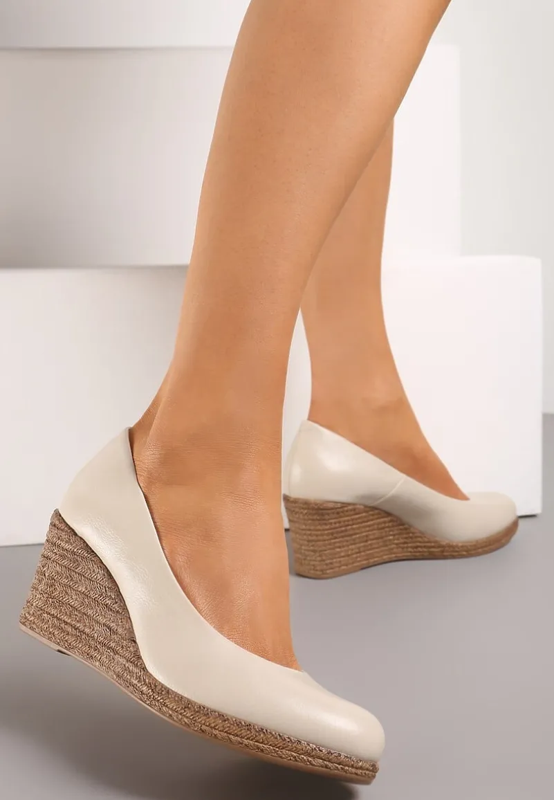 Klasyczne czółenka z ekozamszu osadzone na koturnie z lekko połyskującą plecionką i skórzaną wkładką. Będą doskonałym wyborem do stylizacji ze spódnicą ołówkową lub garniturowym kompletem.