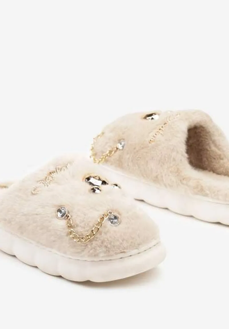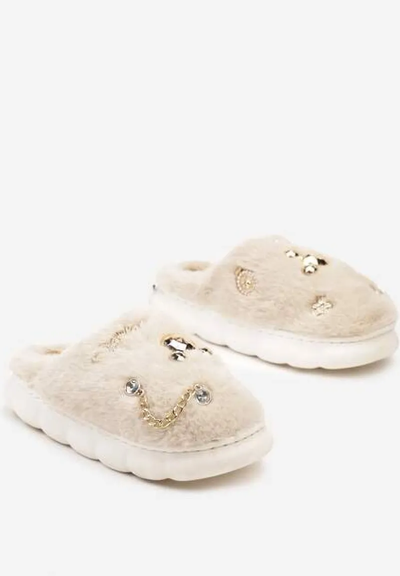 Rozkoszne kapcie Reanivia to esencja domowego stylu. Elegancki, płaski obcas zapewnia stabilność. Zdobienia w postaci łańcuszka i cyrkonii dodają im subtelnego blasku, sprawiając, że nawet w zaciszu własnego domu możesz się poczuć wyjątkowo. Załóż je do satynowych szortów, aby podkreślić swoje oblicze, lub zestaw z eleganckim dresowym kompletem, który śmiało poniesie Cię przez weekendowe relaksacyjne rytuały.