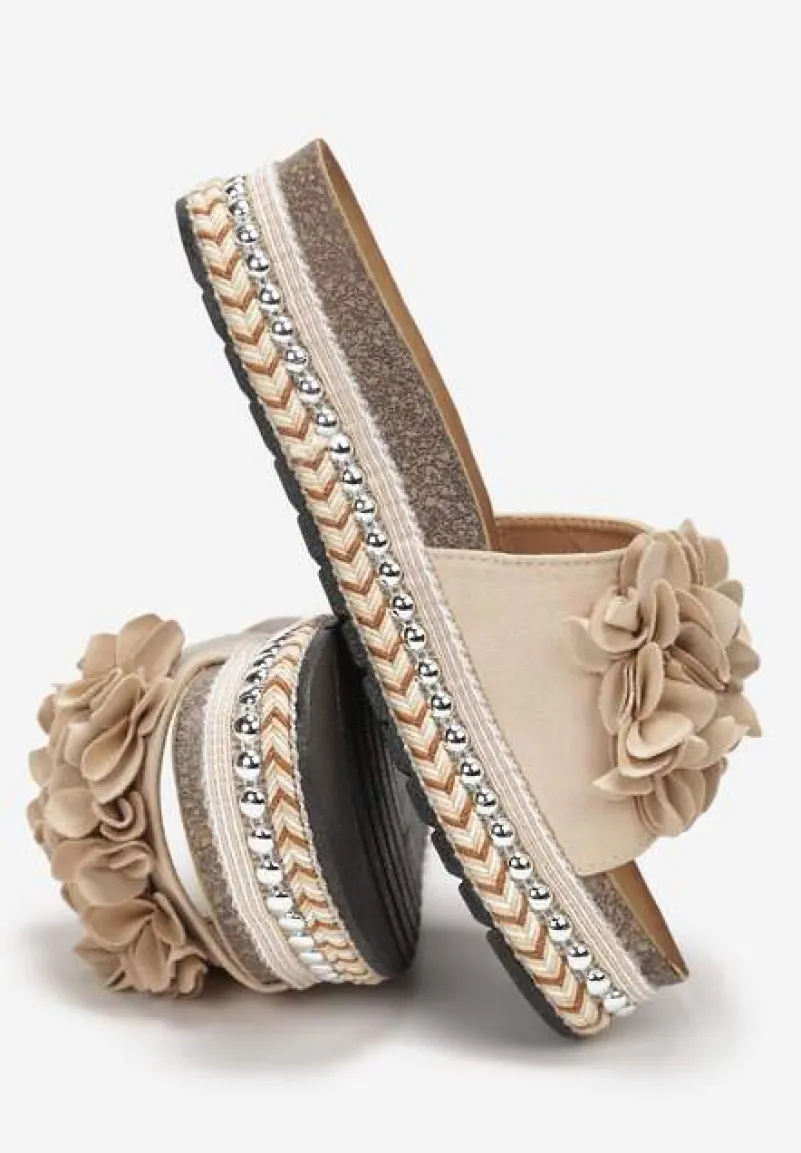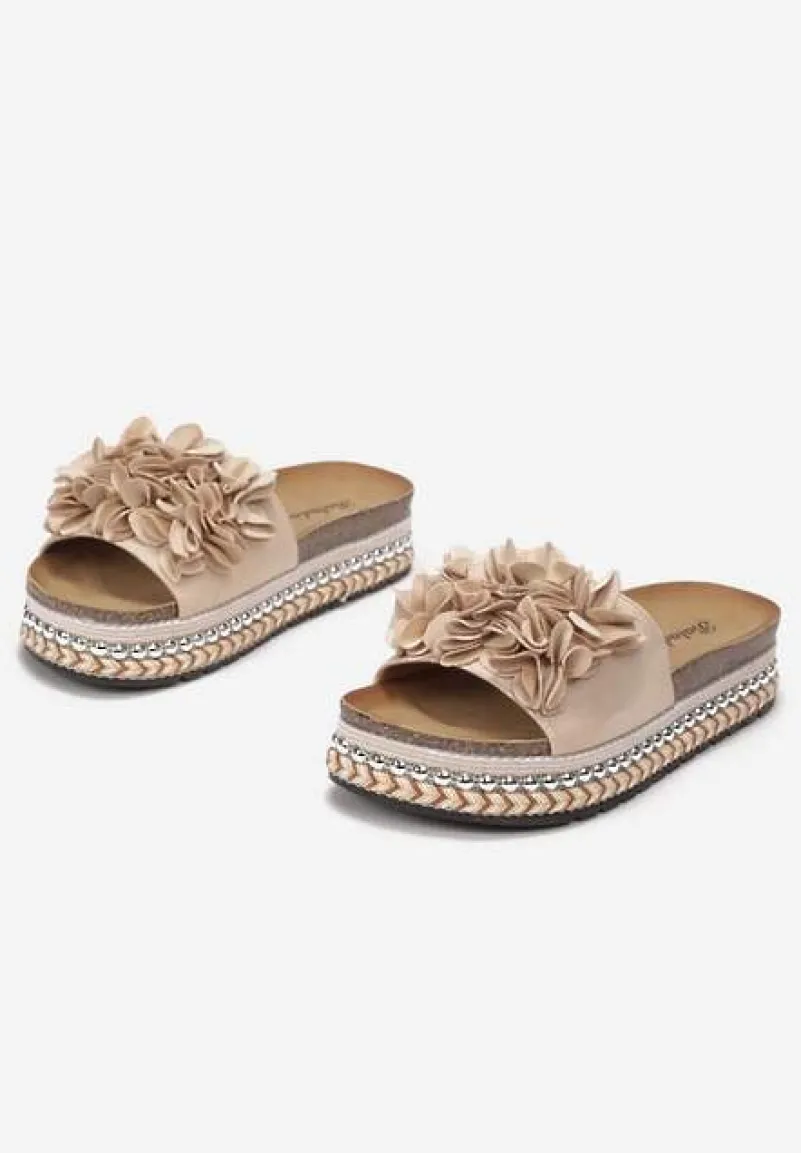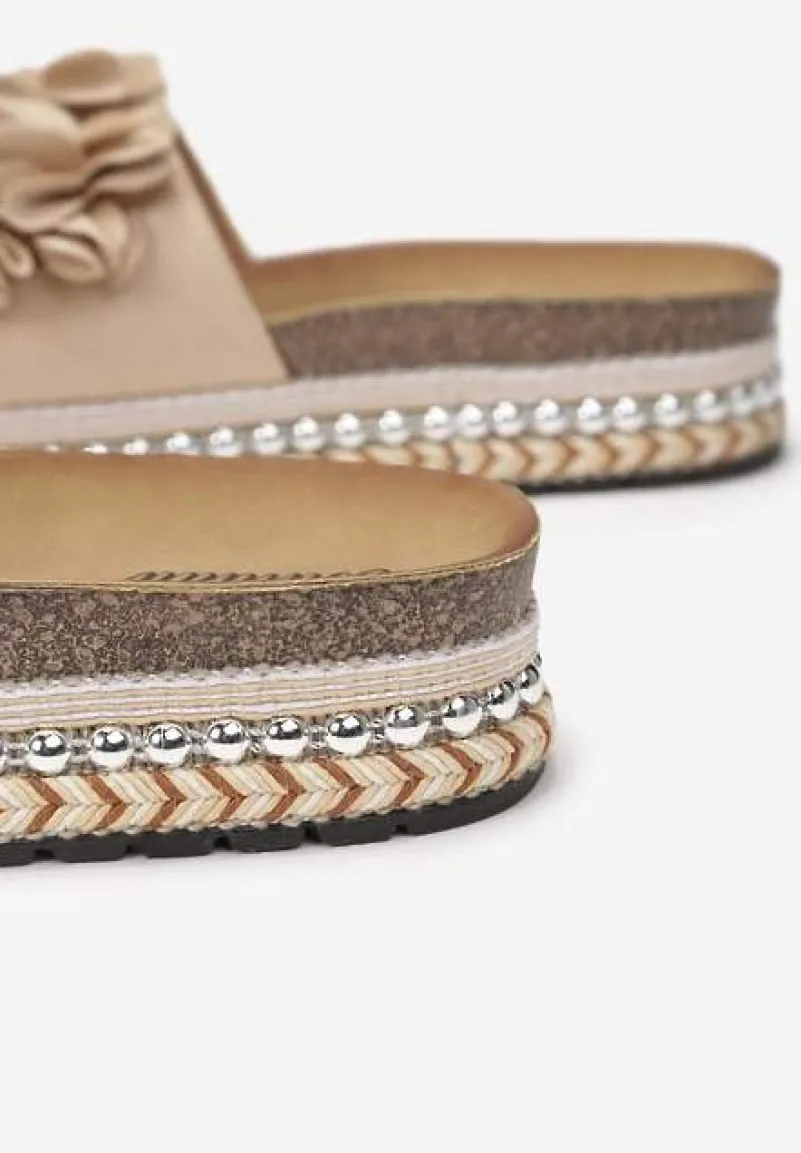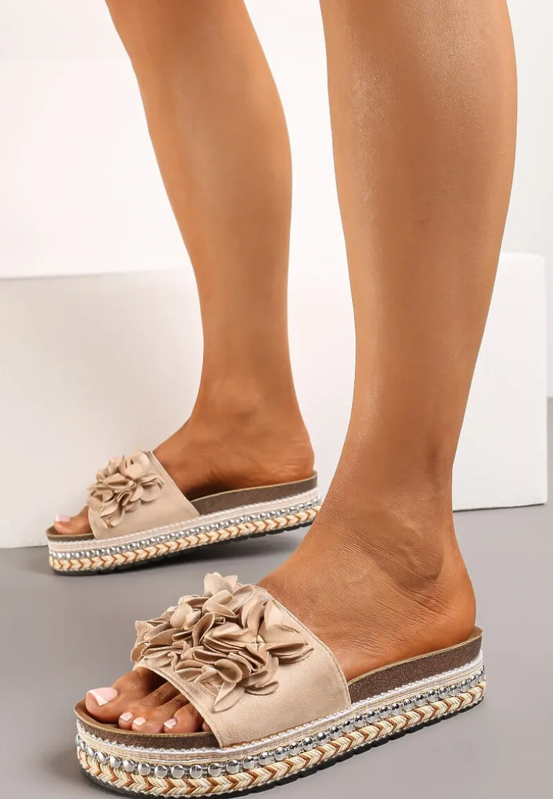 Klapki Althala wsuwane, z zaokrąglonym noskiem i profilowaną podeszwą. Wokół stopy szeroki pasek wykonany z ekozamszu. Przód dodatkowo zdobiony kwiatową dekoracją. Osadzone na korkowej platformie zdobionej nitami oraz przeszyciami. To klapki, które przykują uwagę każdej fanki romantycznych i letnich stylizacji! Sugerujemy wybór rozmiaru o 1 większego.