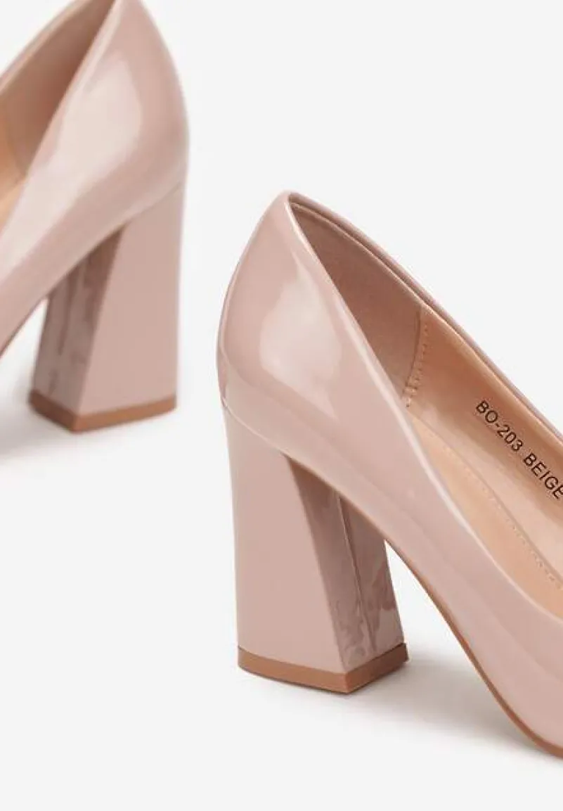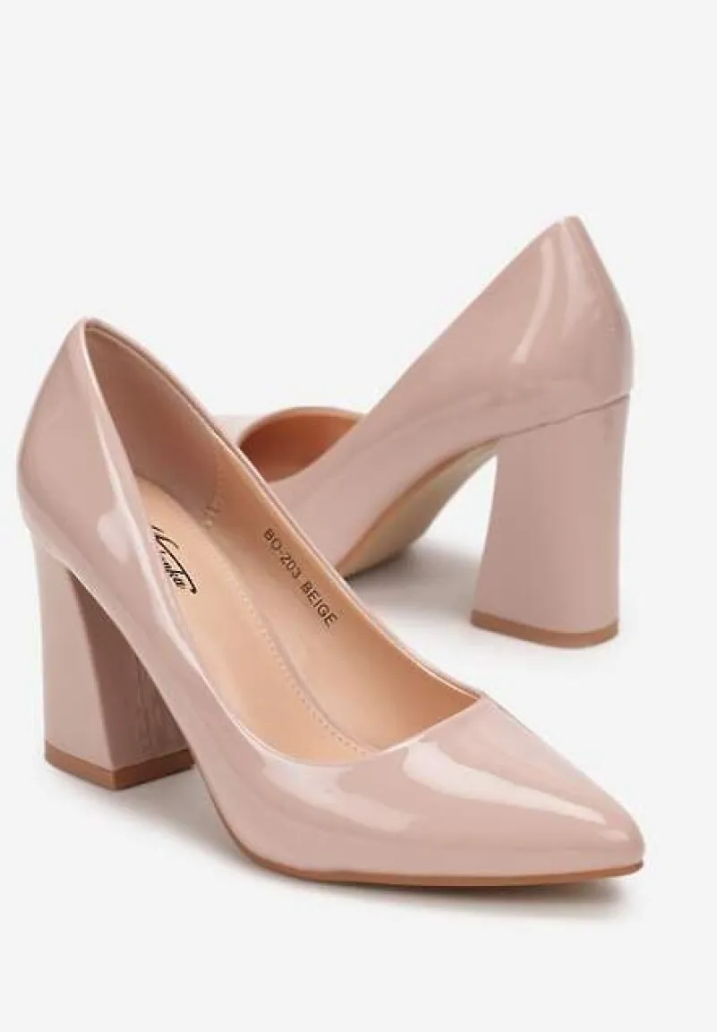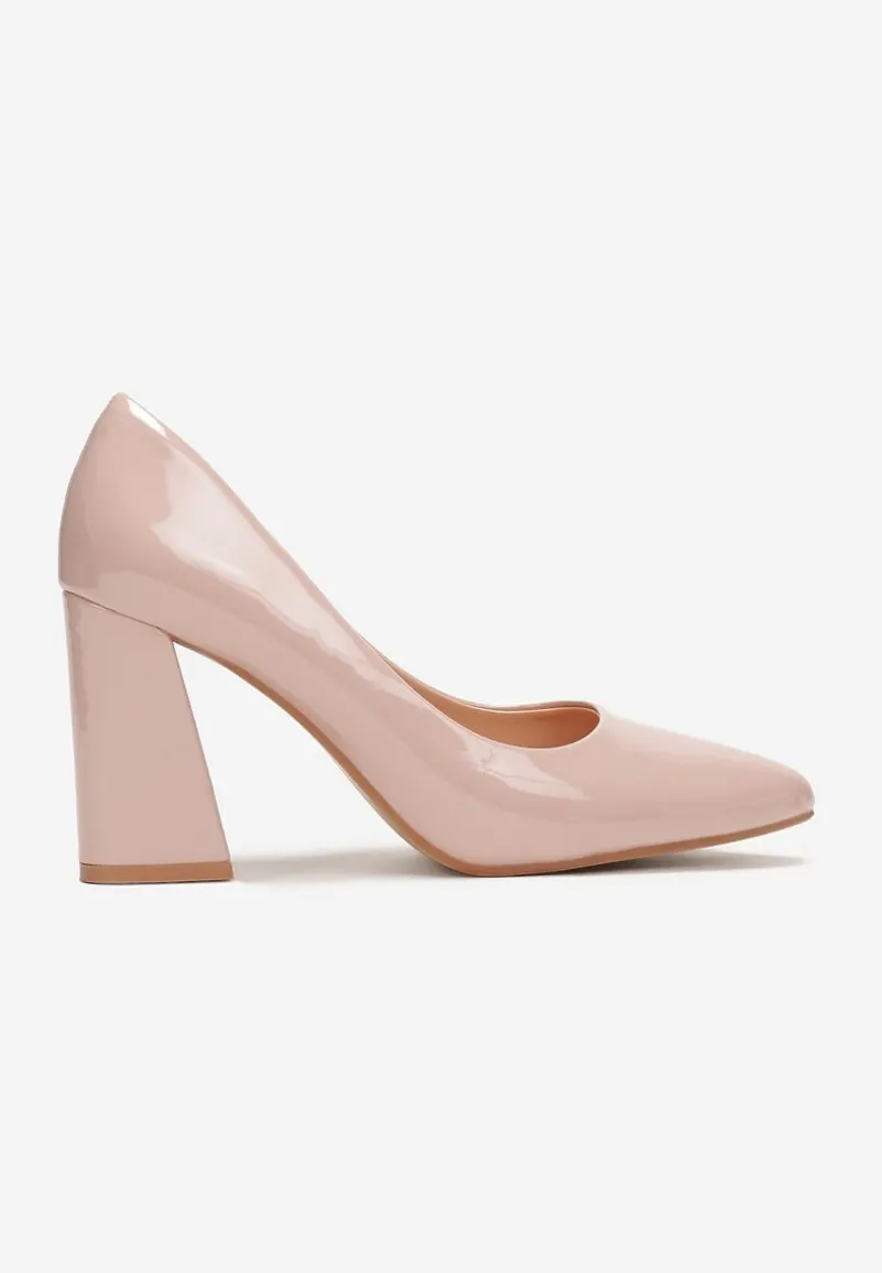 Lakierowane czółenka Miriamans są wykonane z ekoskóry. Posiadają szpiczasty nosek, a obcas to stożkowy słupek.