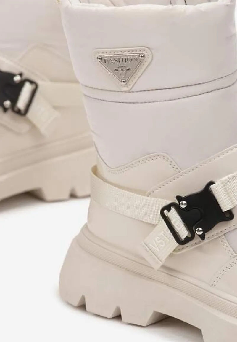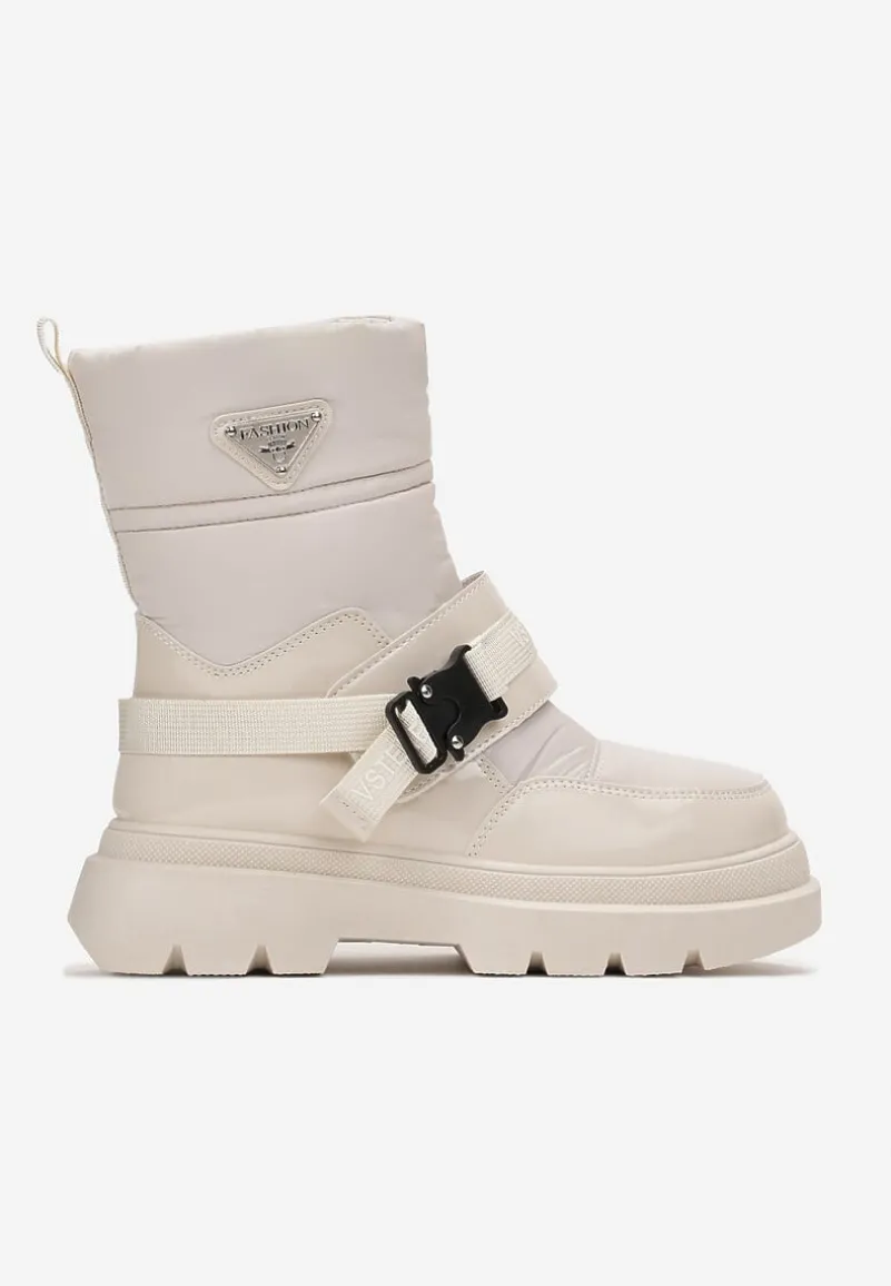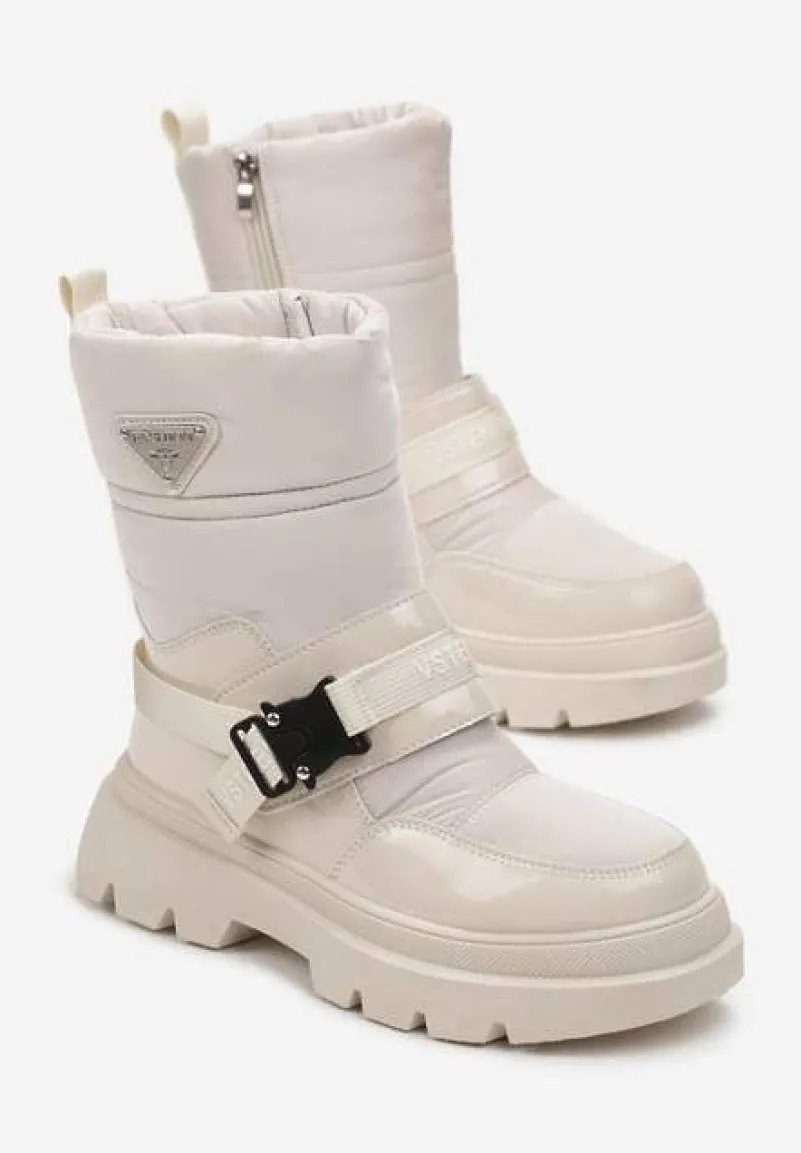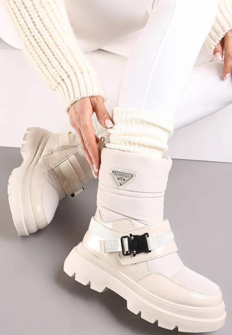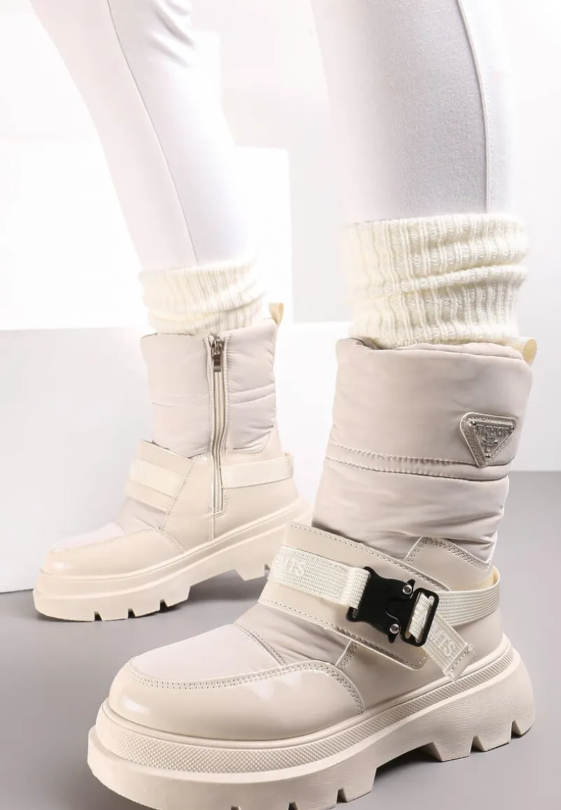Lakierowane śniegowce Fesiva — cholewka za kostkę, osadzone na grubej podeszwie.