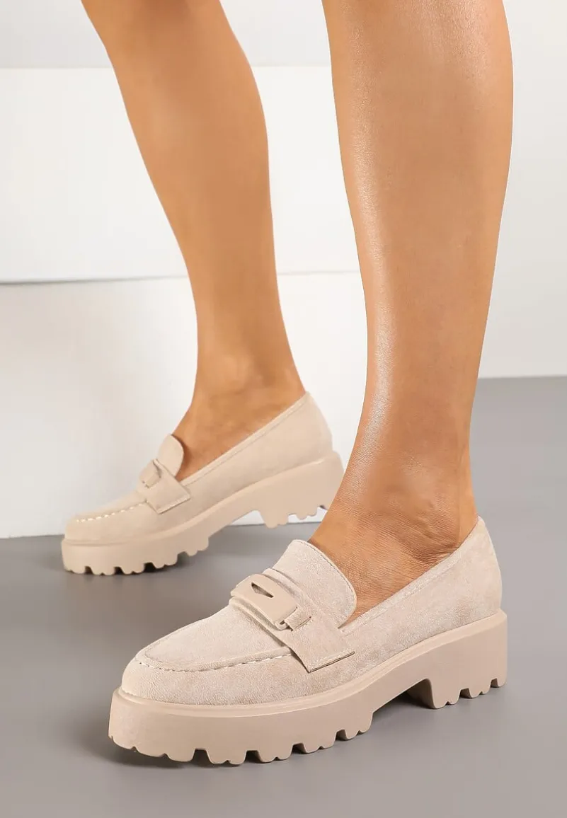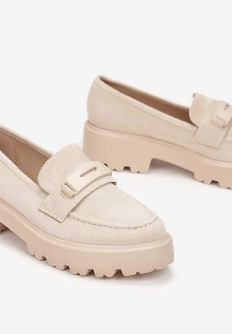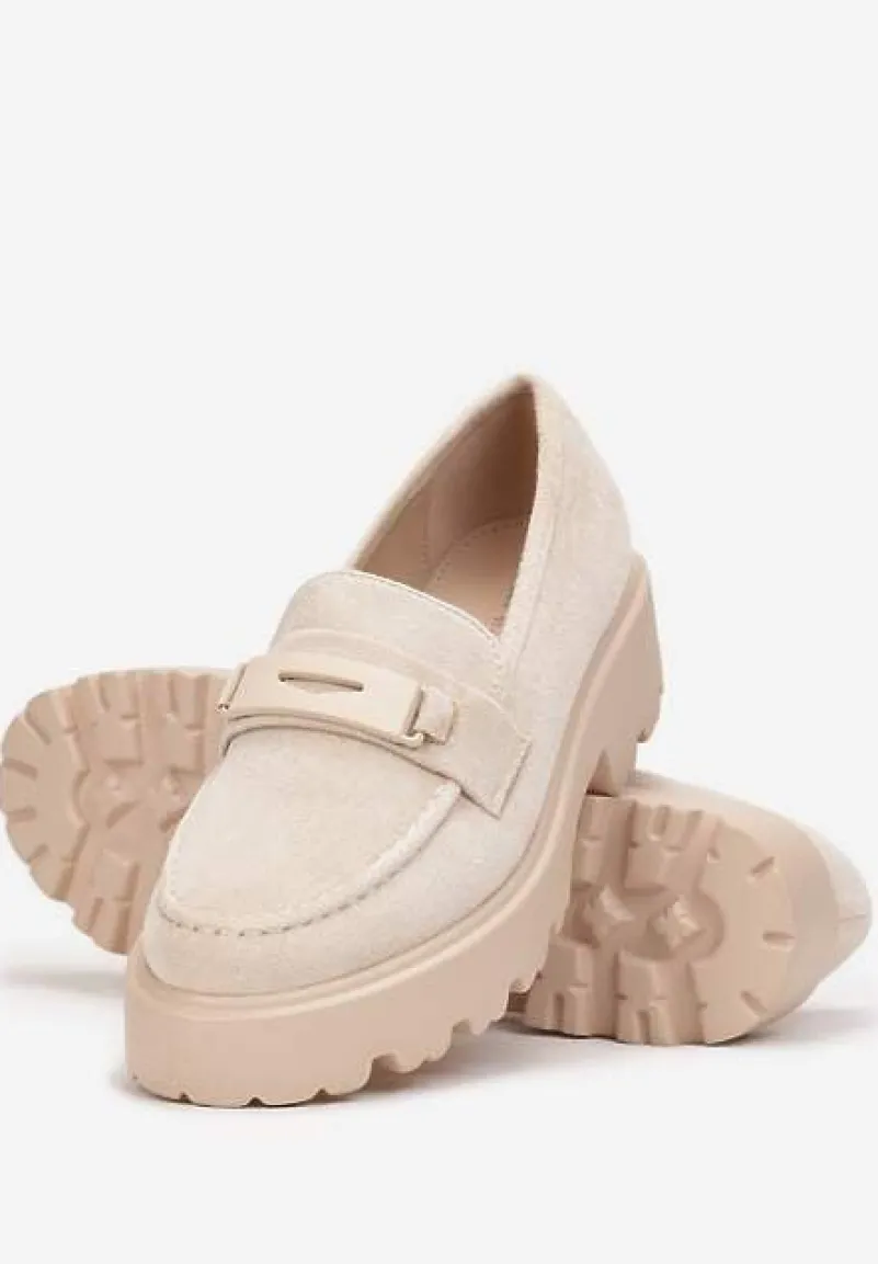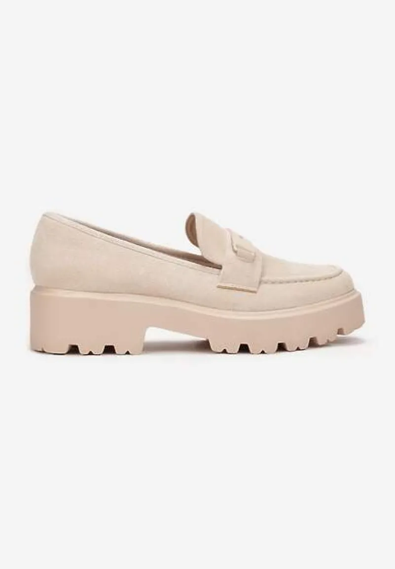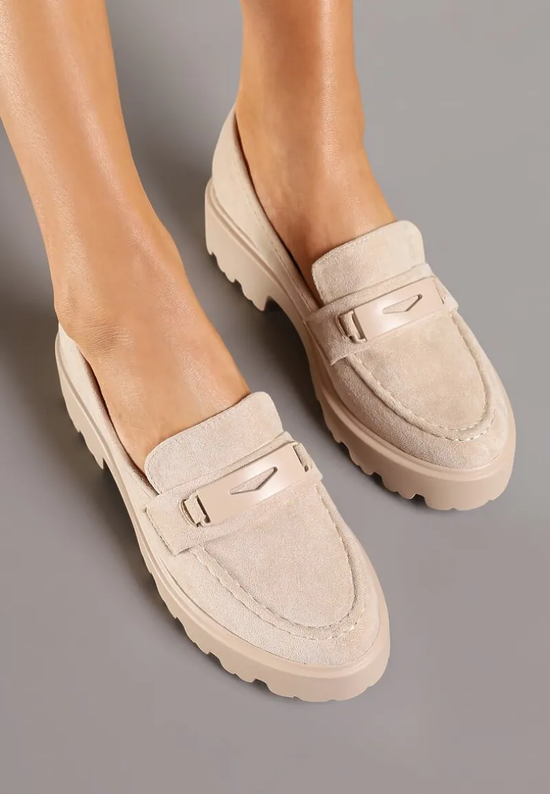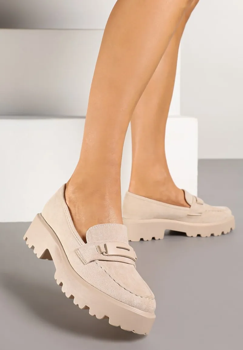 Mokasyny Hamaira wykonane z materiału imitującego zamsz. W środku wkładka z ekoskóry. Osadzone na grubej podeszwie z wycięciami. Cholewka przed kostkę ozdobiona ciekawymi przeszyciami i ozdobnym paskiem. Modne mokasyny Hamaira idealne do spodni i sukienek.
