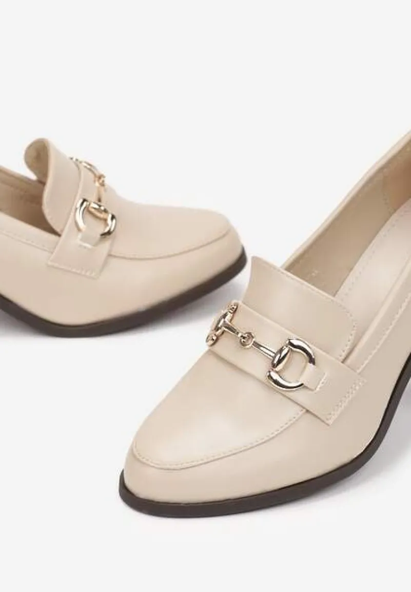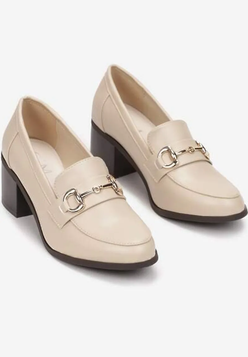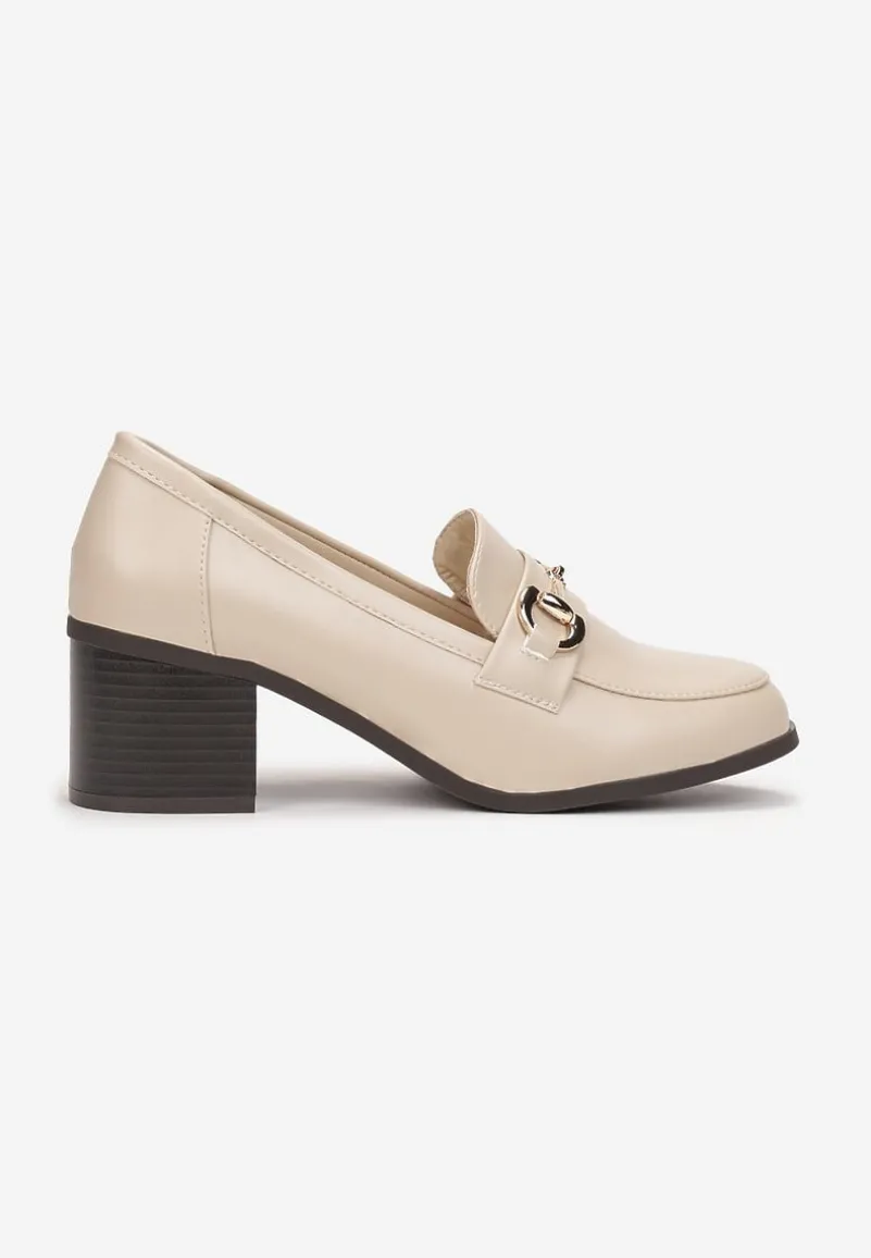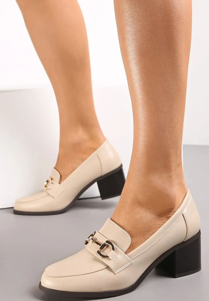 Mokasyny Maffale ze smukłym okrągłym noskiem, udekorowanym klamerką. Osadzone na niewysokim słupku, wsuwane.