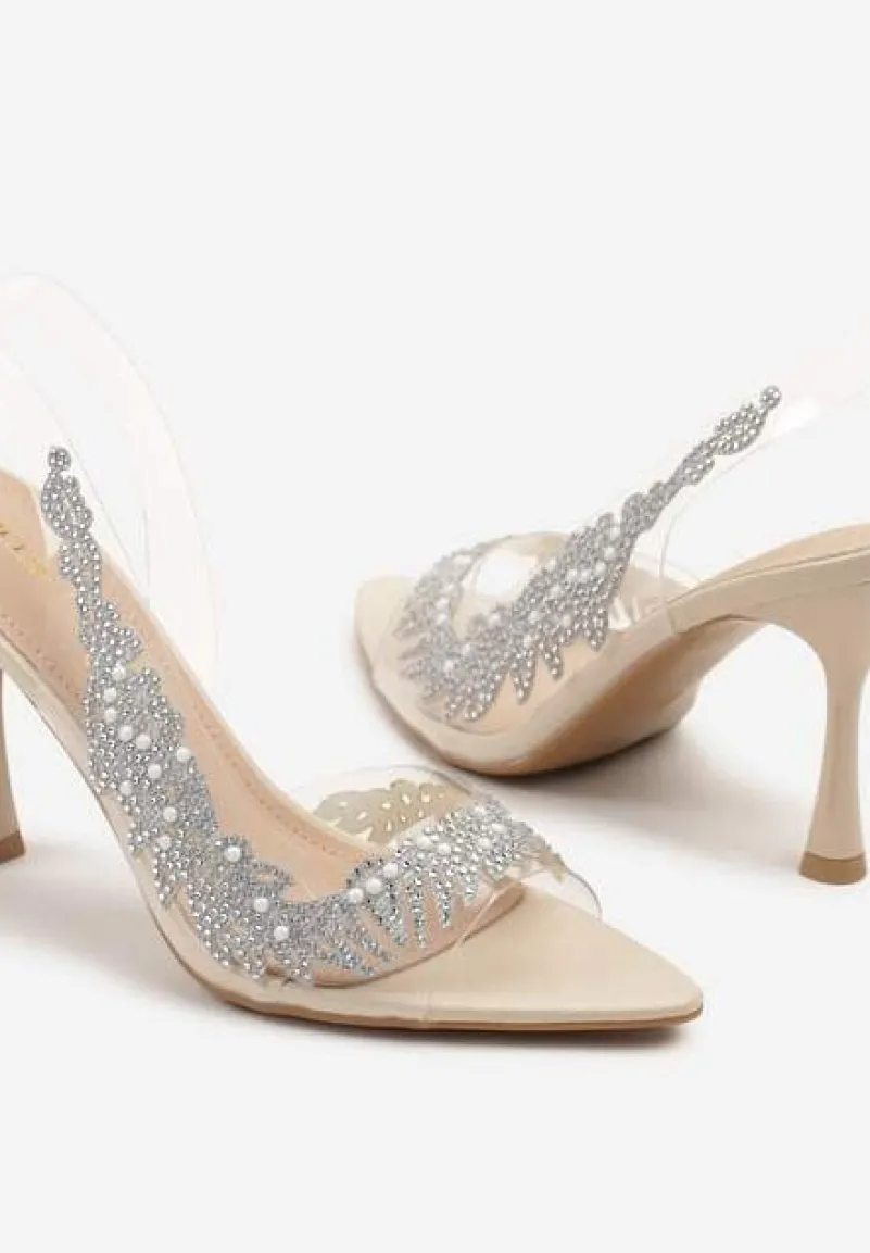 Beżowe Przezroczyste Sandały na Szpilce Vices ze Skórzaną Wkładką i Cyrkoniami Oviassa