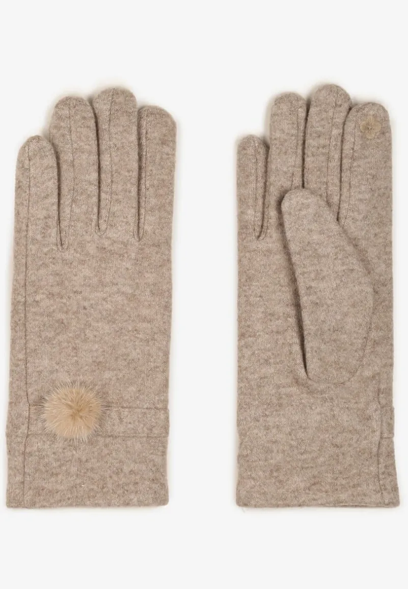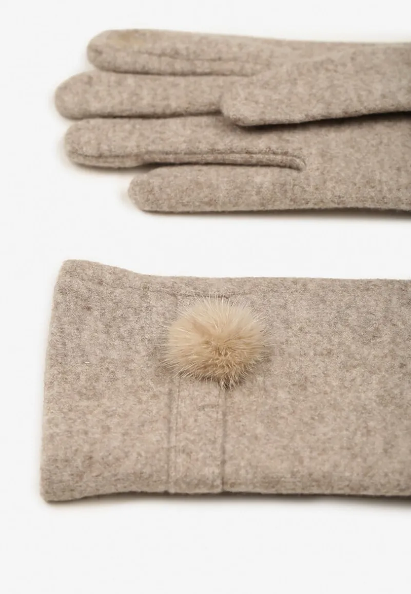 Beżowe Rękawiczki Dzianinowe z Dodatkiem Bawełny Ozdobione Pomponem Zinnatra