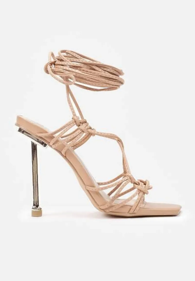 na wysokim, cienkim obcasie. Z modną cholewką wykonaną z kompozycji rzemyków. Kwadratowy nosek. Wiązane wokół kostki lub łydki, w zależności od preferencji. Wykonane z ekoskóry, razem z wkładką. Eleganckie sandały z rzemykami to must have każdej fashionistki! Świetnie pasują do sukienek bodycon i torebek na łańcuszku.
