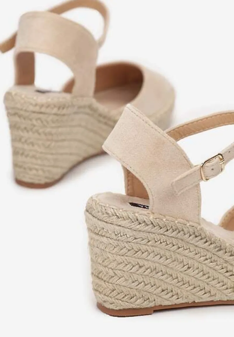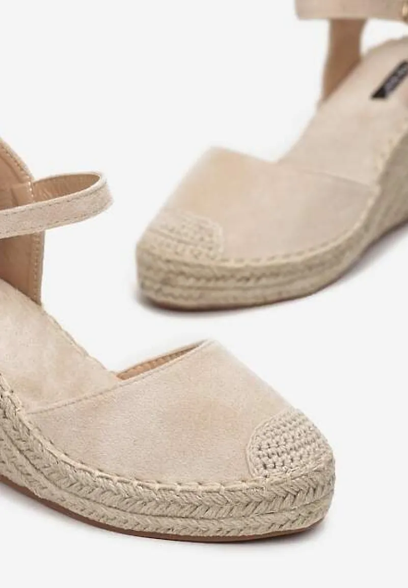 Sandały Assaciane z paskami trzymającymi stopę przy pięcie i kostce. Zapinane na sprzączkę, odkryte na śródstopiu, zabudowane na okrągłym nosku. Ozdobione z przodu wstawką z plecionki. Na wysokim koturnie oraz platformie, które pokryte zostały warkoczykami z juty. Wykonane z ekozamszu. Espadryle na koturnie świetnie połączą się ze zwiewną, kwiatową sukienką.