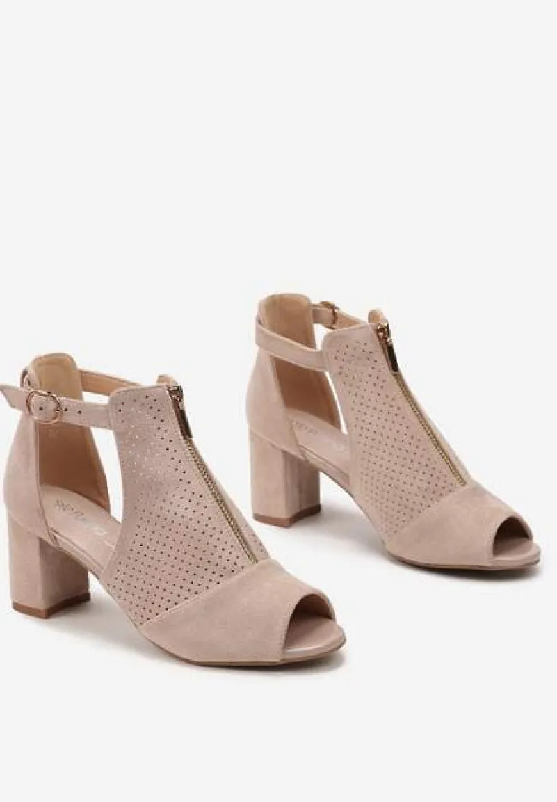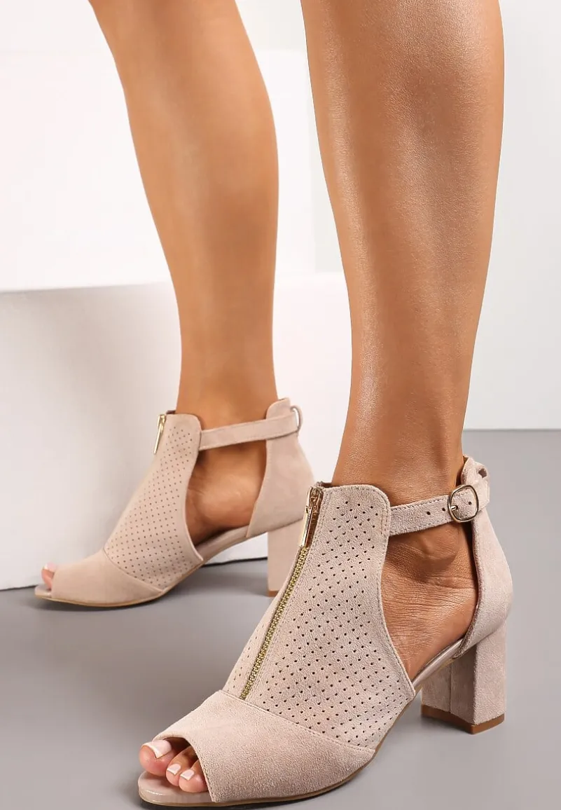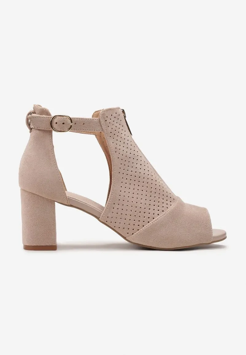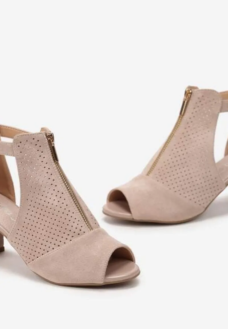 Beżowe Sandały na Obcasie z Suwakiem Zdobione Perforacją i Wycięciami c