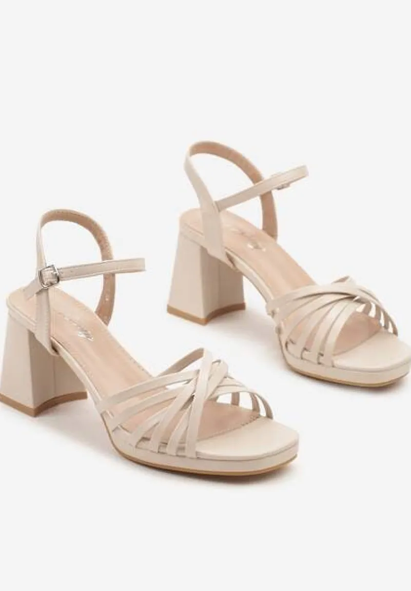 Beżowe Sandały na Słupku Ozdobnione Paskami Nevarella