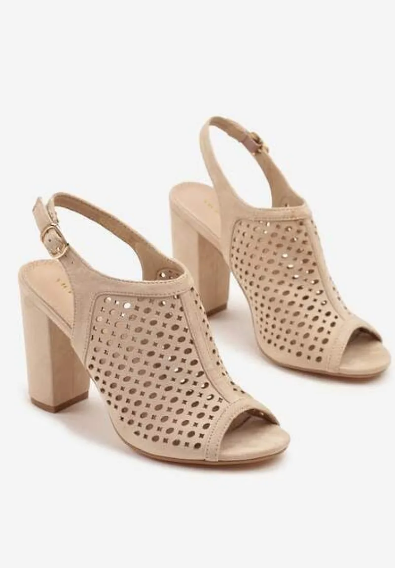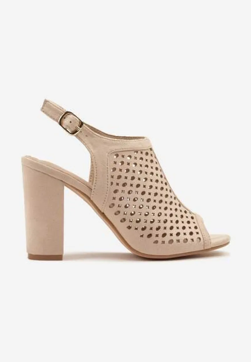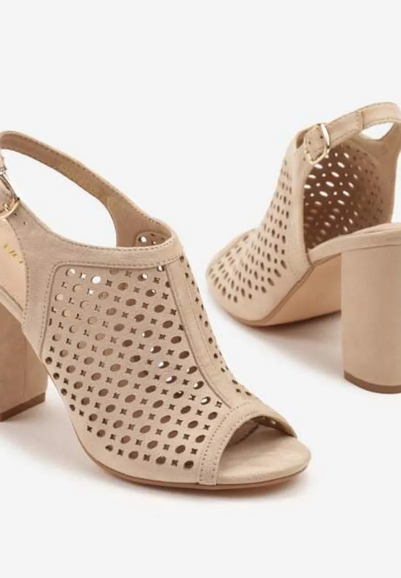 Beżowe Sandały na Słupku z Ażurową Cholewką i Skórzaną Wkładką Linalira