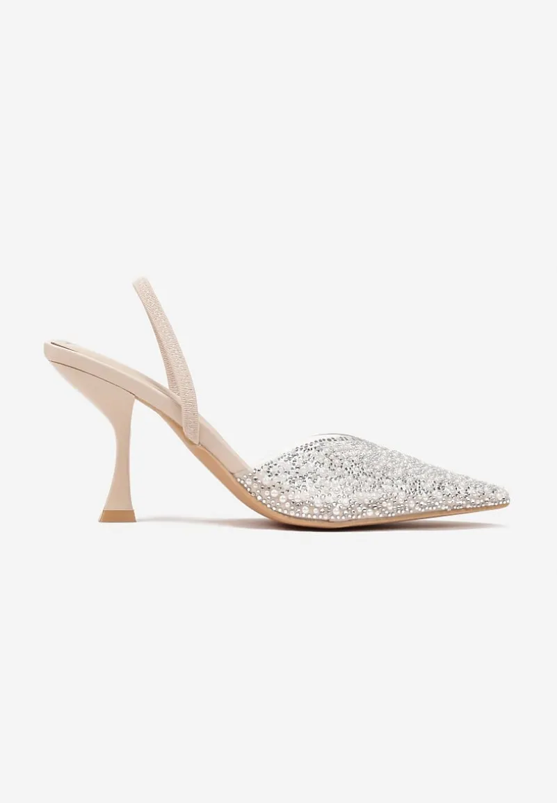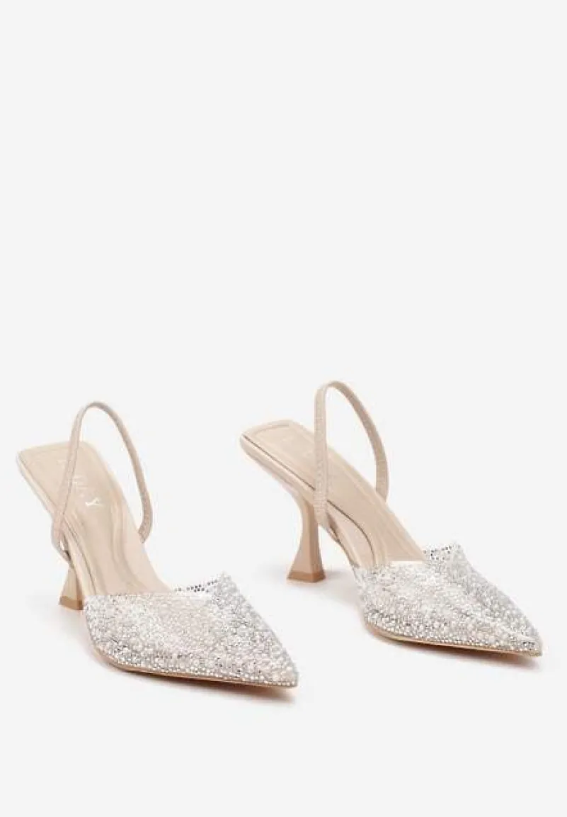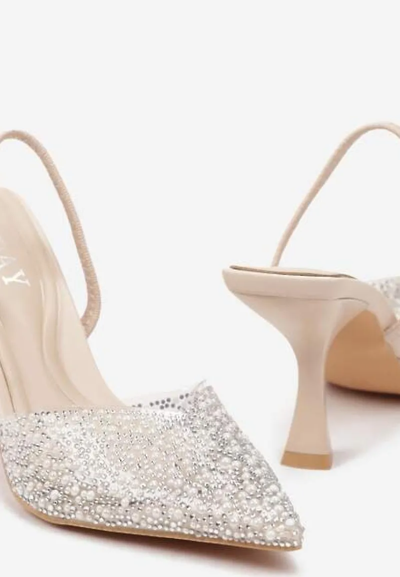 Beżowe Sandały na Szpilce z Przezroczystym Noskiem w Cekiny i Perły Niria
