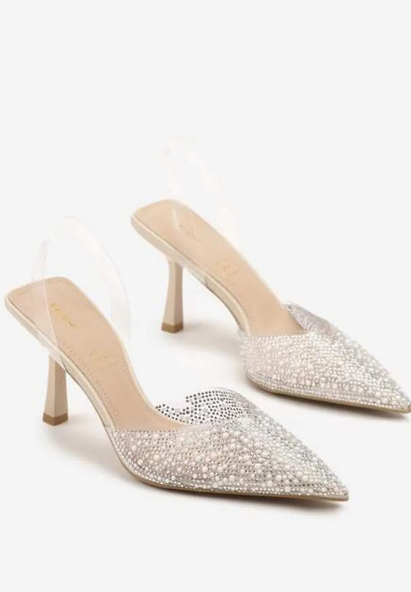 Beżowe Sandały Vices na Szpilce Slingback ze Skórzaną Wkładką i Cyrkoniami Ovifa