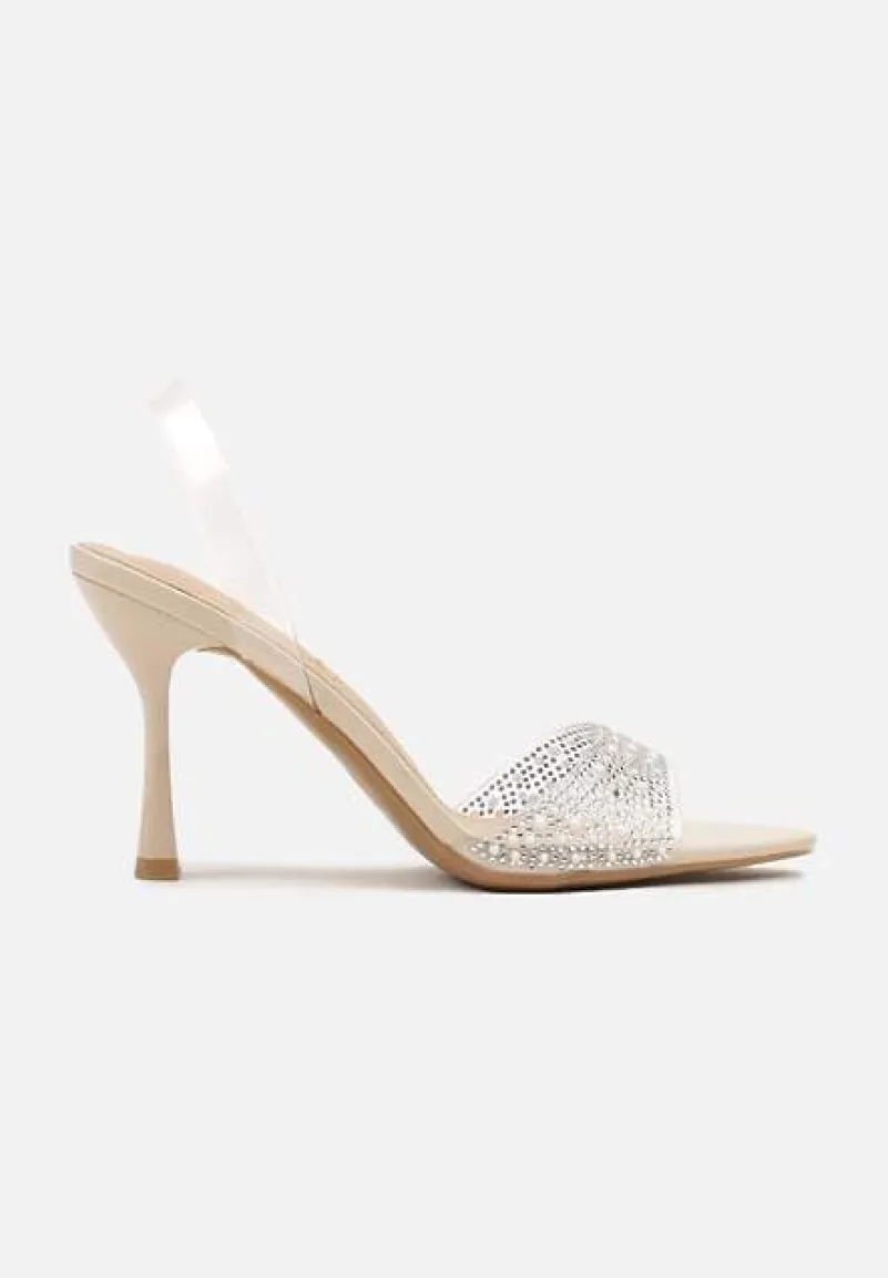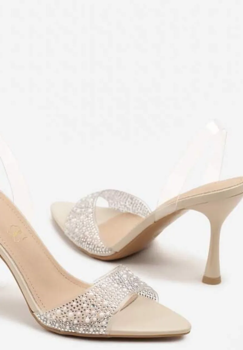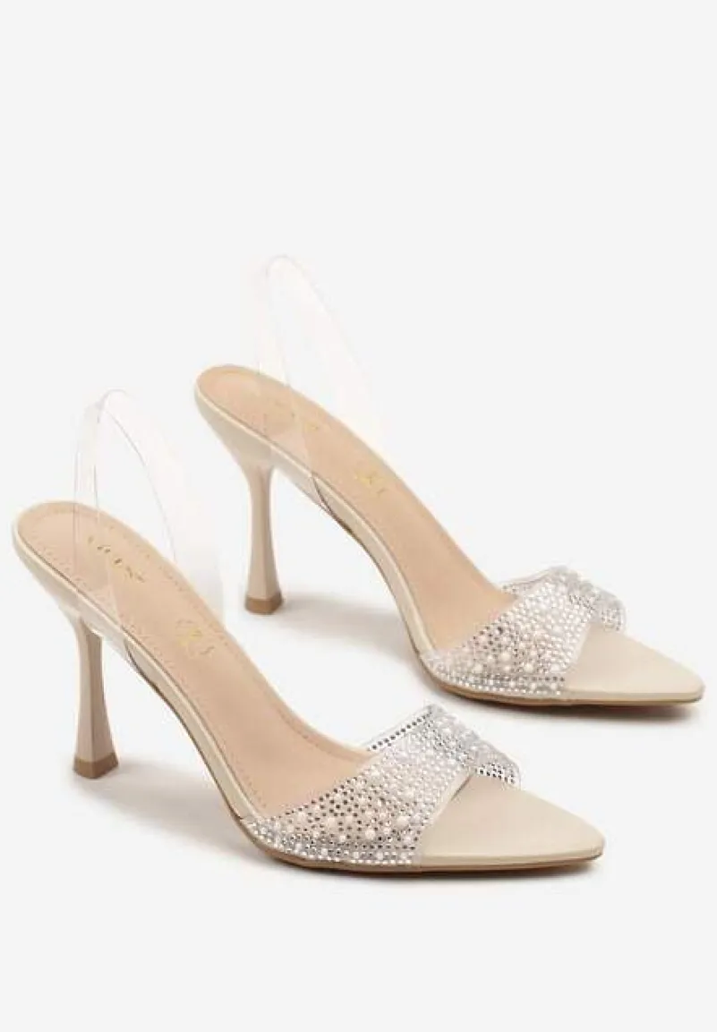 Beżowe Sandały Vices na Szpilce z Wkładką ze Skóry Naturalnej z Cyrkoniami Lumerelle