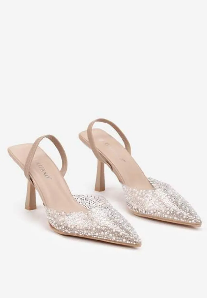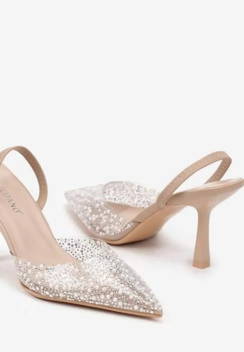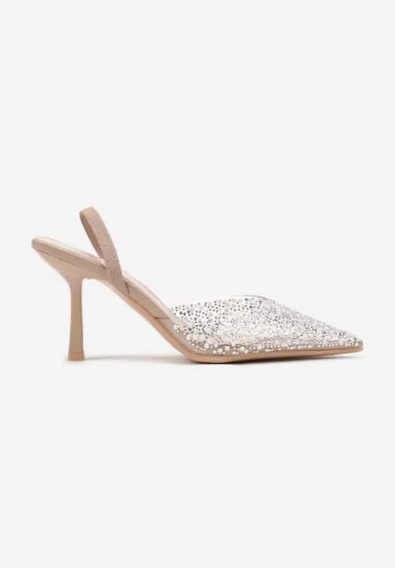 Beżowe Szpilki z Odkrytą Piętą Transparentną Cholewką I Cyrkoniami Arstaria