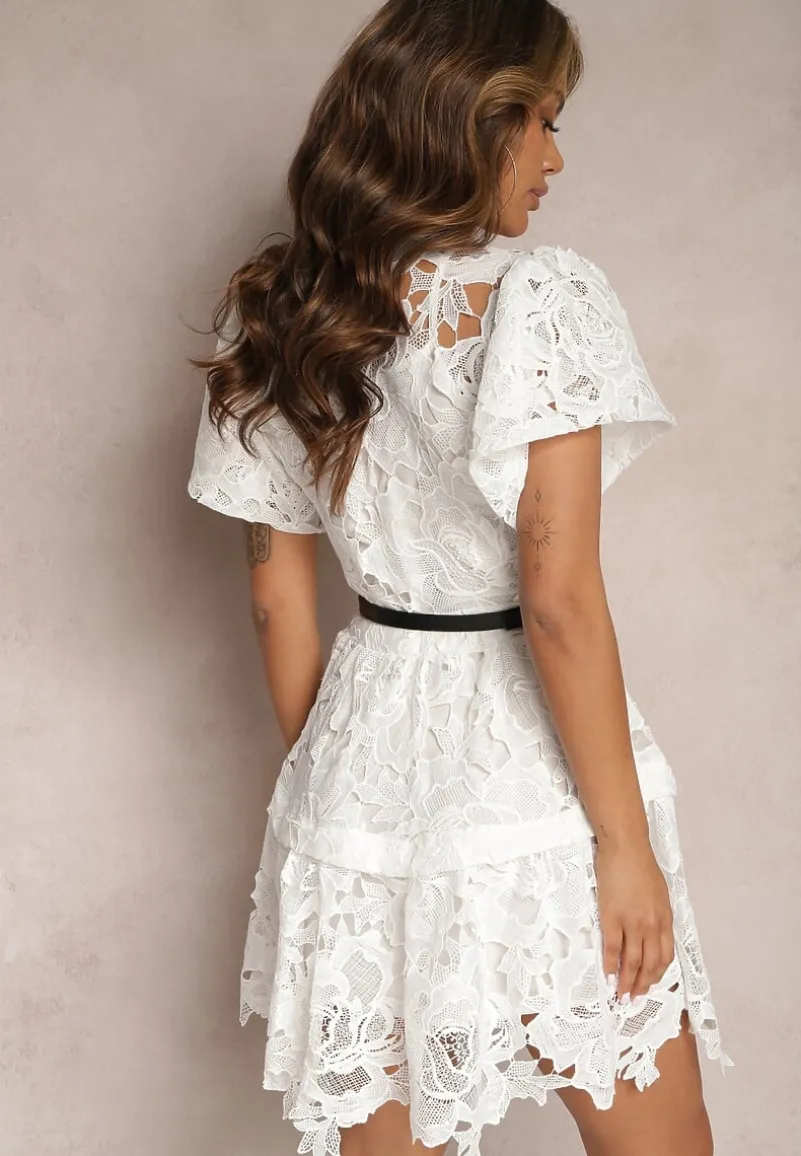 Biała Koszulowa Sukienka Midi z Ażurową Koronką i Paskiem Silira