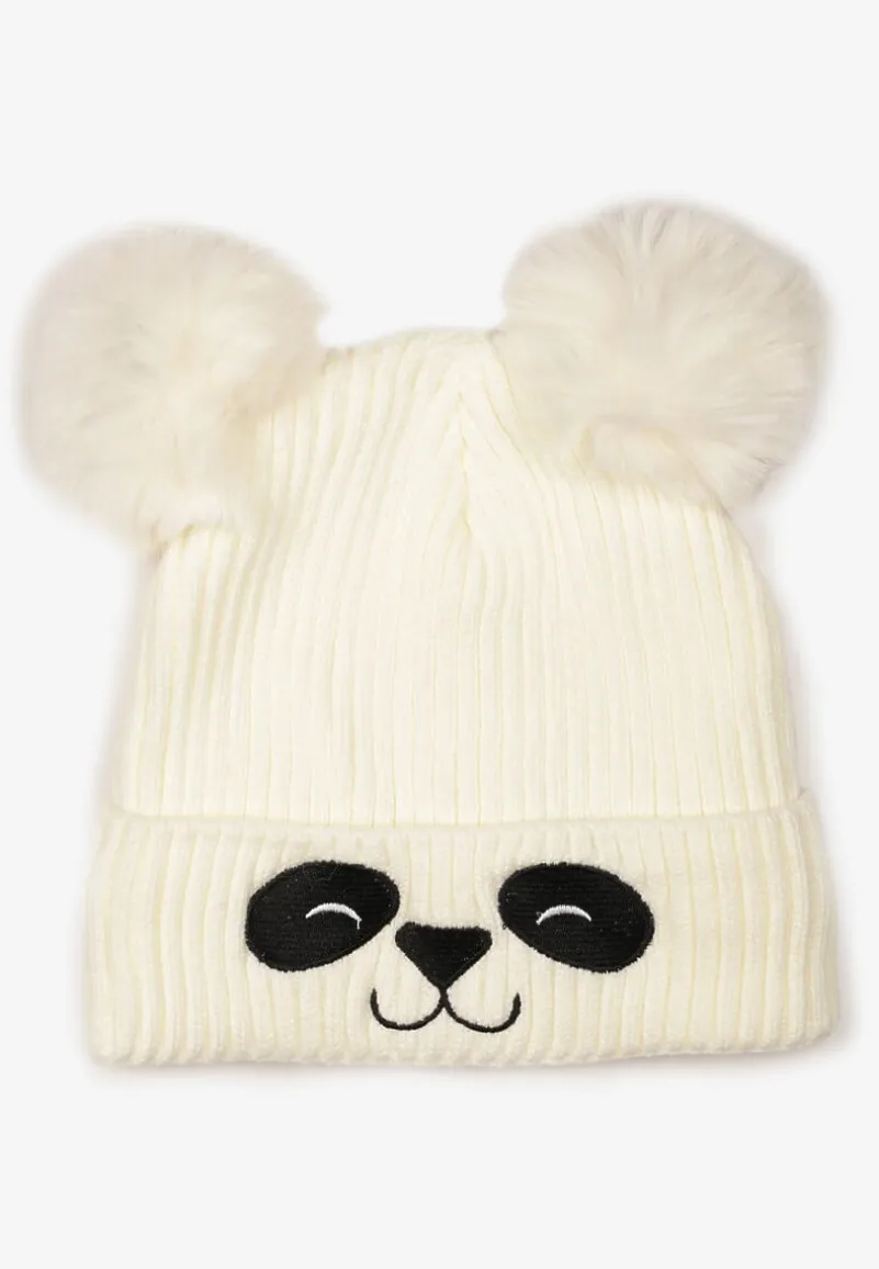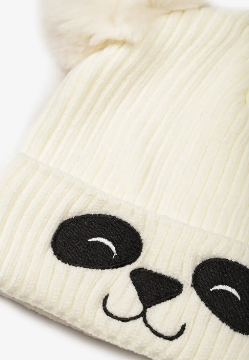 Czapka Shenoy z dwoma pomponami imitującymi uszy i haftowaną buźką misia.