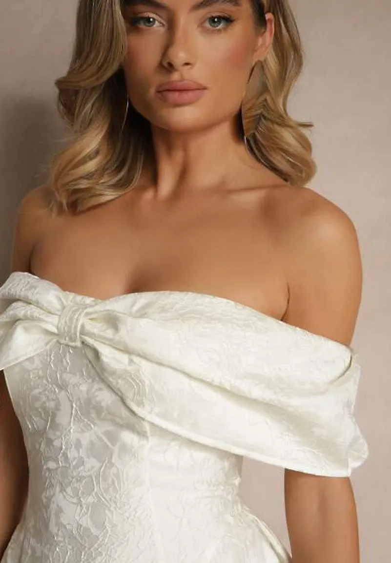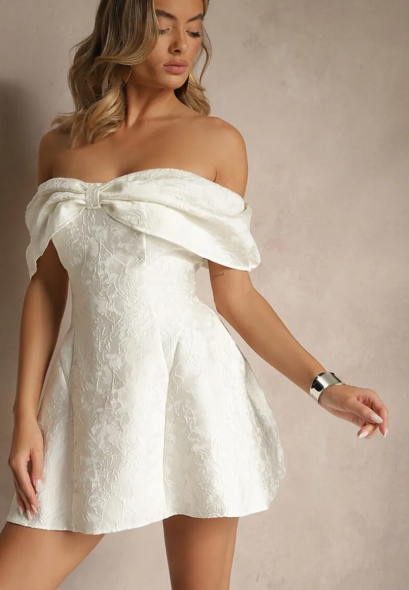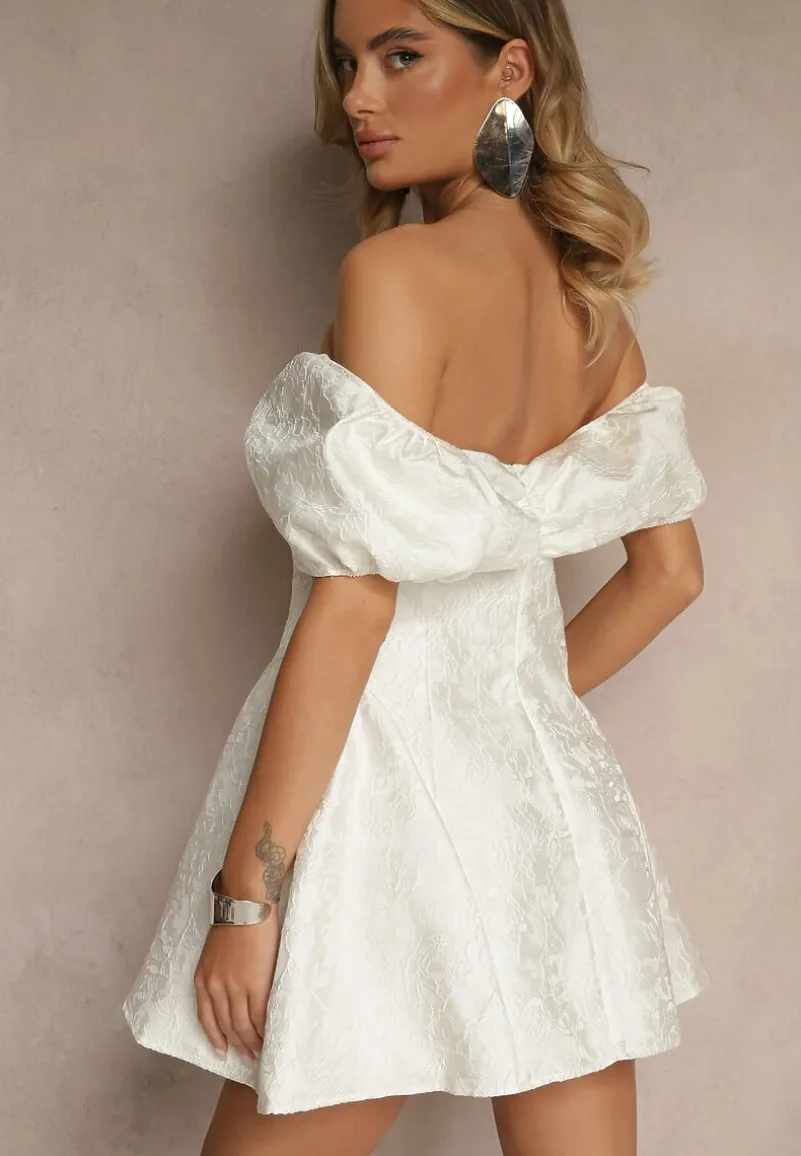 Biała Sukienka Vices z Hiszpańskim Dekoltem i Haftami Fenaleira
