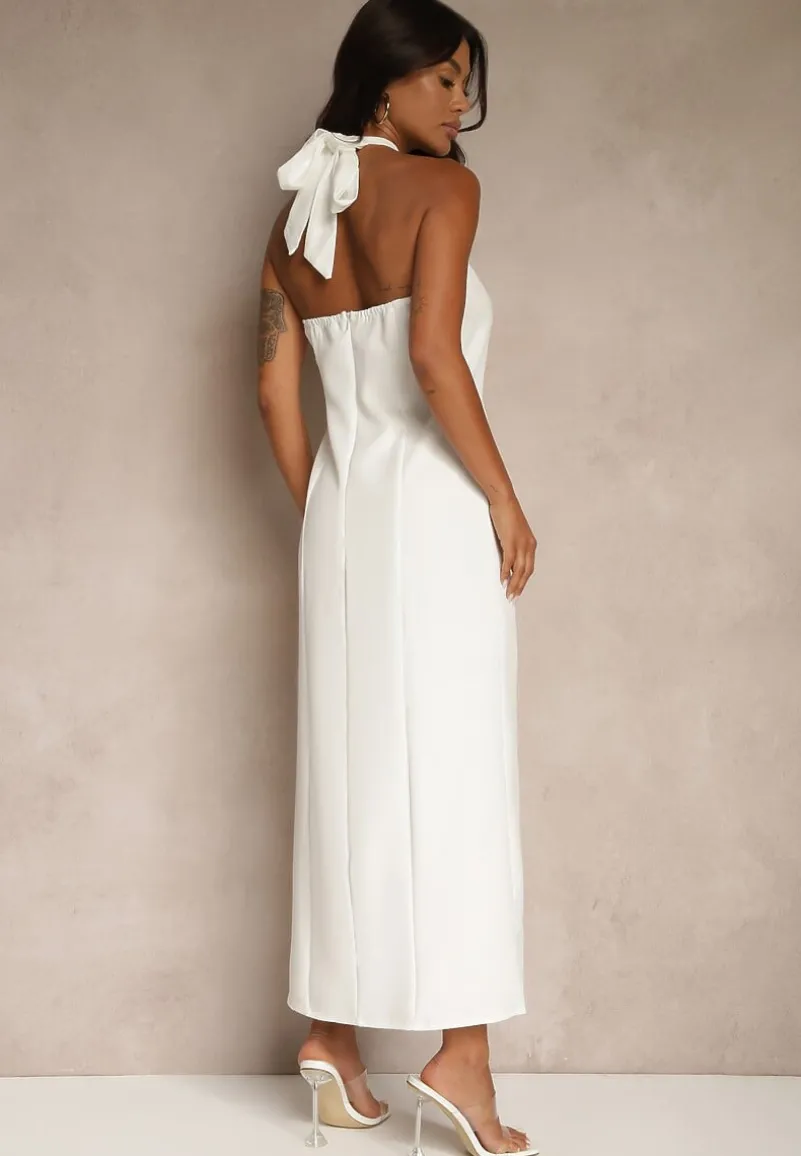 Biała Sukienka z Wiskozą z Dekoltem Halter i Ozdobną Broszką Naliannae