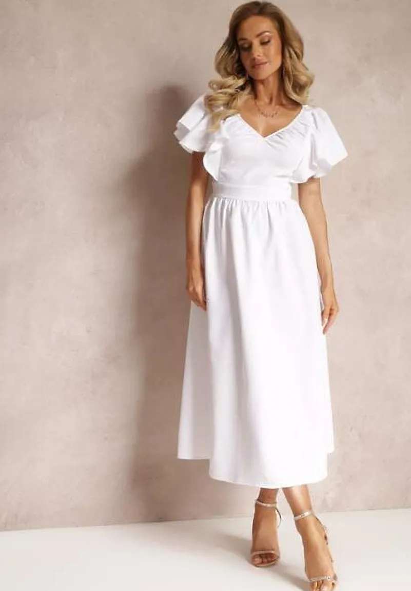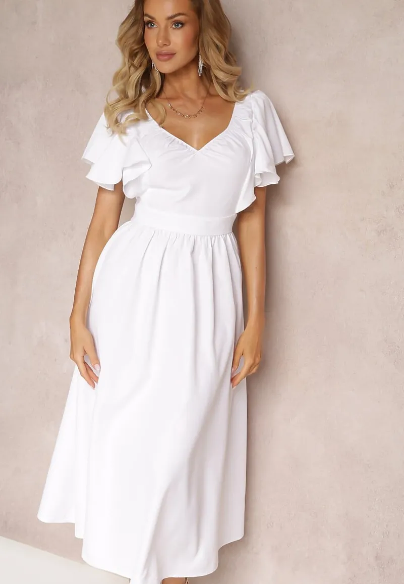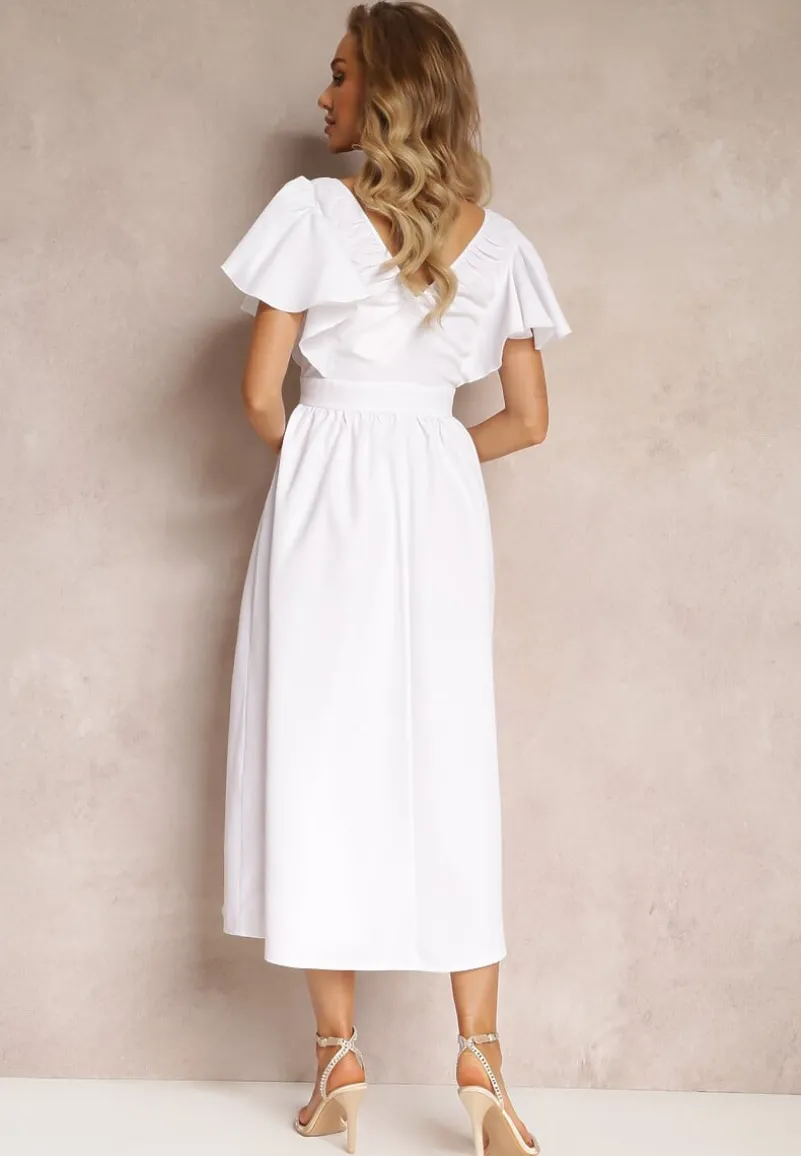 Biała Taliowana Sukienka Maxi z Falbanami Giftis