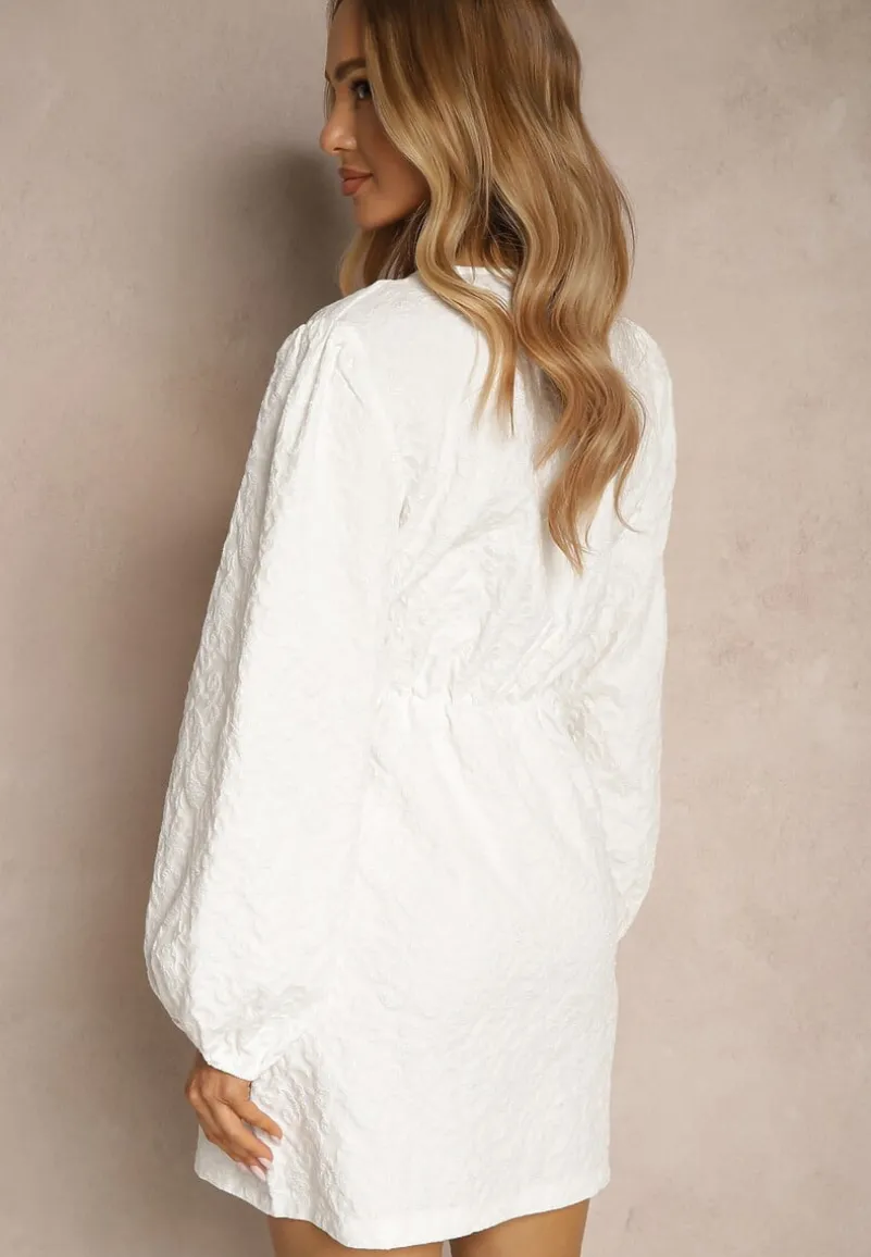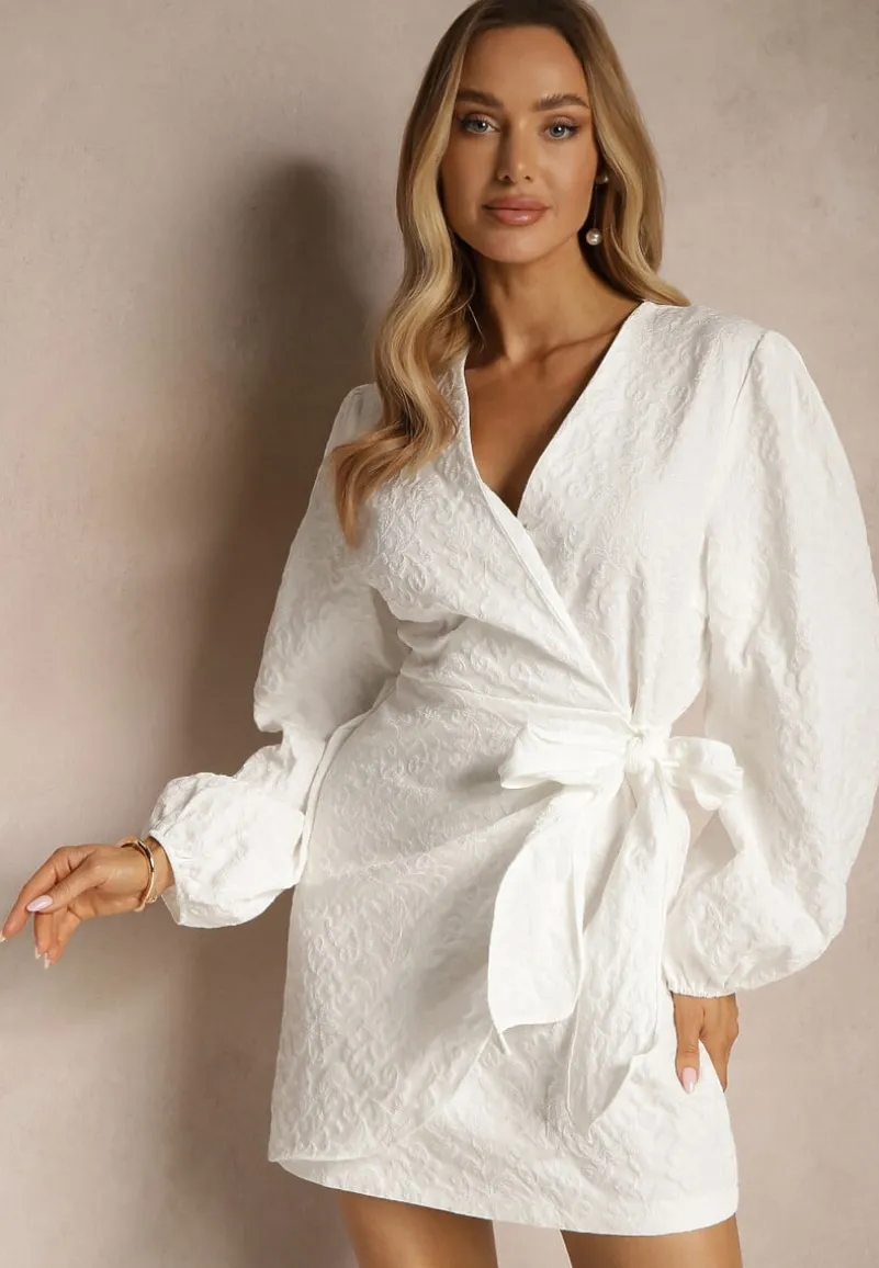 Biała Taliowana Sukienka o Kopertowym Fasonie Fadasse